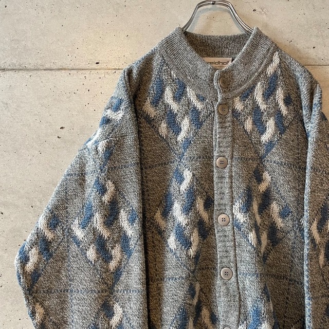 90年代らしい空気感が色濃く残る、総柄ニットカーディガン。 深みのあるグリーンをベースに、幾何学調の柄を全体に落とし込んだ一着。 単色コーデに羽織るだけで雰囲気が完成する、主役級アイテムです。 柔らかなニット素材で、 シャツやロンTの上からも着やすく、秋冬はもちろん春先まで活躍。 90s古着、レトロ、アート系、スタイルが好きな方に特におすすめです。 表記サイズ:サイズタグが切り取られているため不明 実寸サイズ 画像をご参考ください