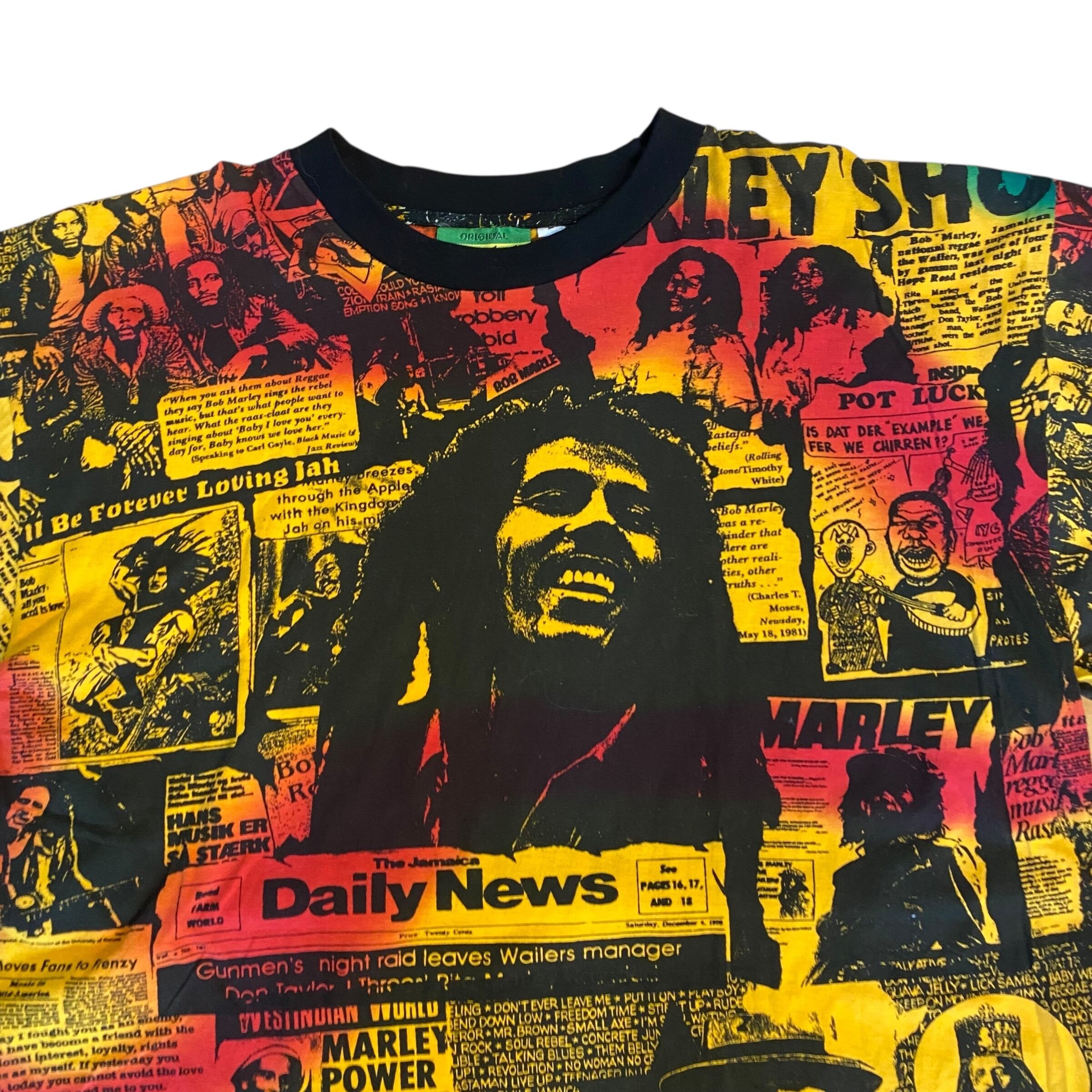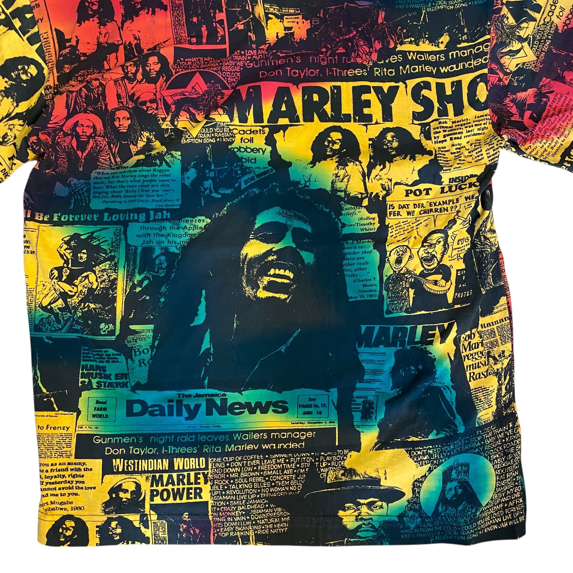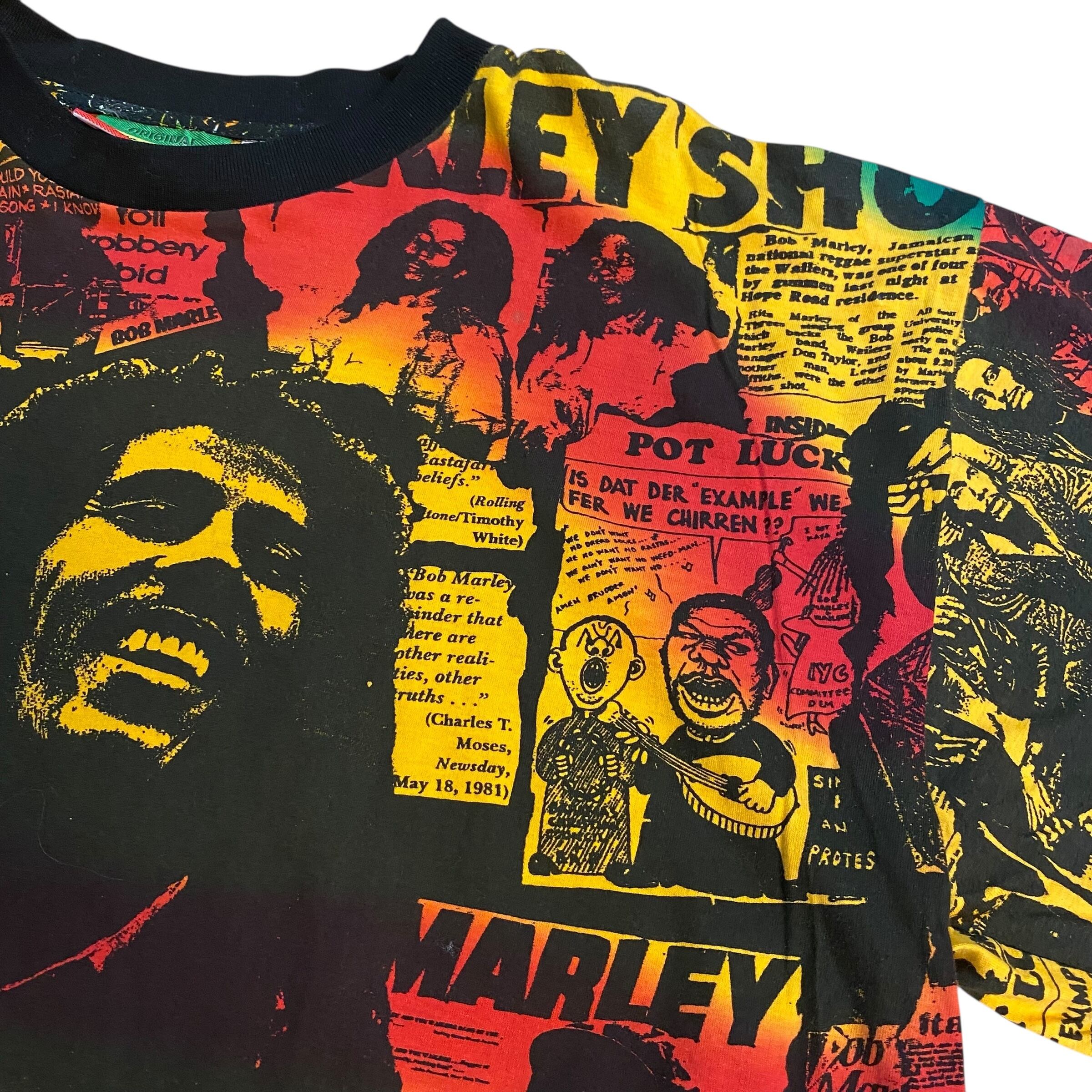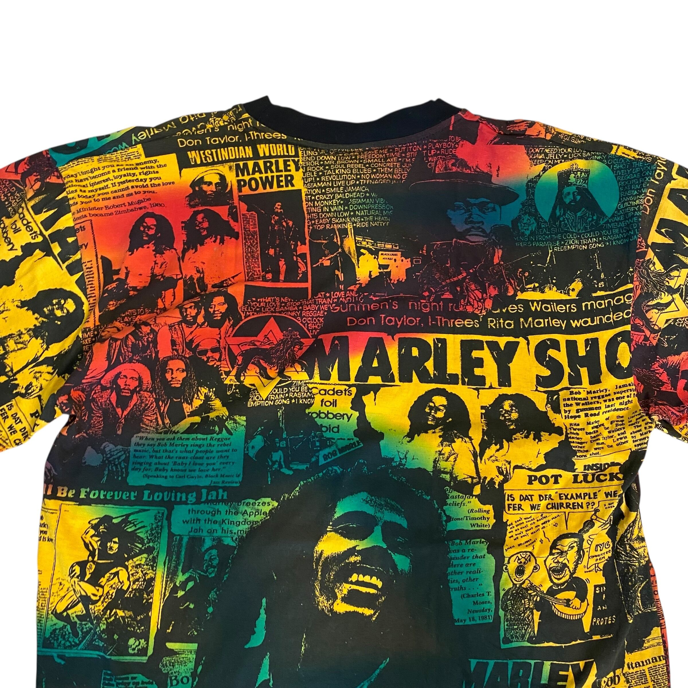 レゲエ界の重鎮ボブマーリーの総柄Tシャツです。ボブマーリーのTシャツは良く見かけますが、このアイテムは柄、プリント共に一級品