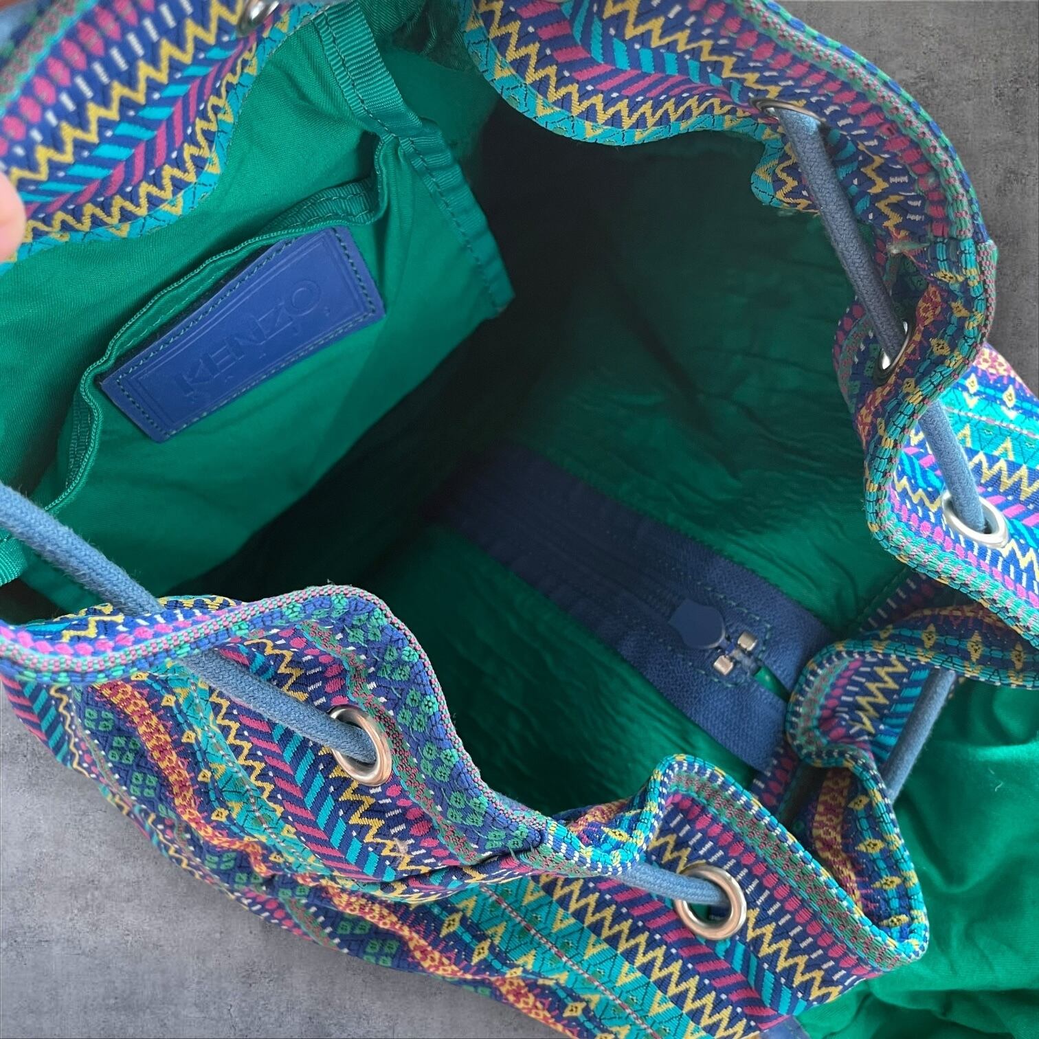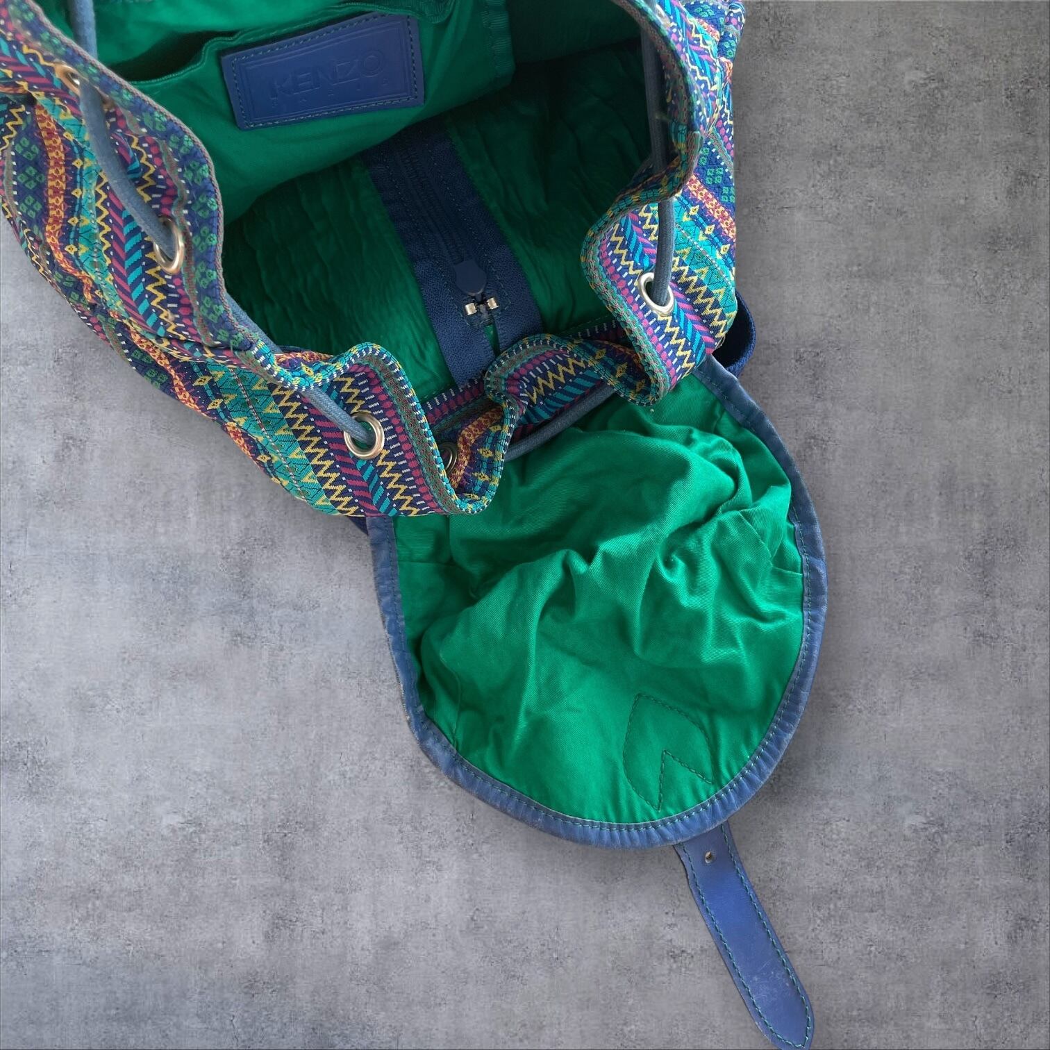 内側もグリーンのライナーで抜かりないデザイン性。KENZOタグがさり気なく映えます。
