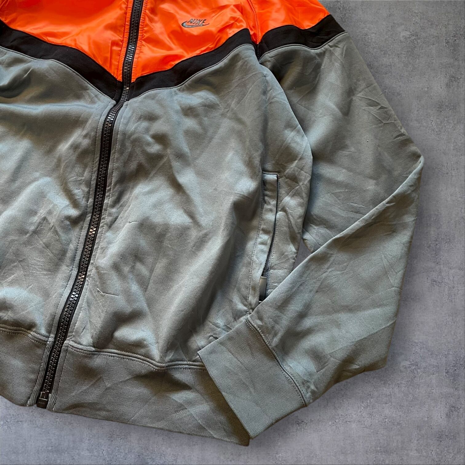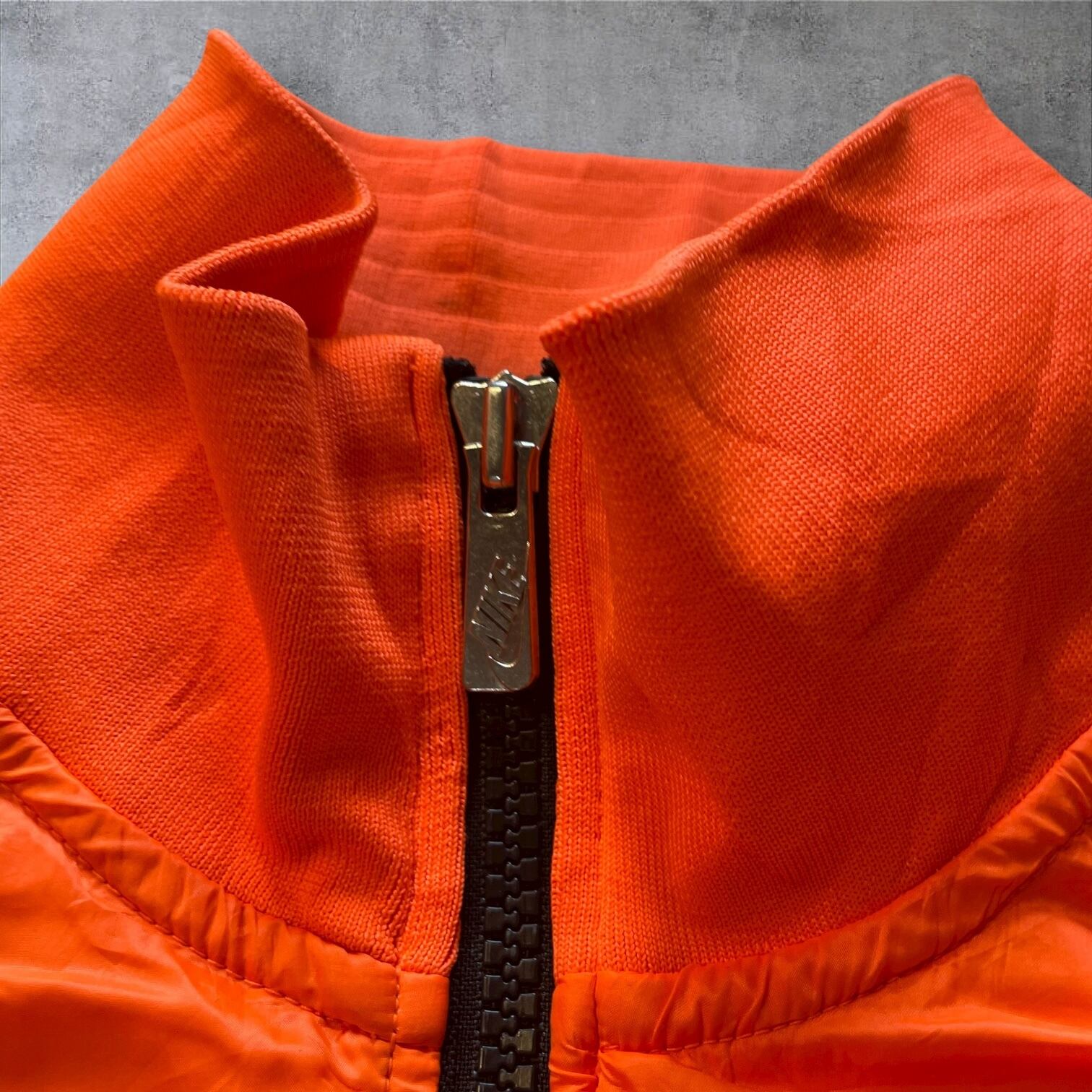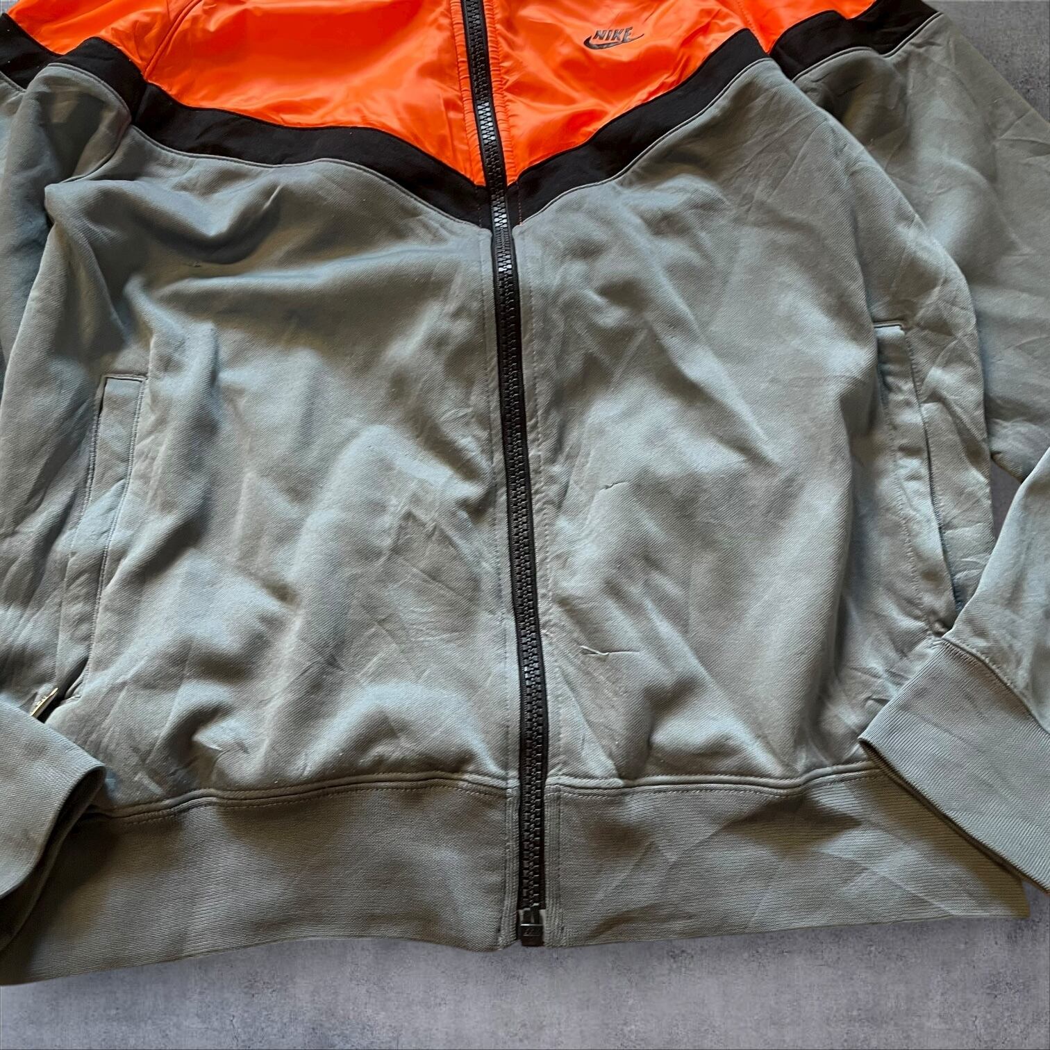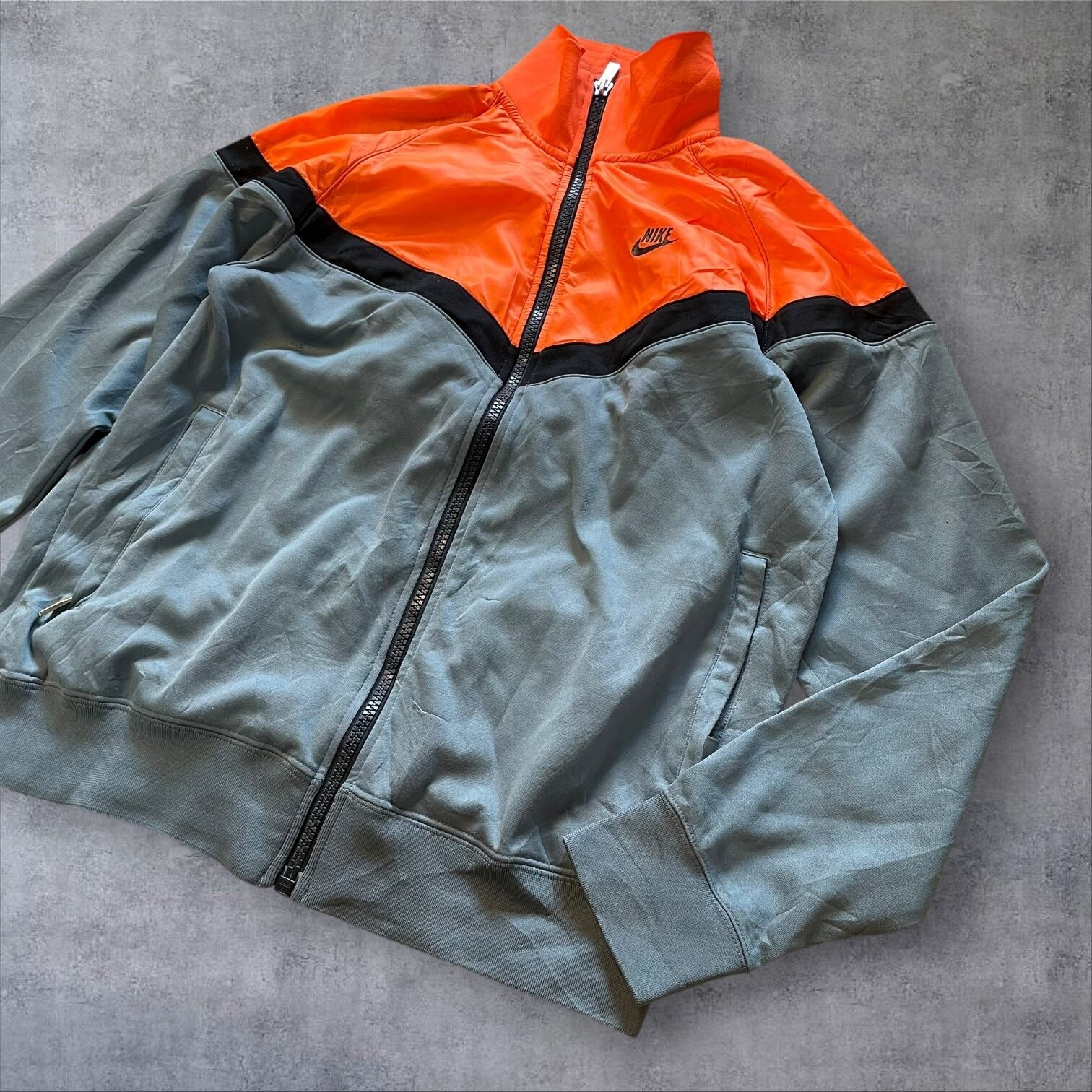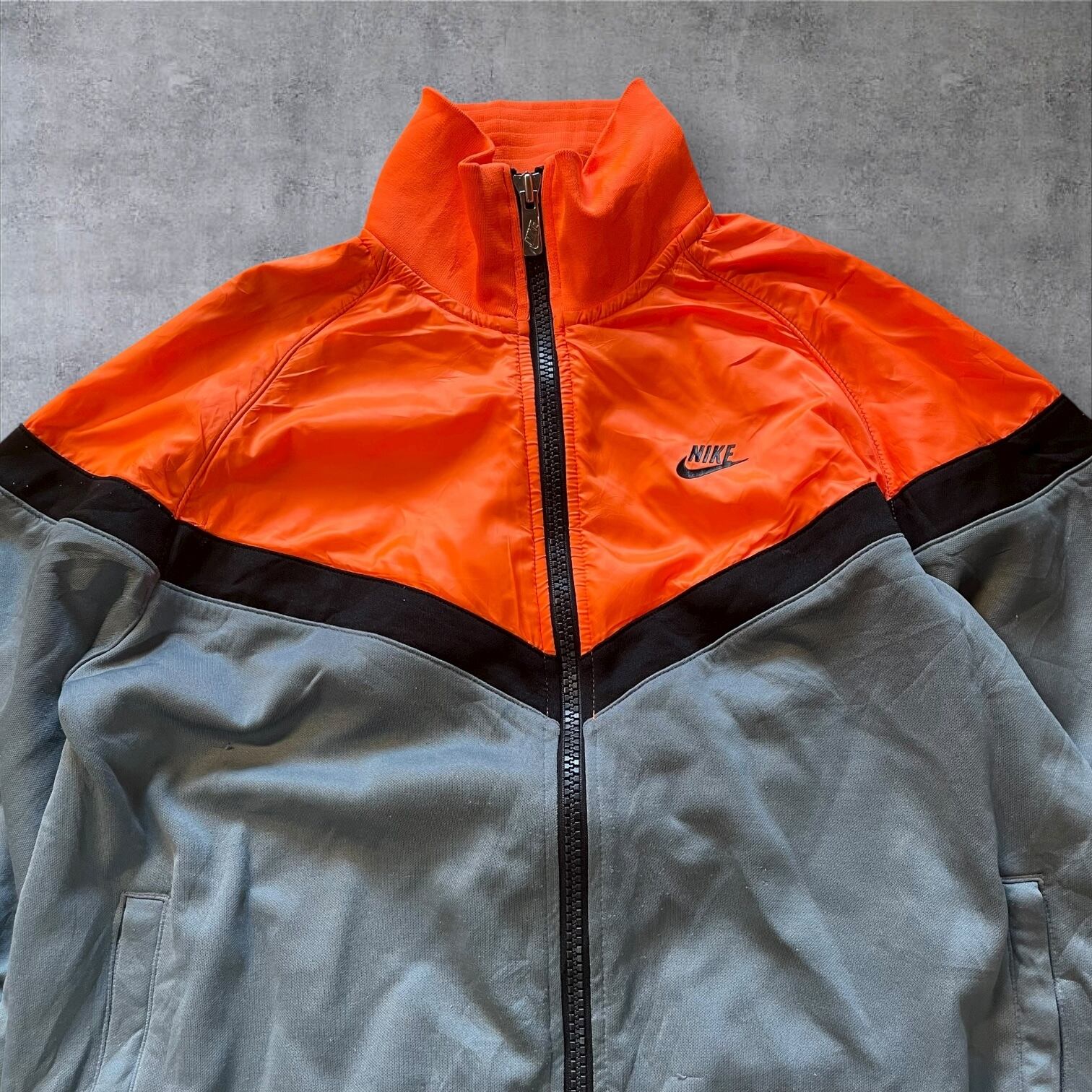 NIKEのトラックジャケット、ネオンオレンジ×くすみグレーの配色がまさに当時のムード。