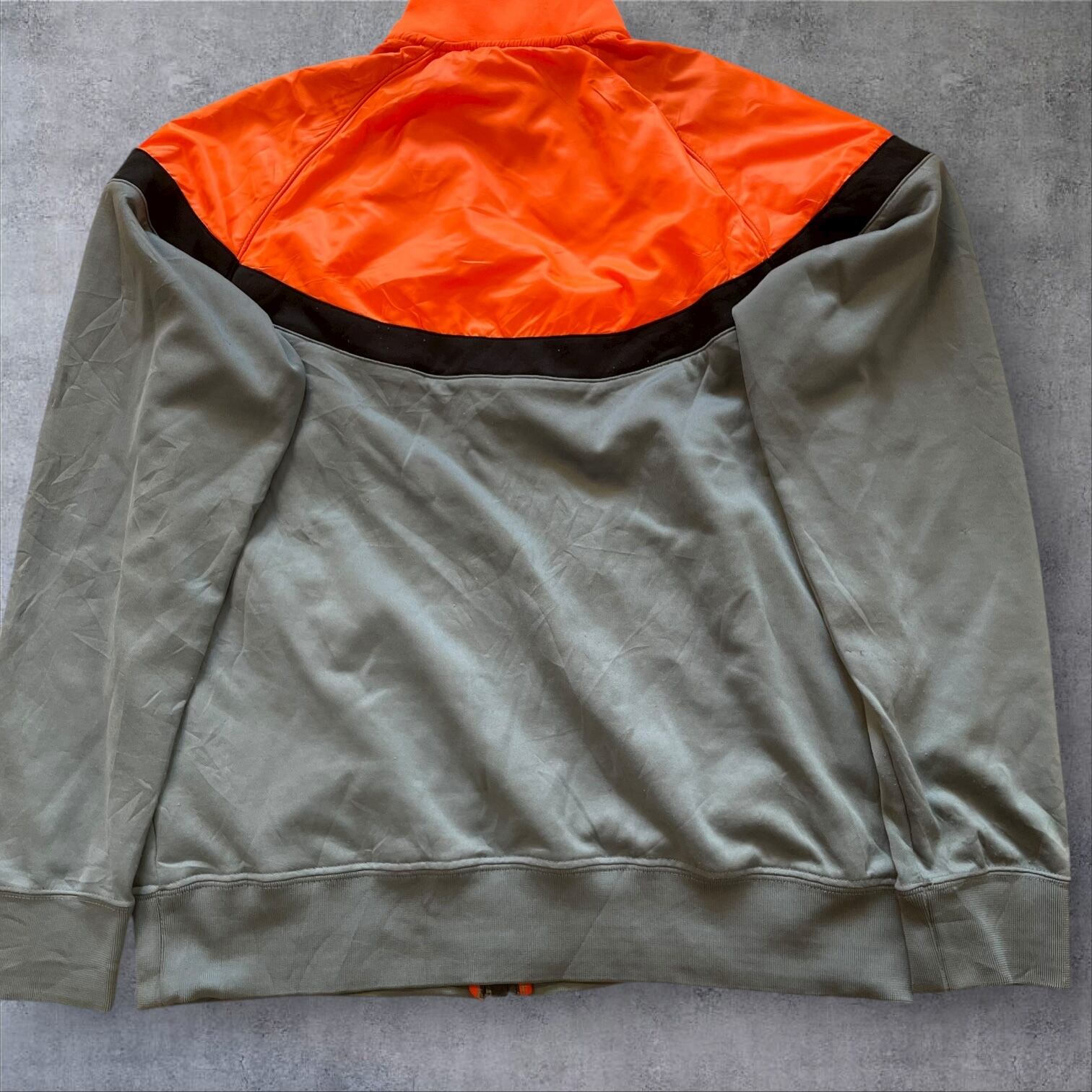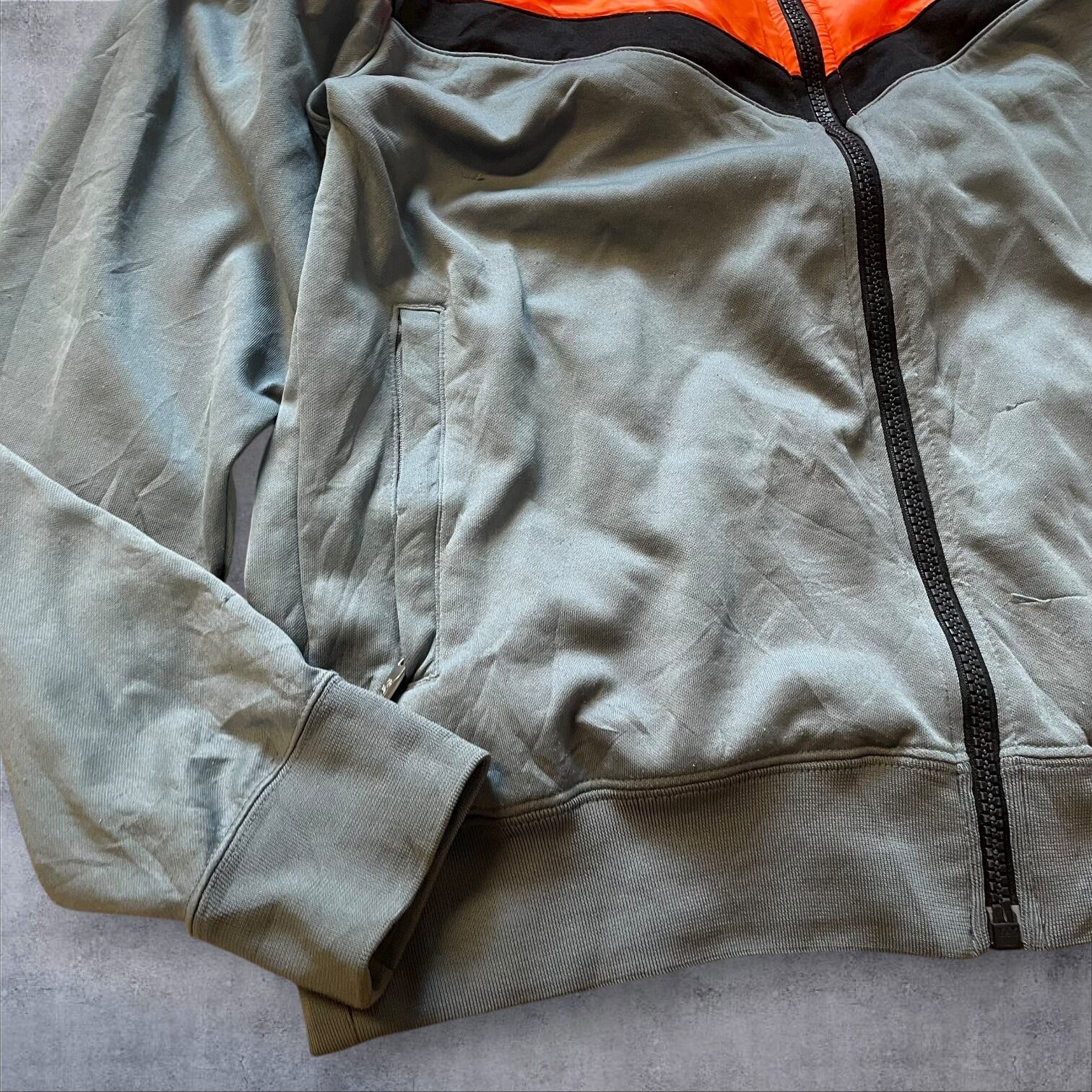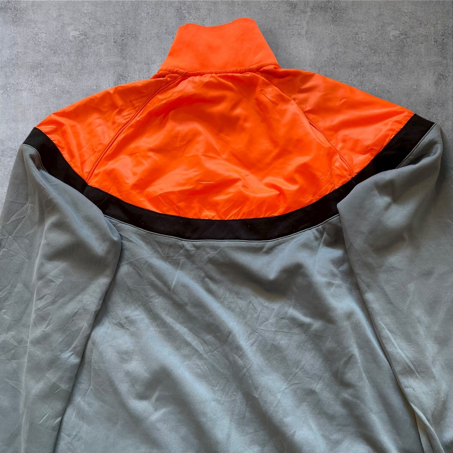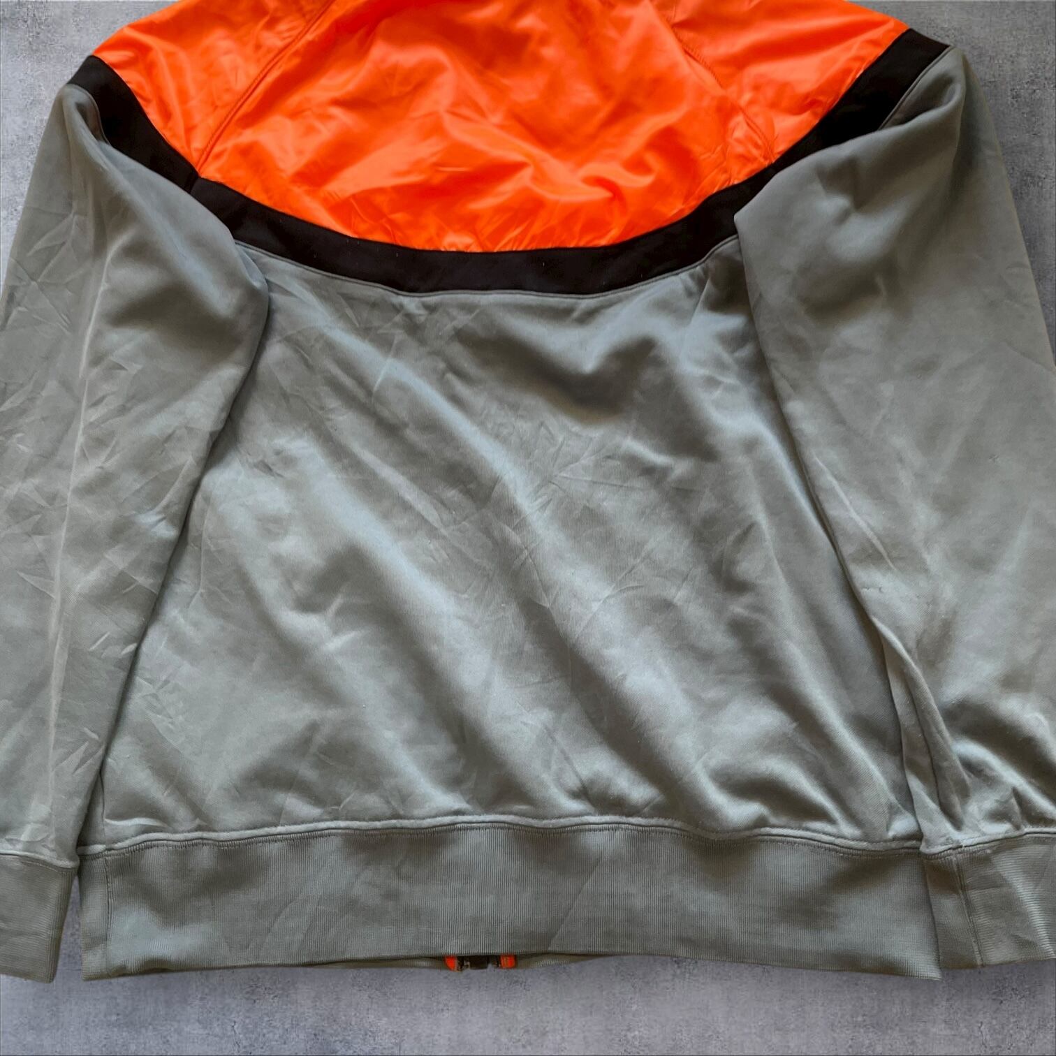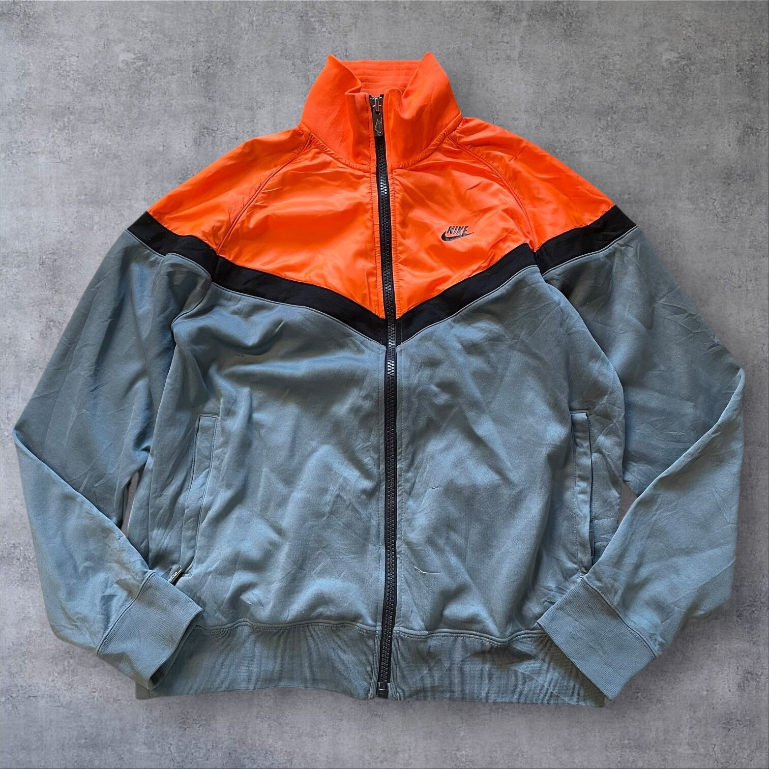 NIKEのトラックジャケット、ネオンオレンジ×くすみグレーの配色がまさに当時のムード。