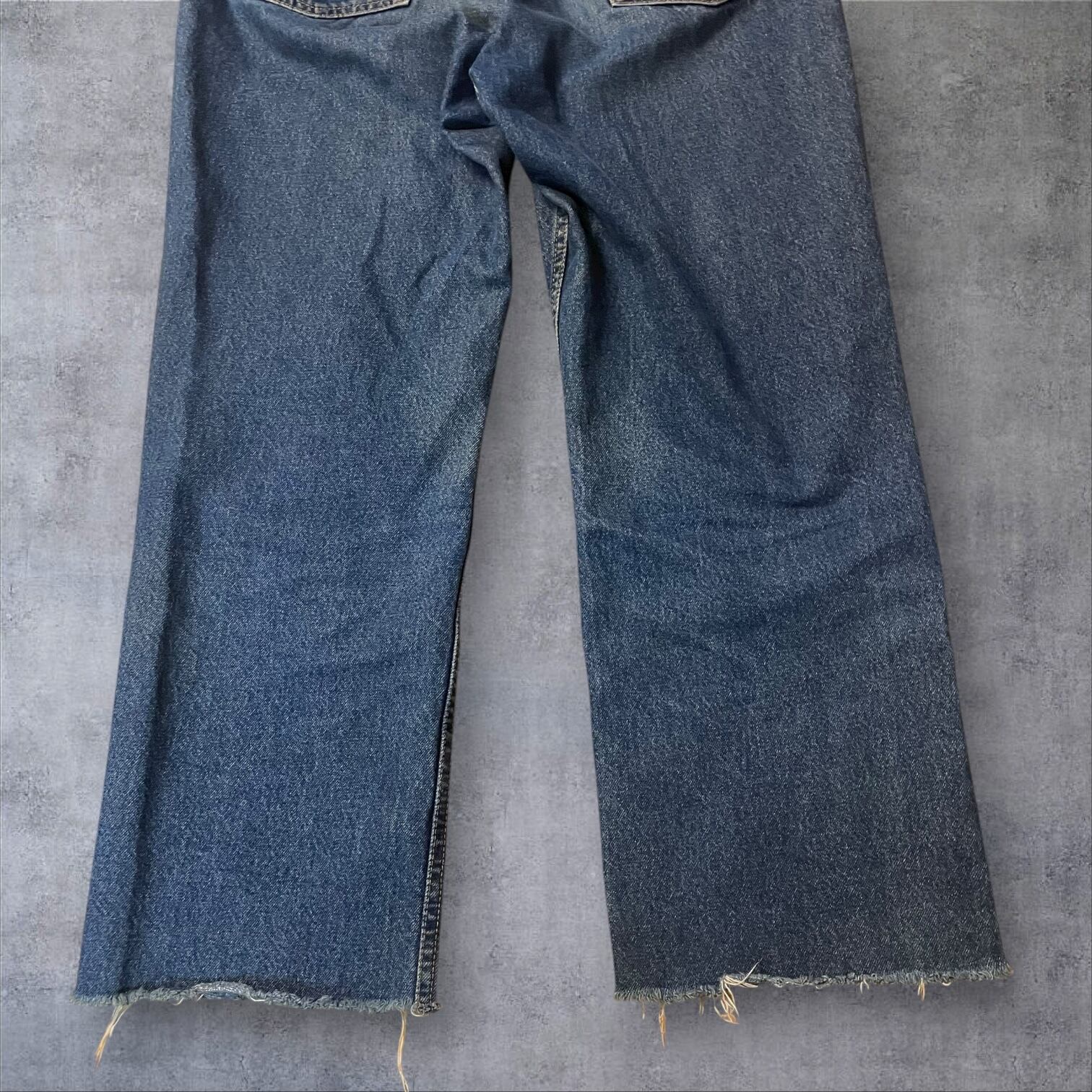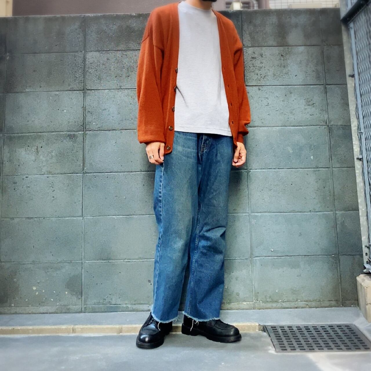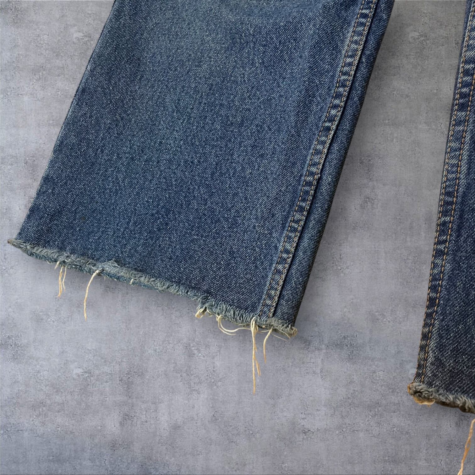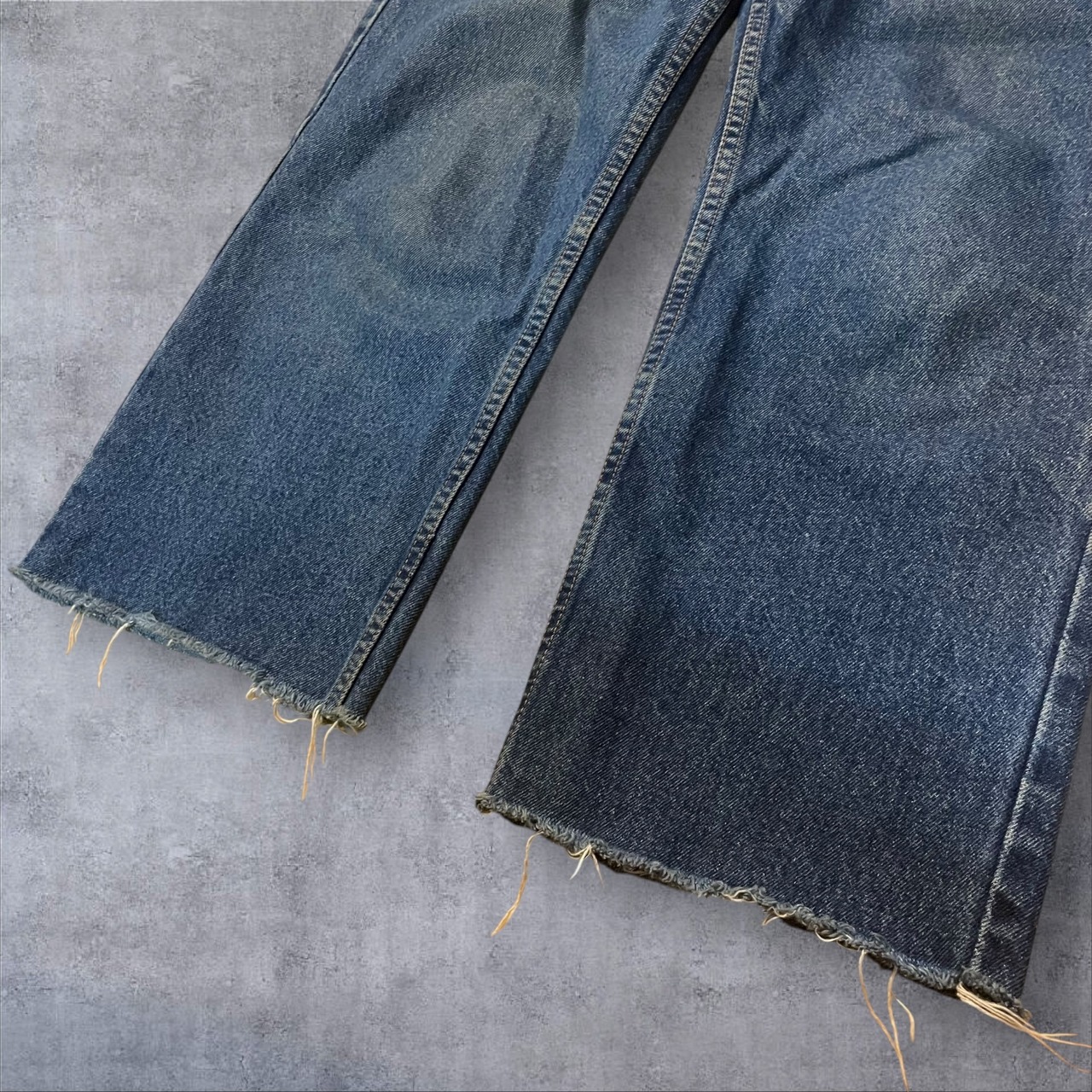 ヴィンテージ好きにはたまらない雰囲気抜群の一本。程よい色落ちとヒゲの表情が90sスタイルを彷彿とさせ、カットオフ仕様の裾がラフでこなれた印象を演出します。