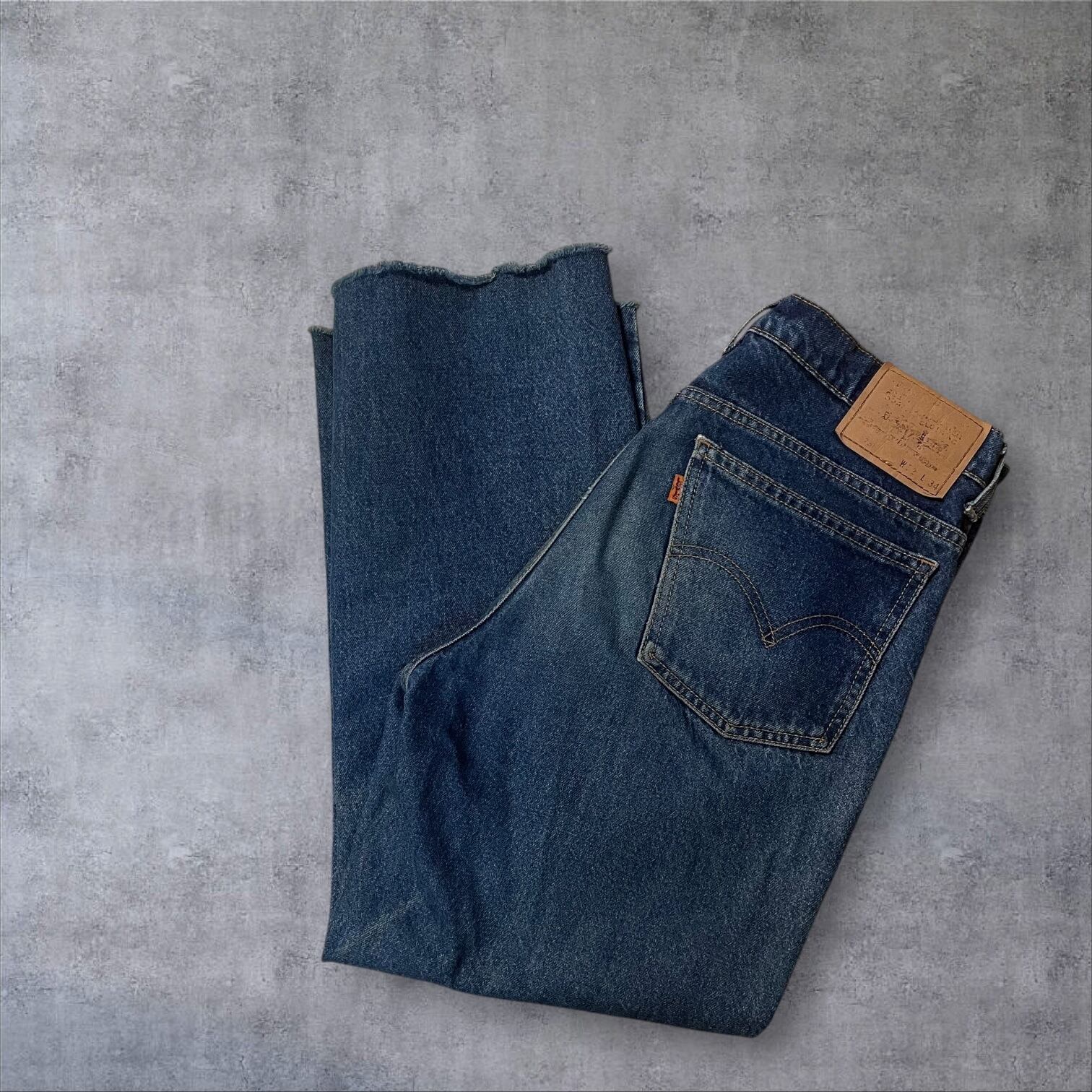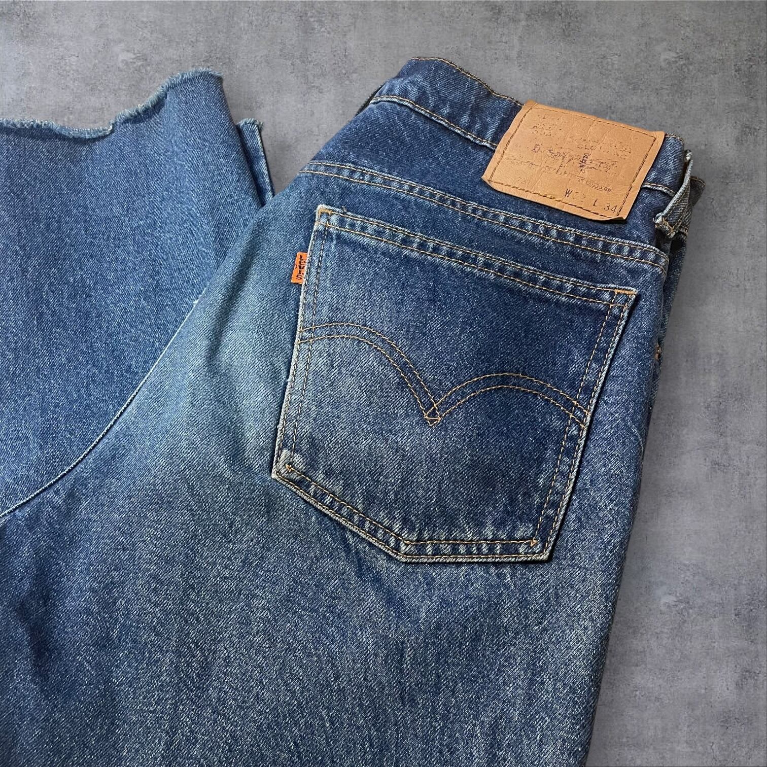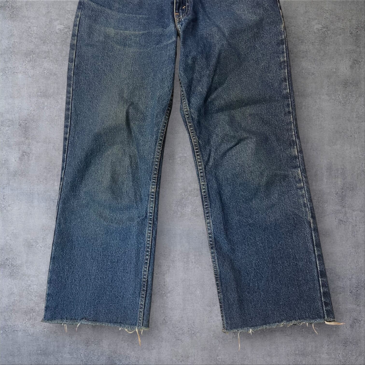 ヴィンテージ好きにはたまらない雰囲気抜群の一本。程よい色落ちとヒゲの表情が90sスタイルを彷彿とさせ、カットオフ仕様の裾がラフでこなれた印象を演出します。