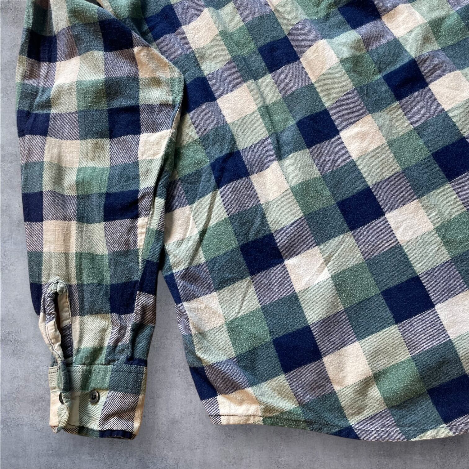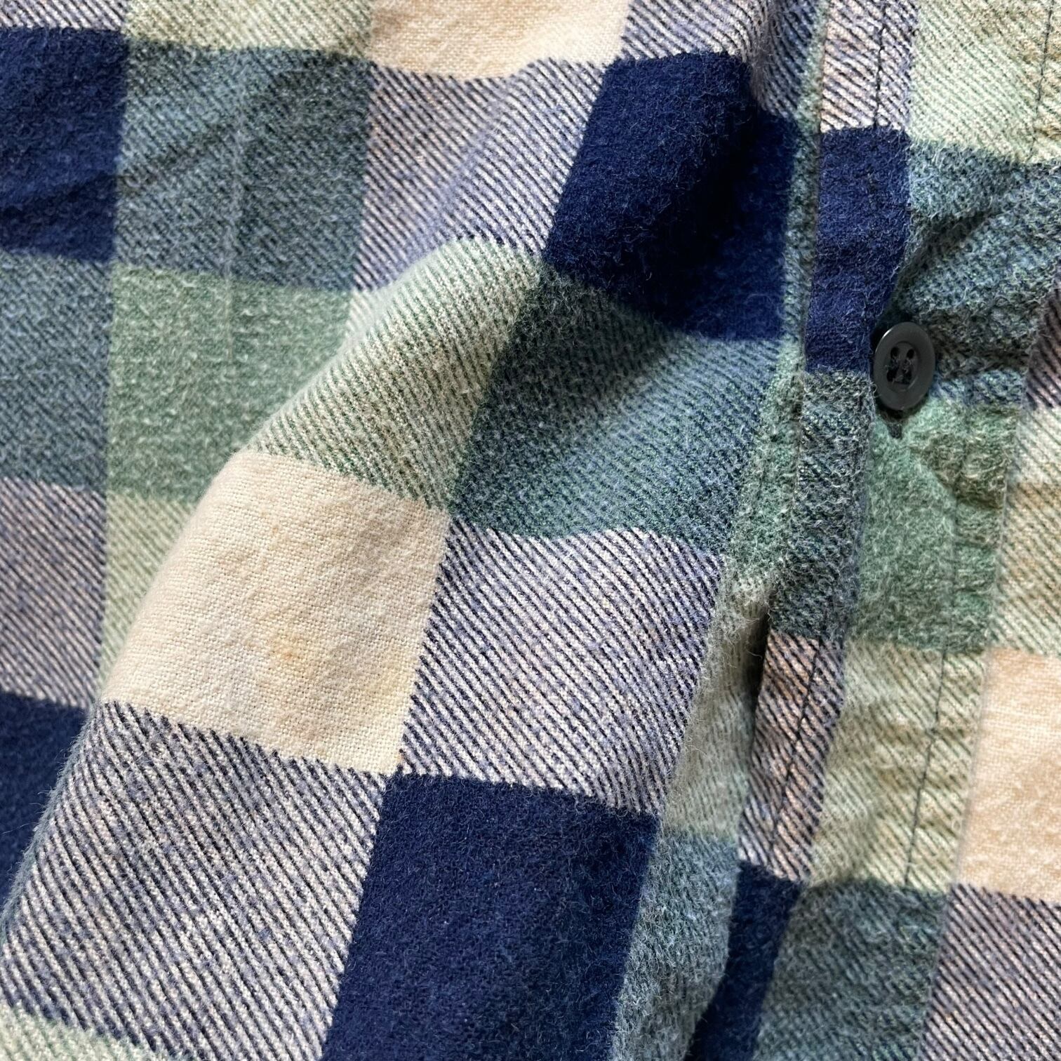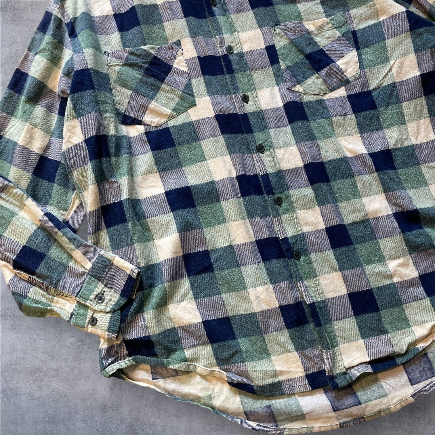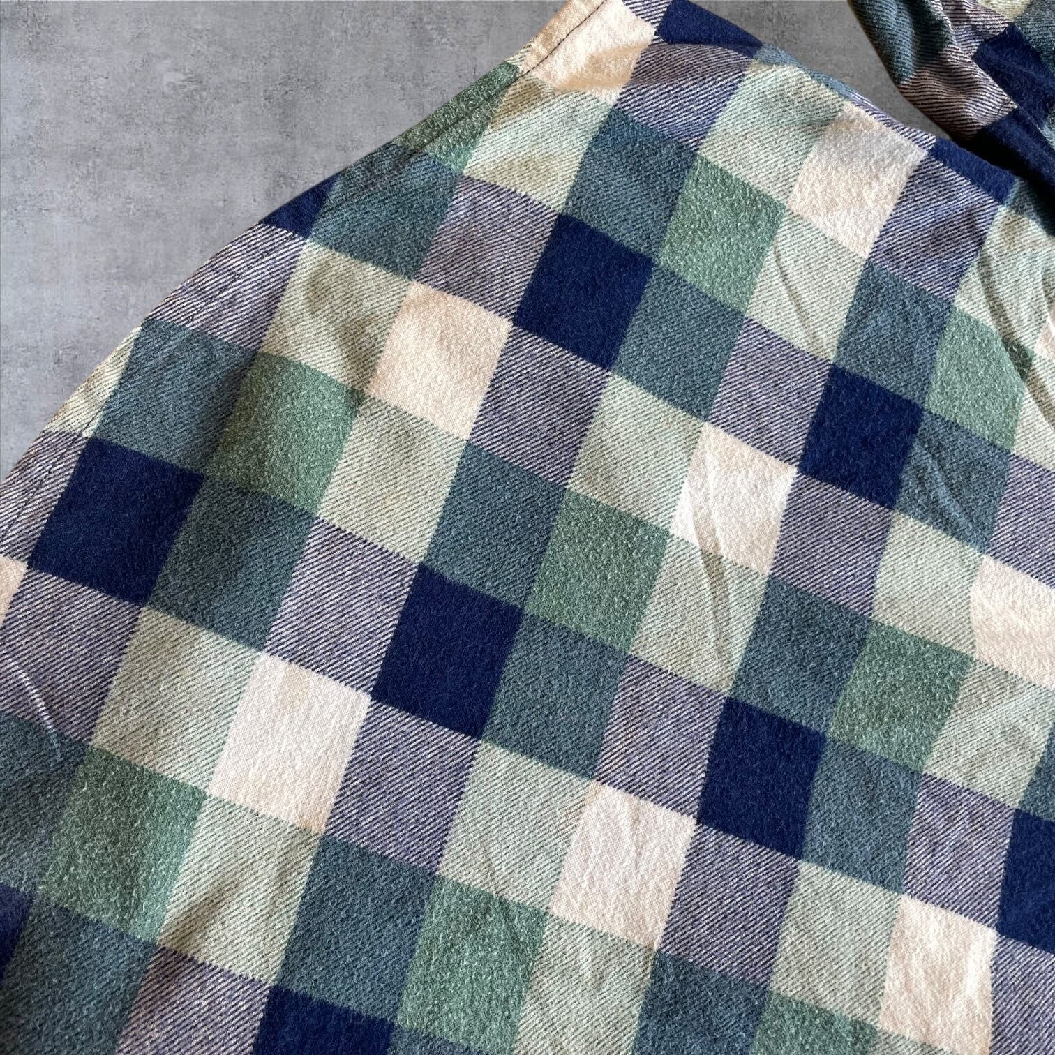 ネイビー×グリーン×クリームの落ち着いた配色で、古着らしい雰囲気がしっかり出る一着。