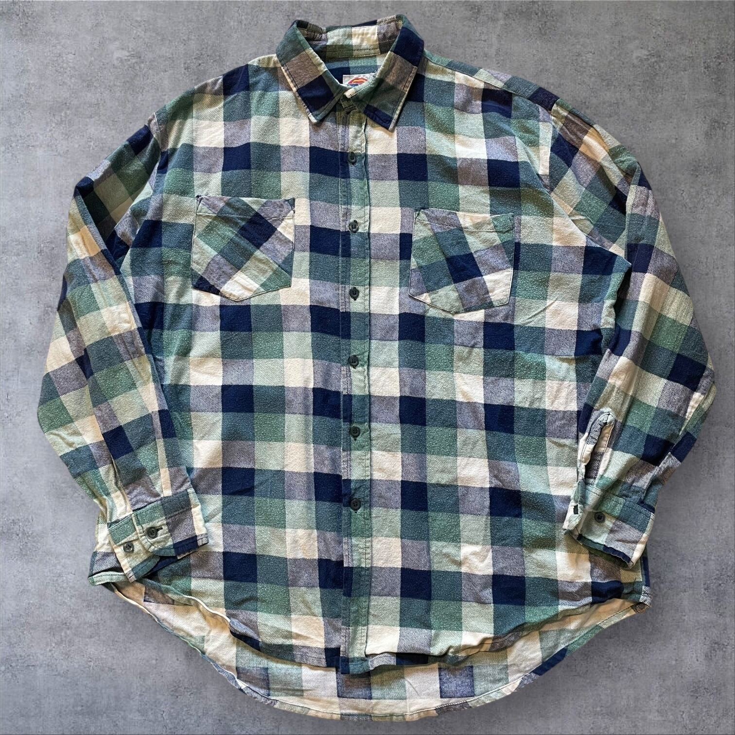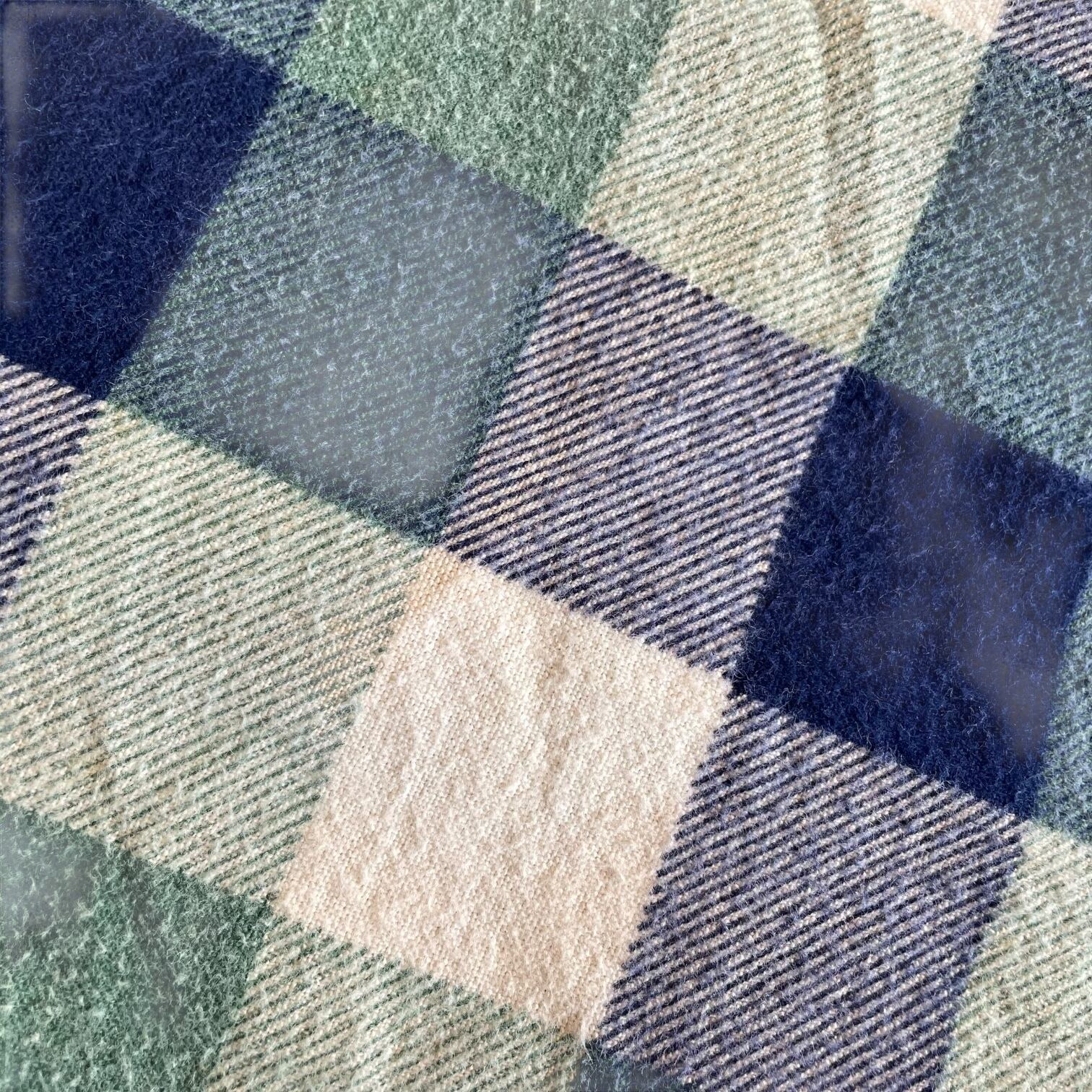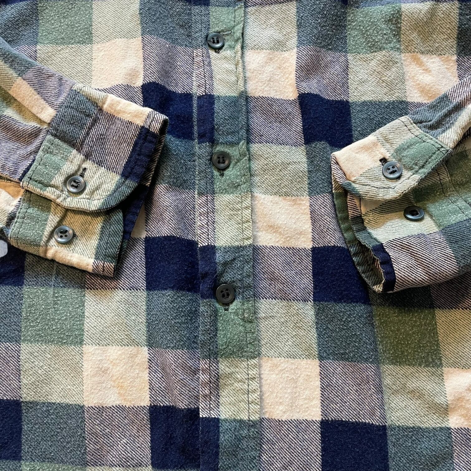 ネイビー×グリーン×クリームの落ち着いた配色で、古着らしい雰囲気がしっかり出る一着。