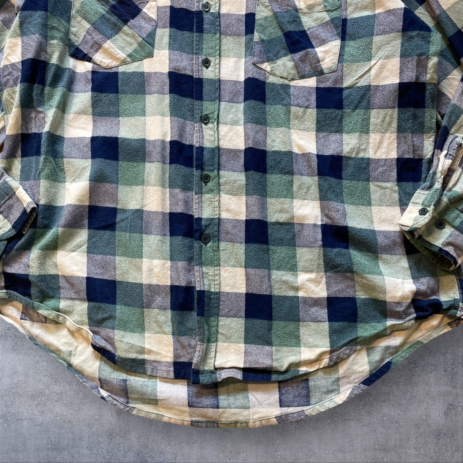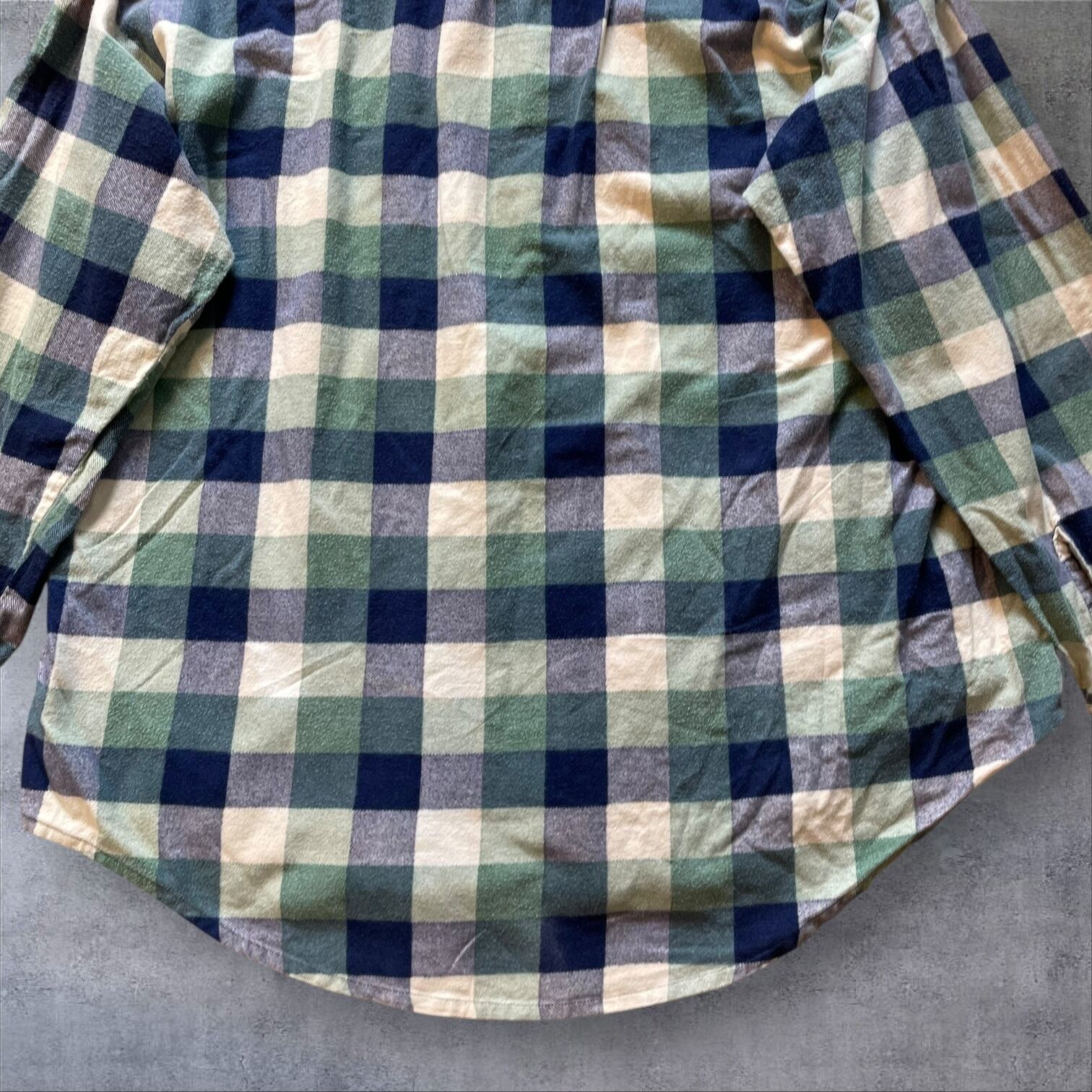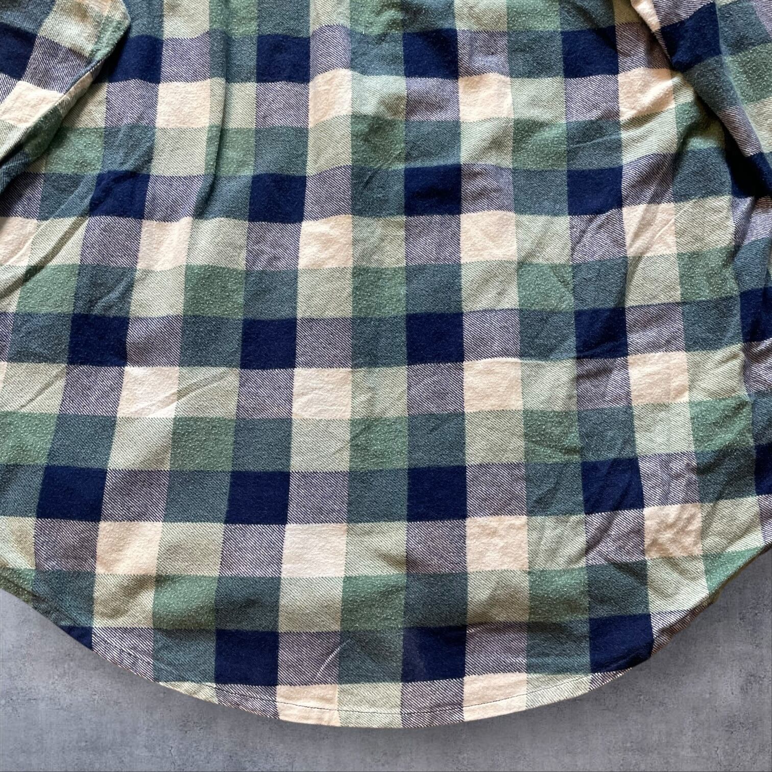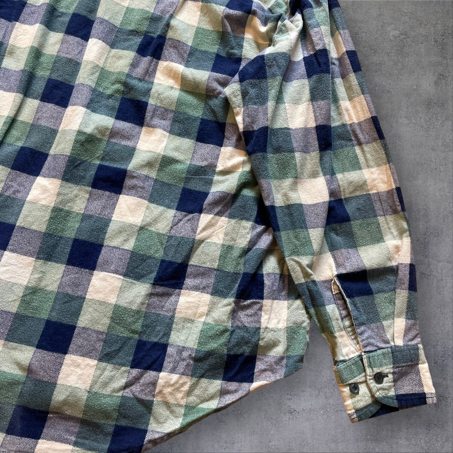 ネイビー×グリーン×クリームの落ち着いた配色で、古着らしい雰囲気がしっかり出る一着。