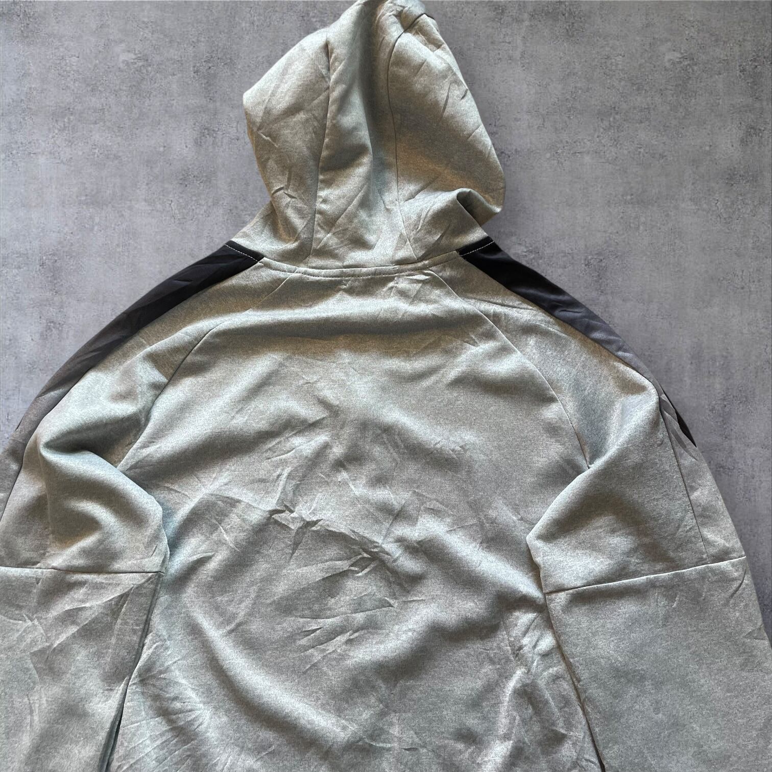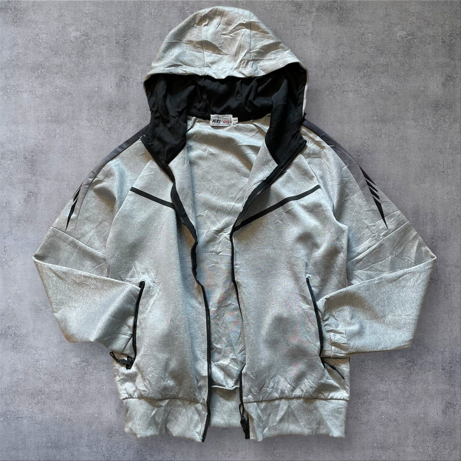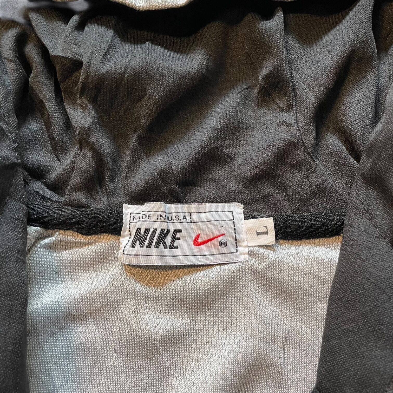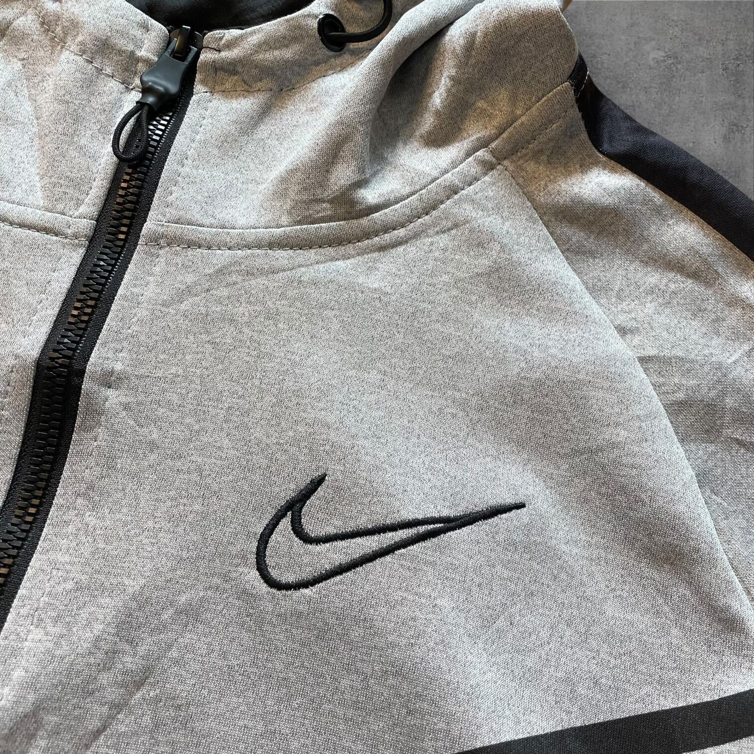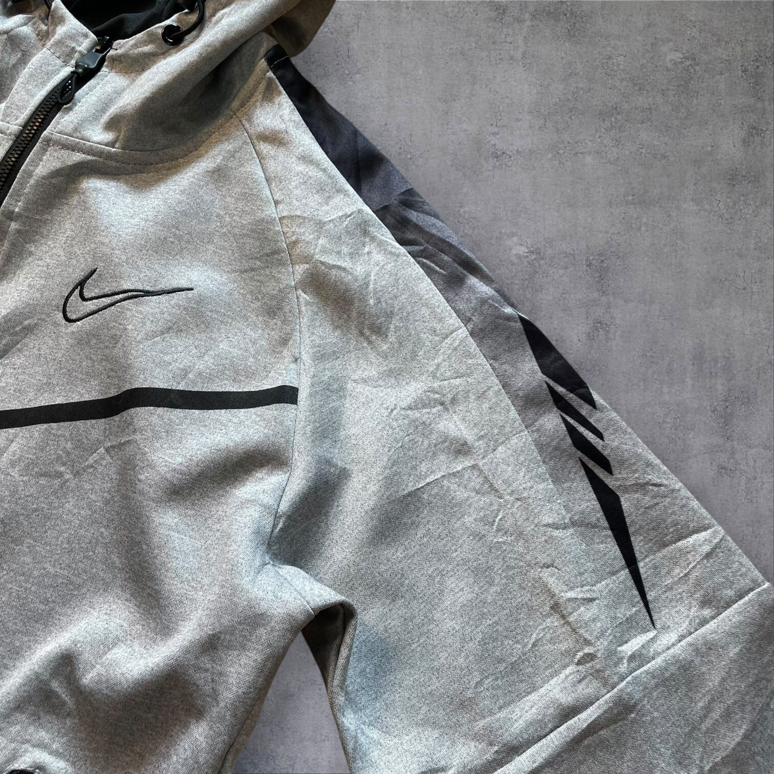 アーカイブ価値の高い、MADE IN U.S.A.タグ付きのナイキフーディー。希少なグレーカラーにブラックのラインが効いた、テックとストリートを融合させた一枚です。