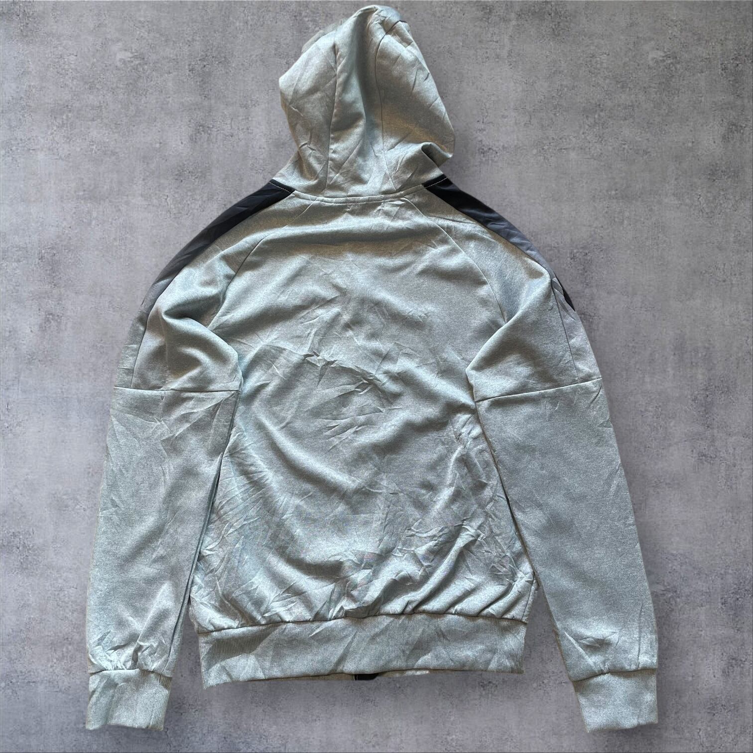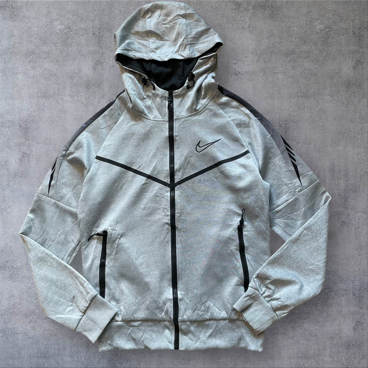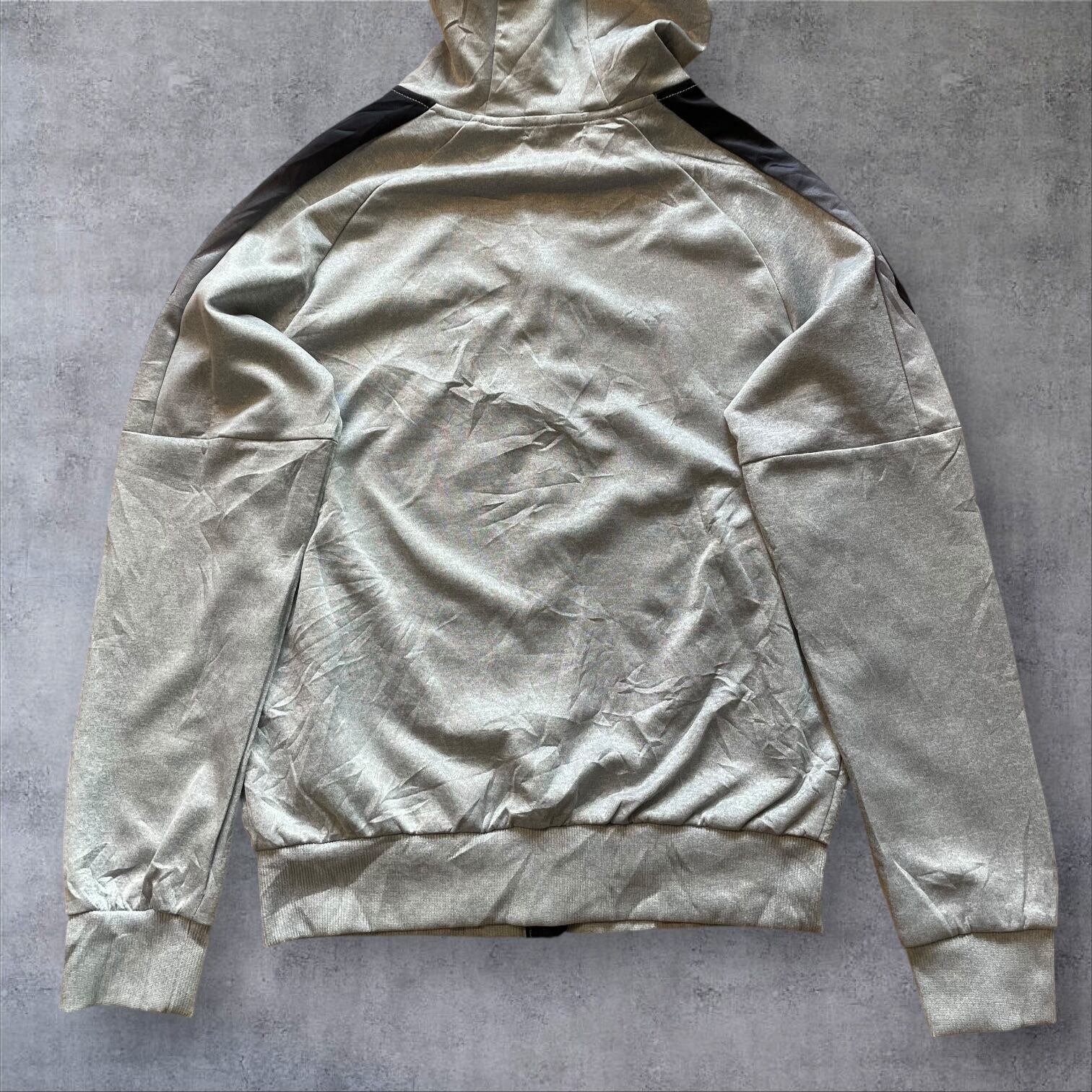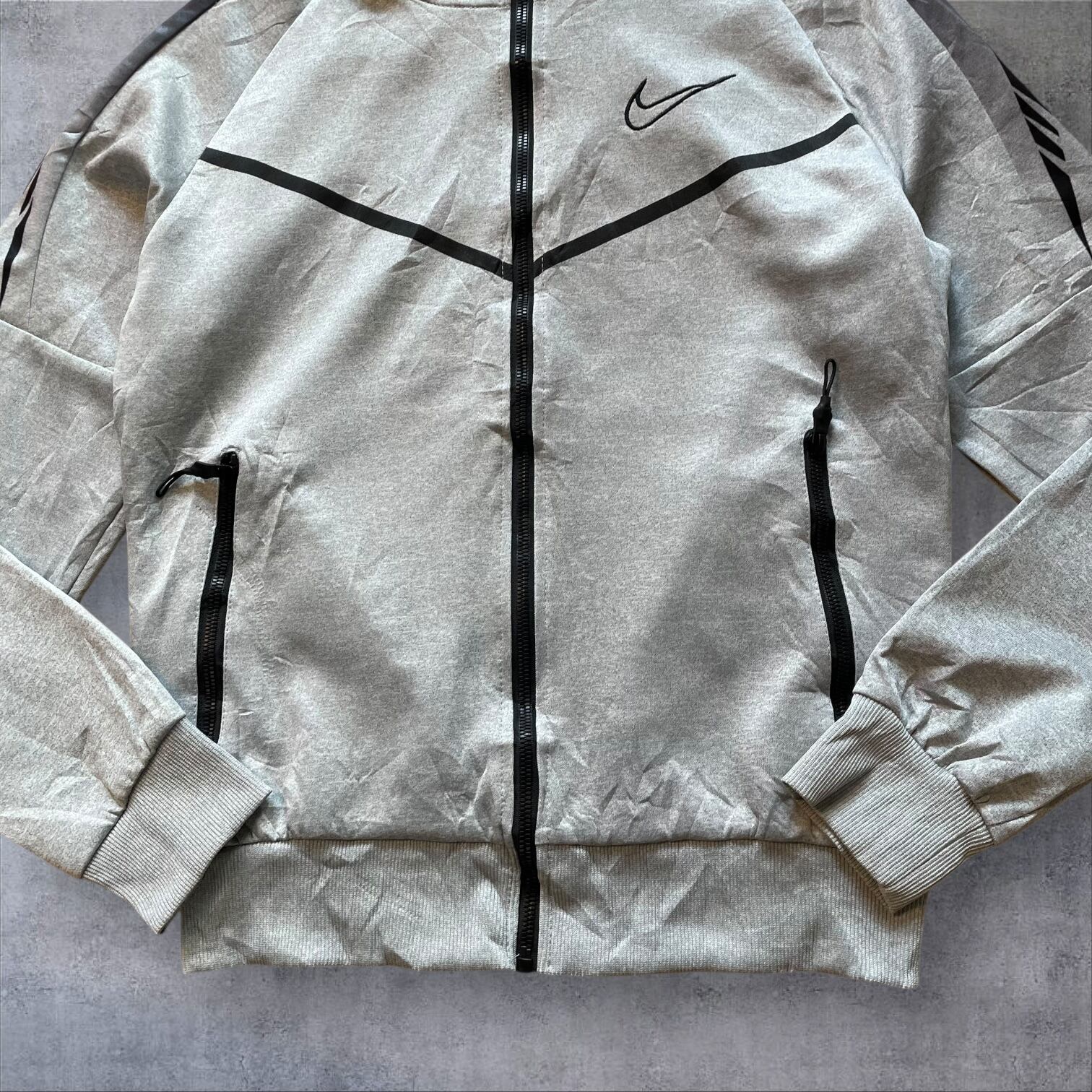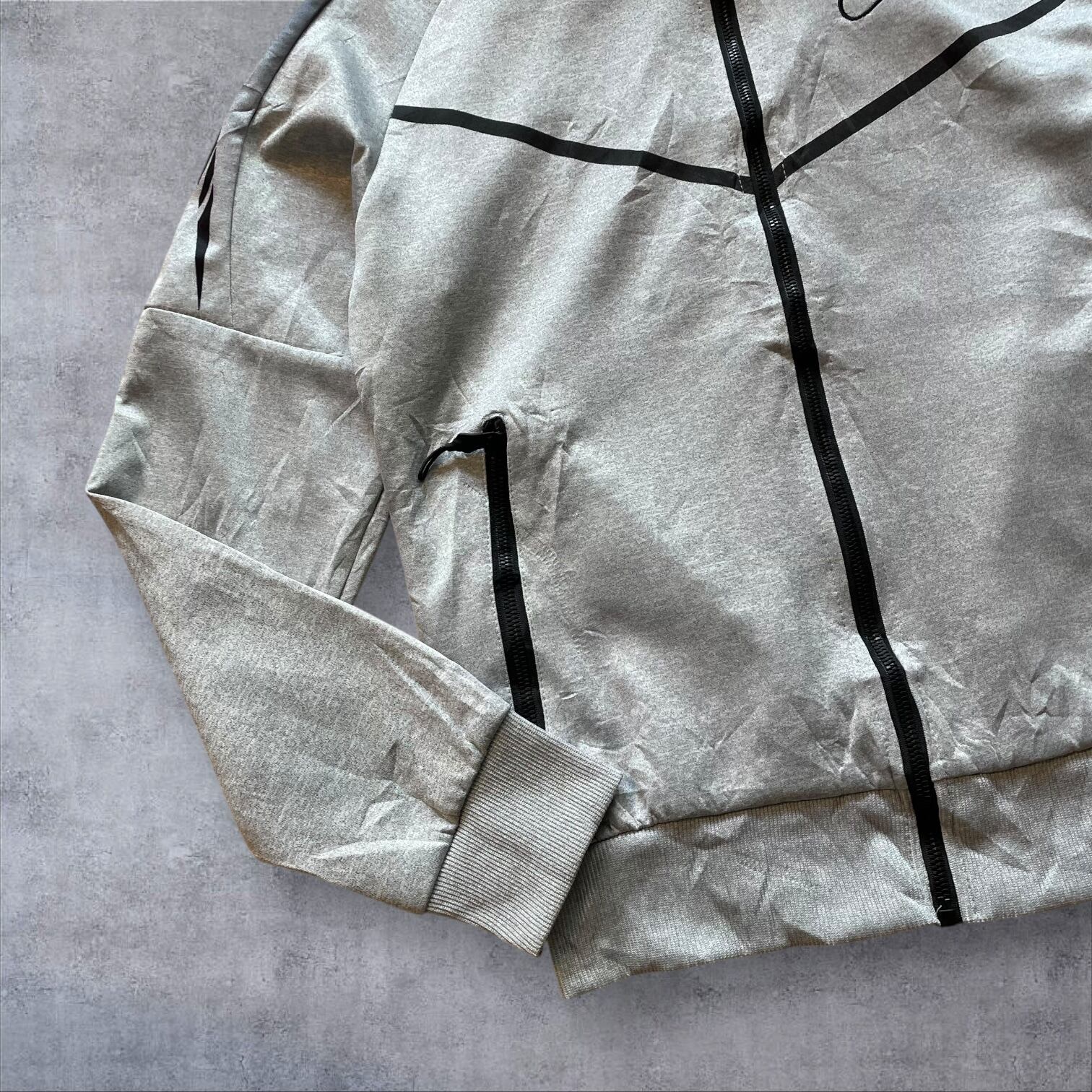アーカイブ価値の高い、MADE IN U.S.A.タグ付きのナイキフーディー。希少なグレーカラーにブラックのラインが効いた、テックとストリートを融合させた一枚です。