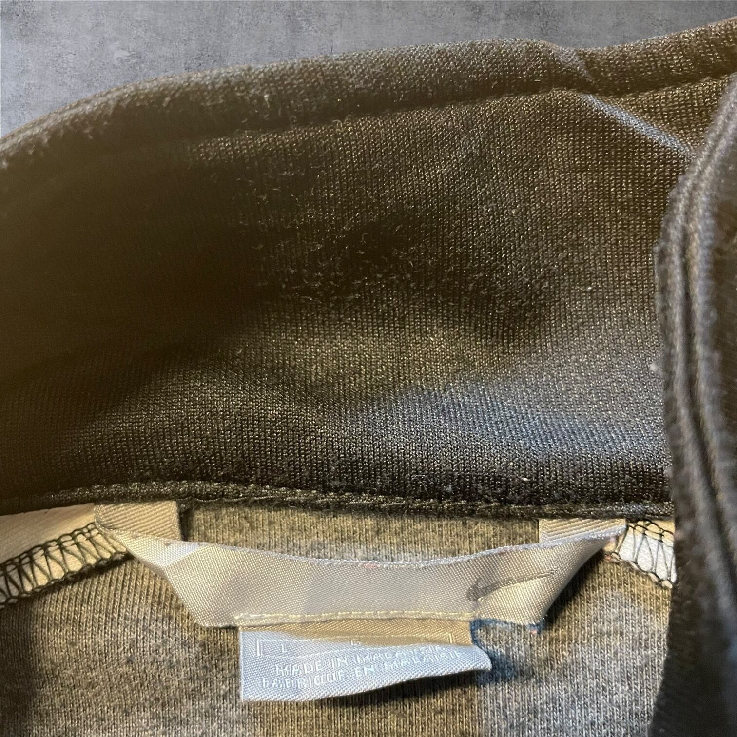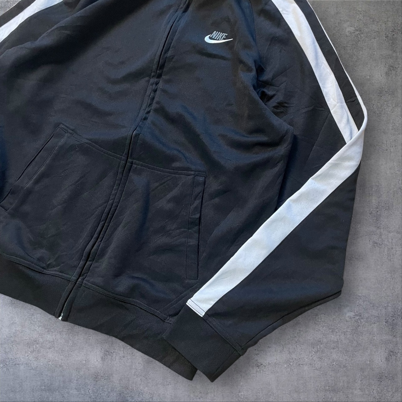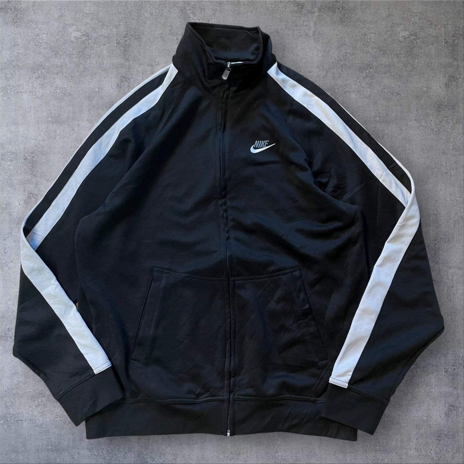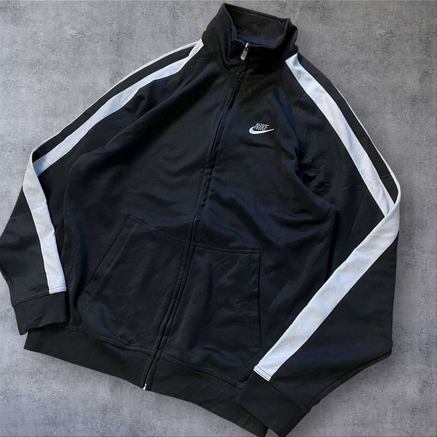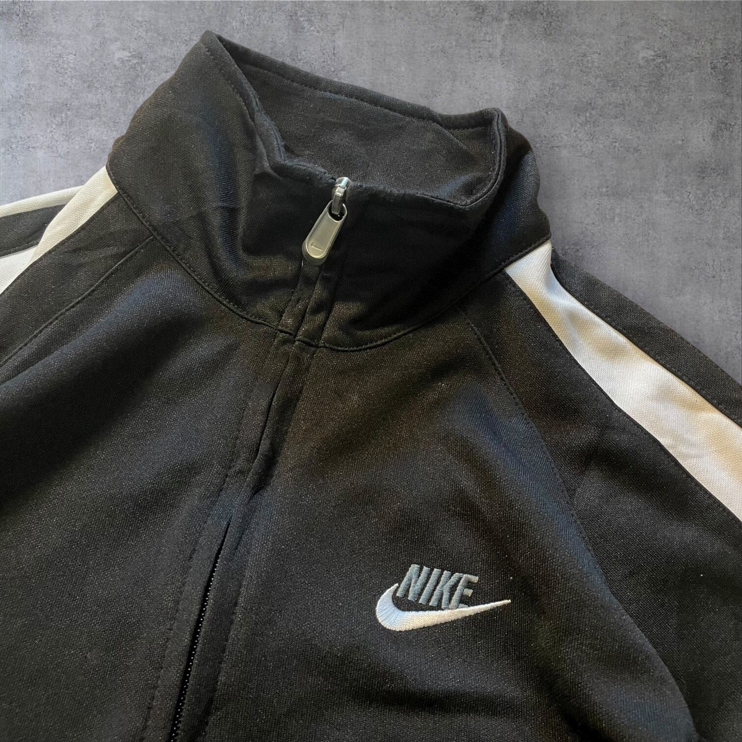 人気の高いホワイトライン×ブラックボディの配色で、存在感抜群。胸元のスウッシュロゴがワンポイントで映えます。レトロな雰囲気もあり、Y2K・90s・古着好きにもオススメ。