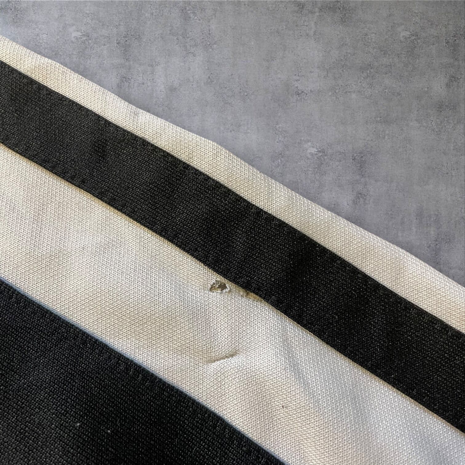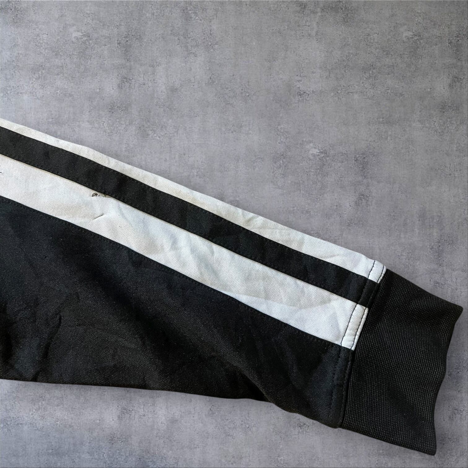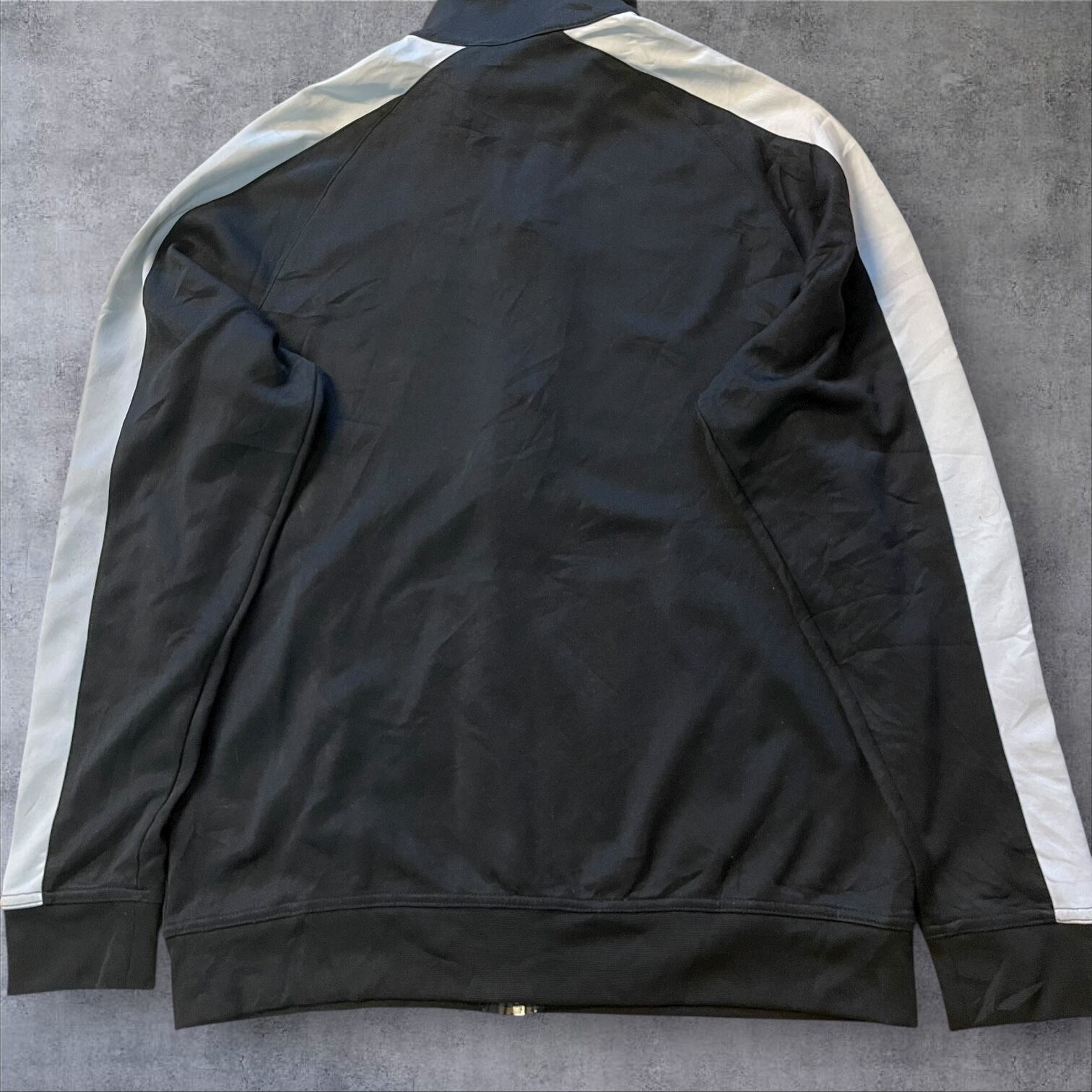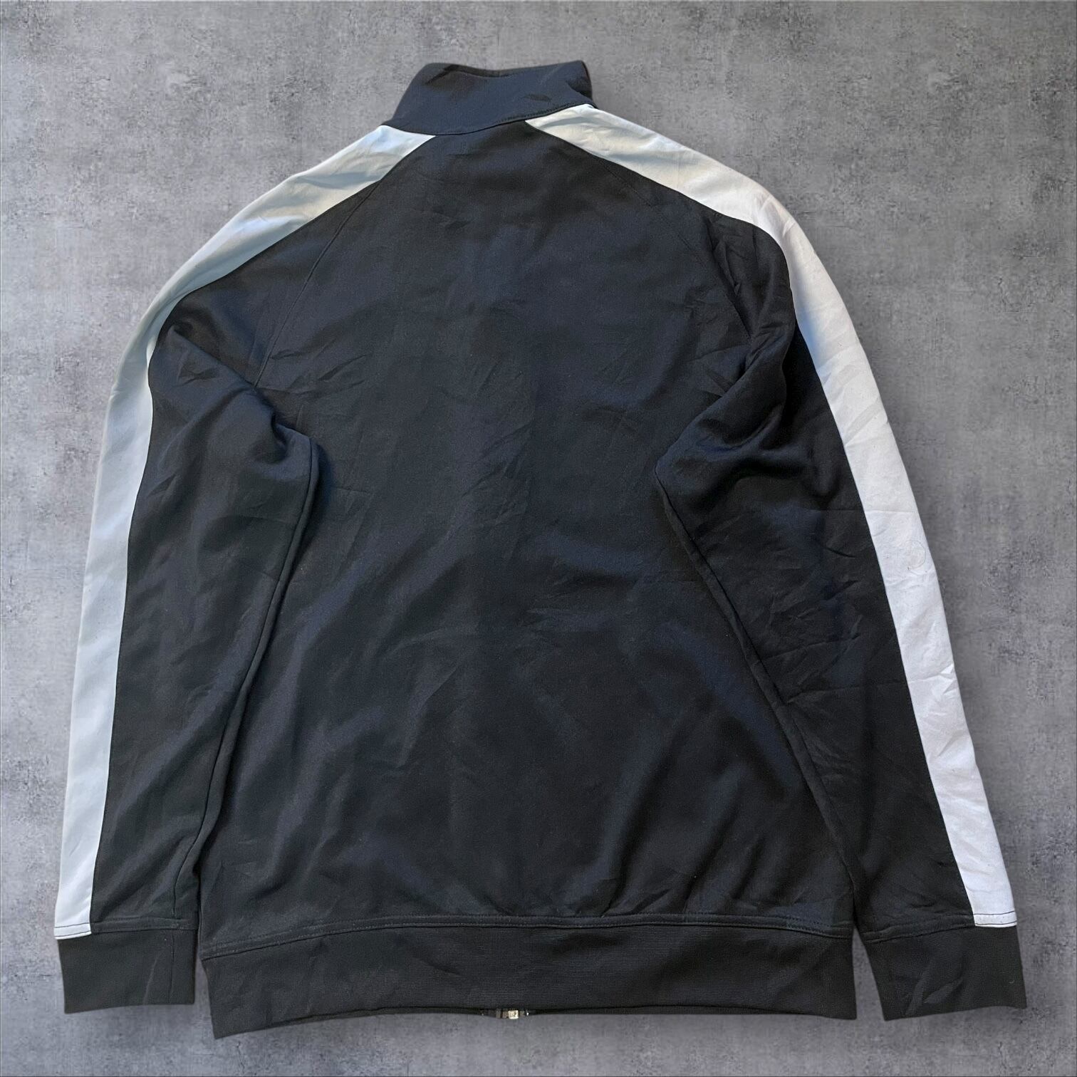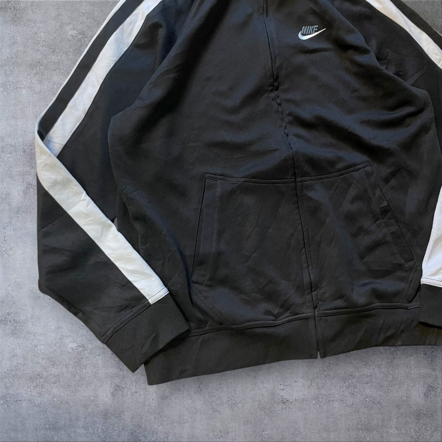 人気の高いホワイトライン×ブラックボディの配色で、存在感抜群。胸元のスウッシュロゴがワンポイントで映えます。レトロな雰囲気もあり、Y2K・90s・古着好きにもオススメ。