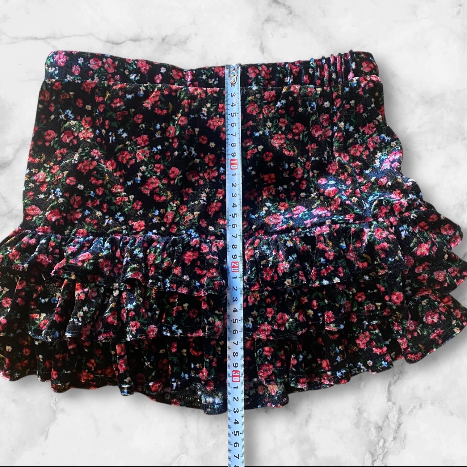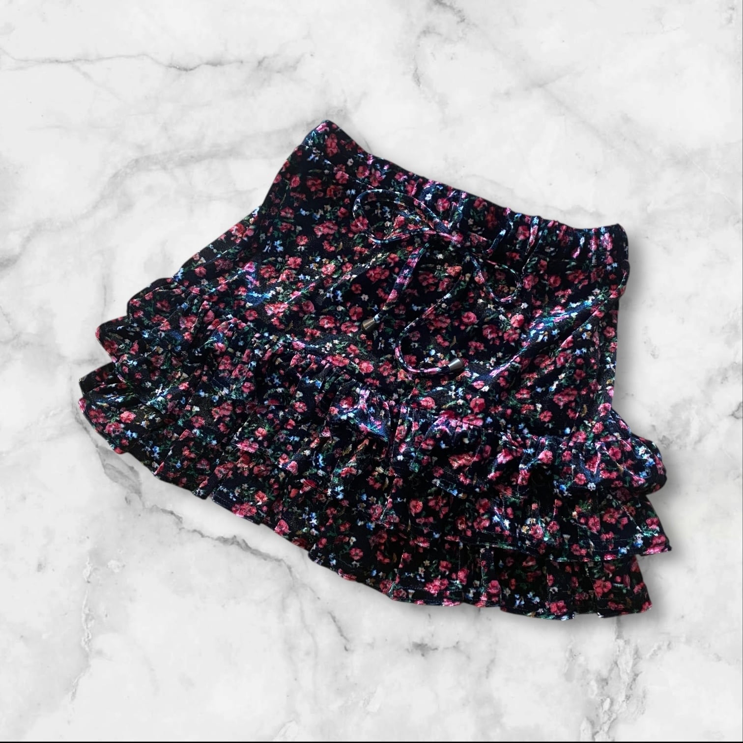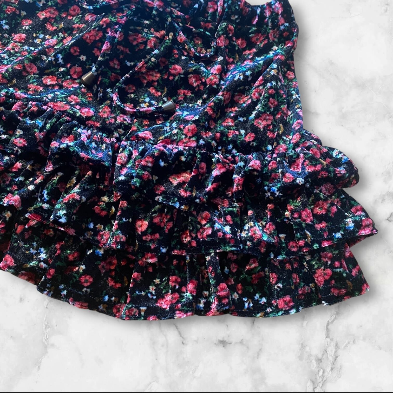 ベロア素材×小花柄の甘辛バランスが絶妙なティアードミニスカート。