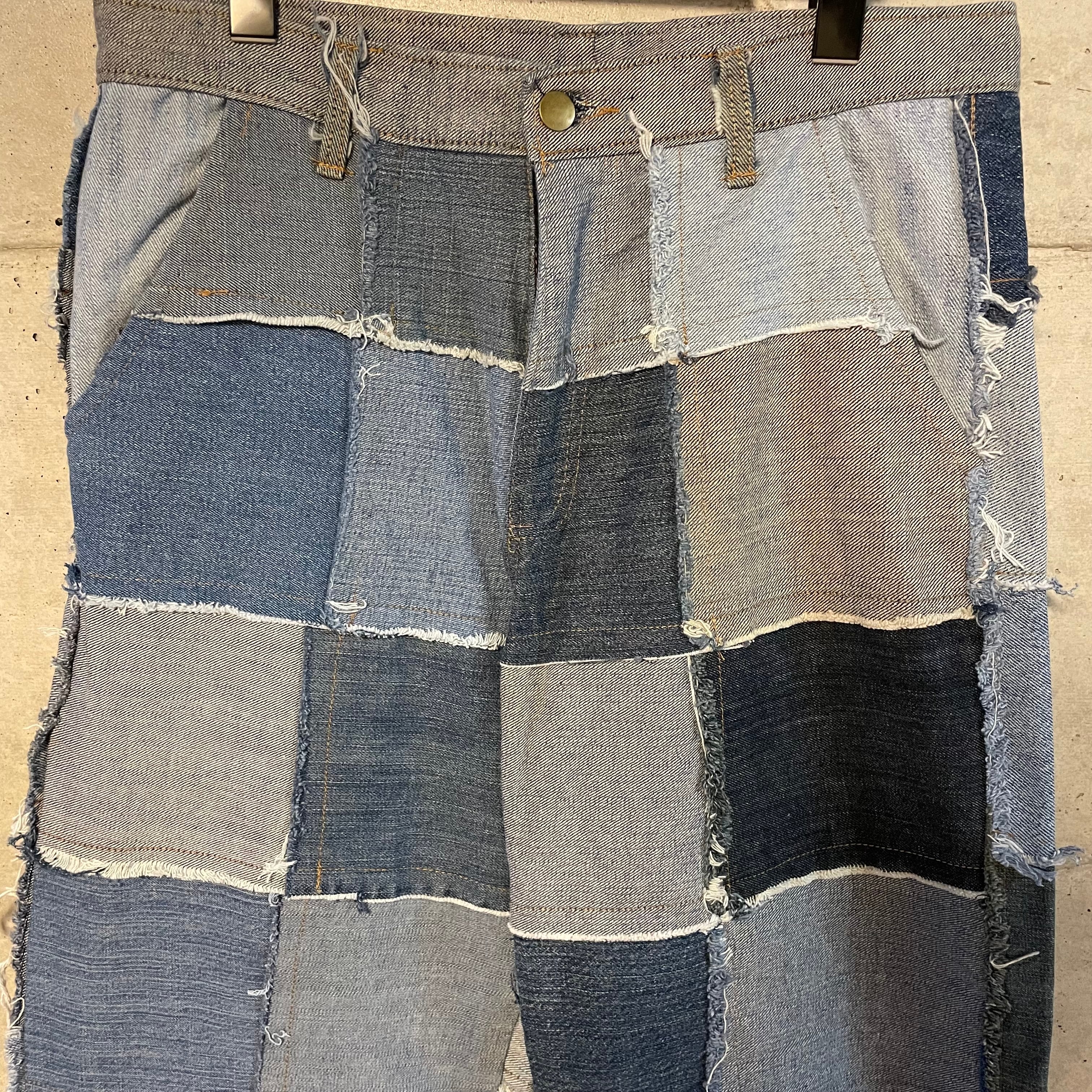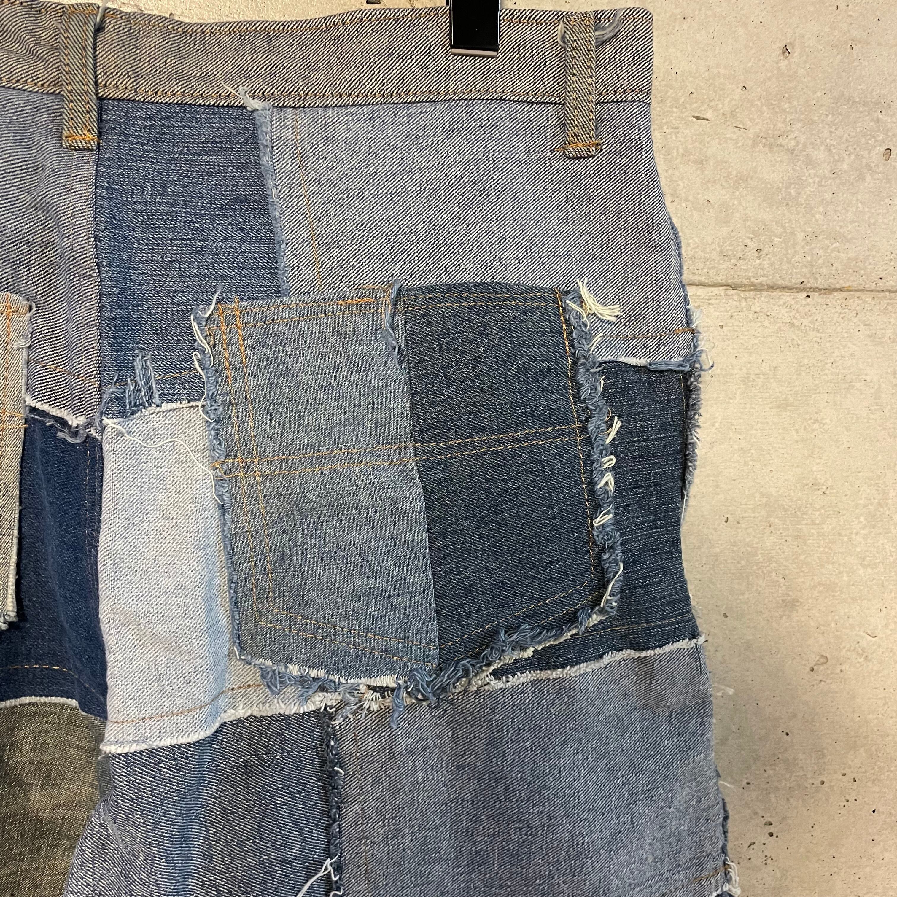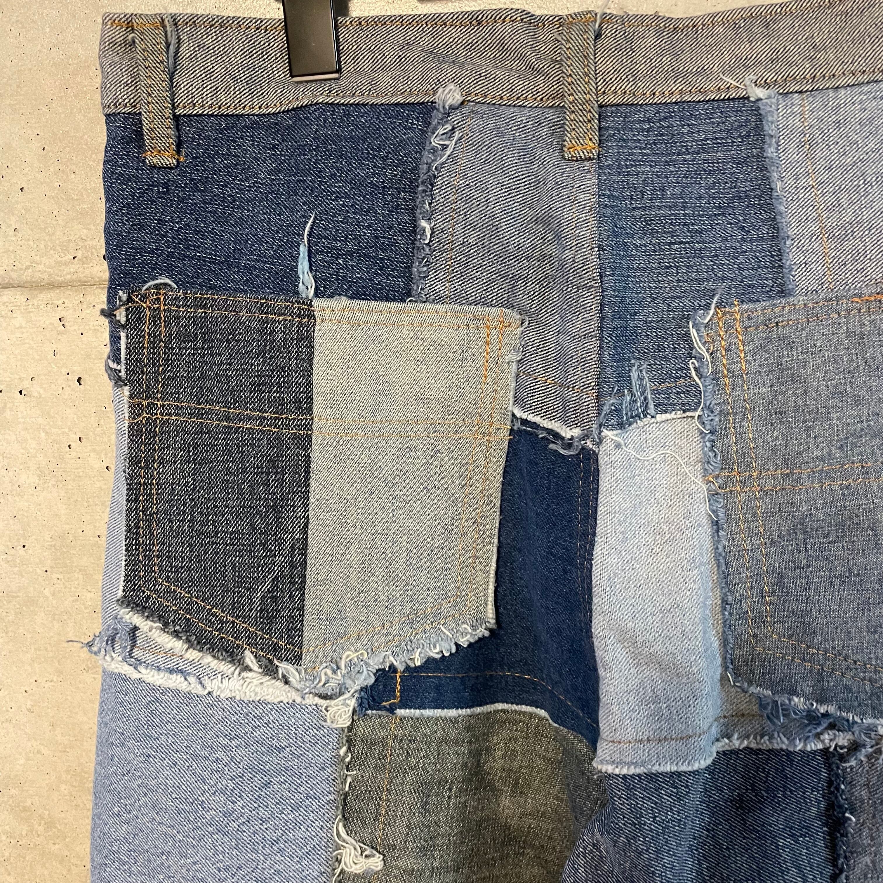 パッチワーク状に繋げたデニムのテキスタイルをそれぞれフレアさせたインパクト抜群な一着です。