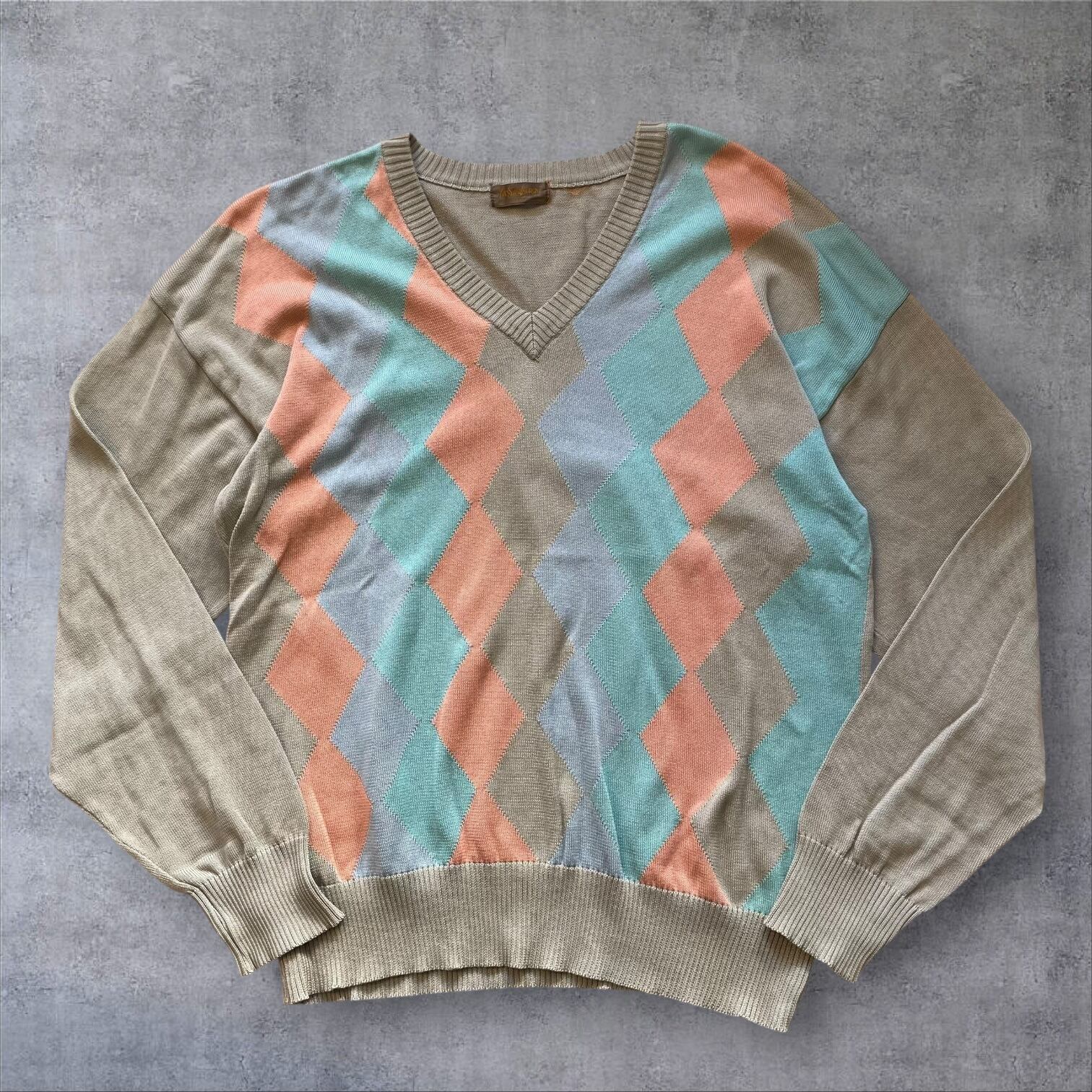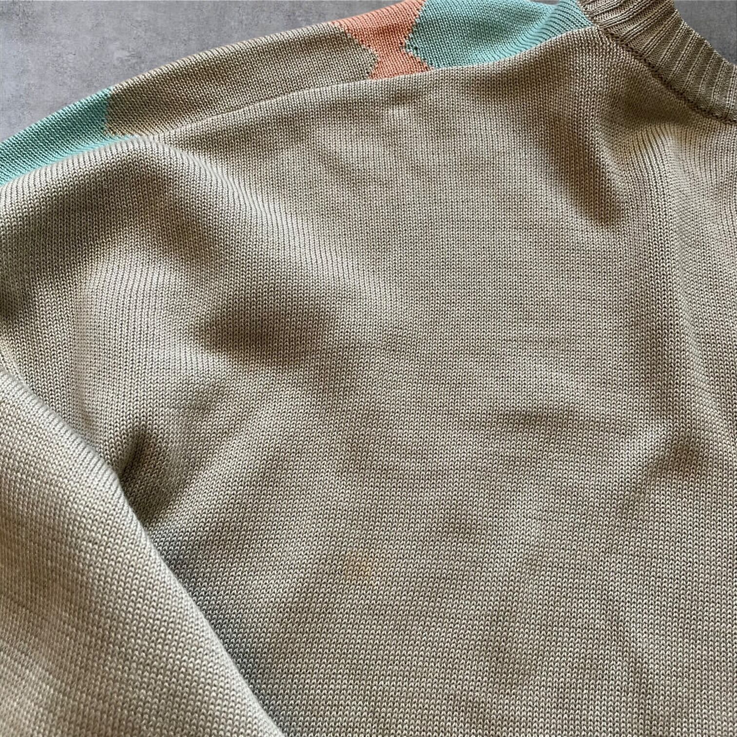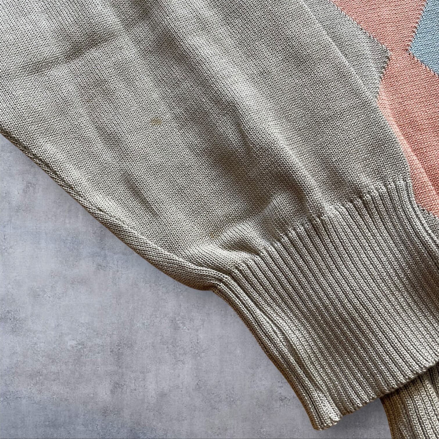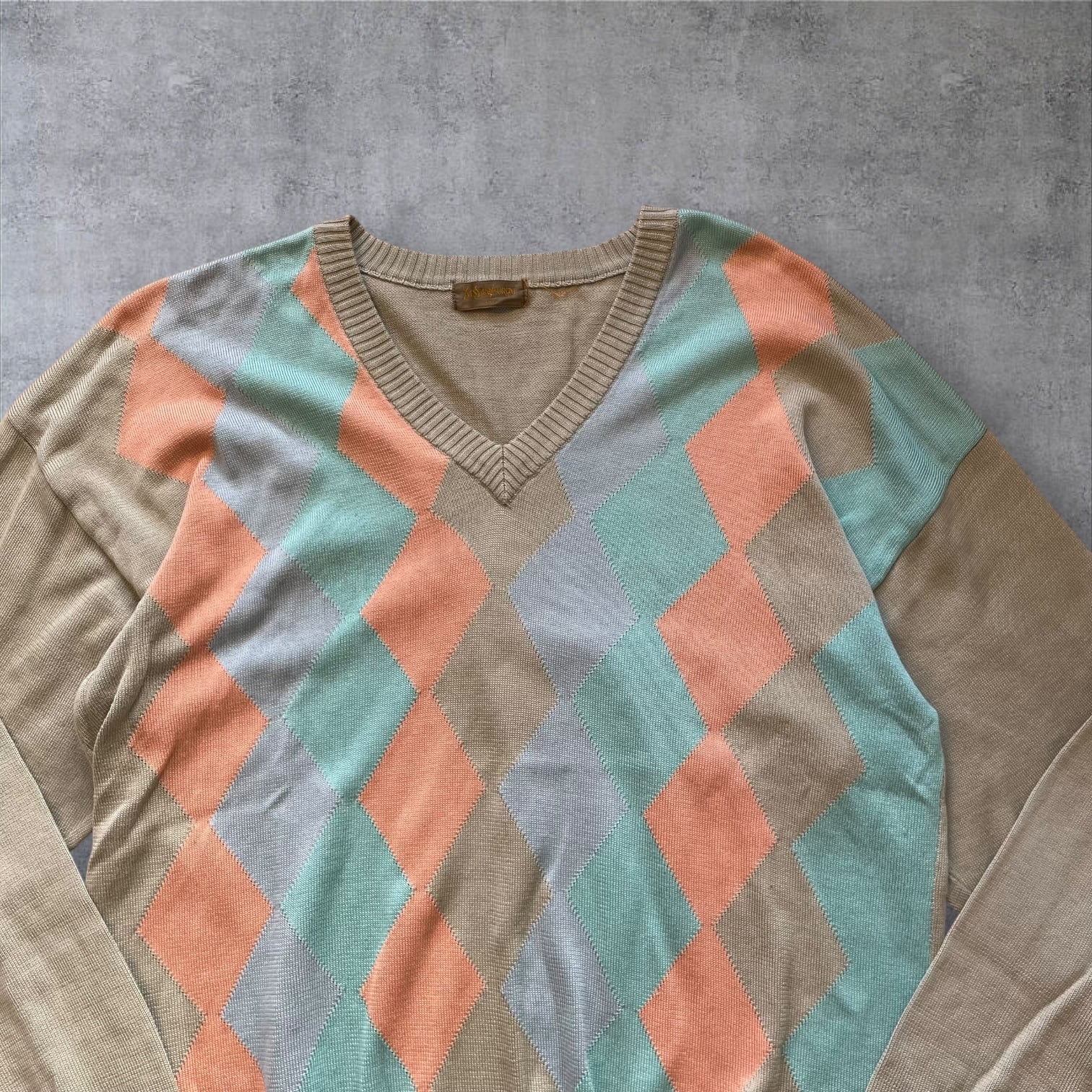 絶妙なくすみカラーとアーガイル風の総柄が目を引くレトロニット。