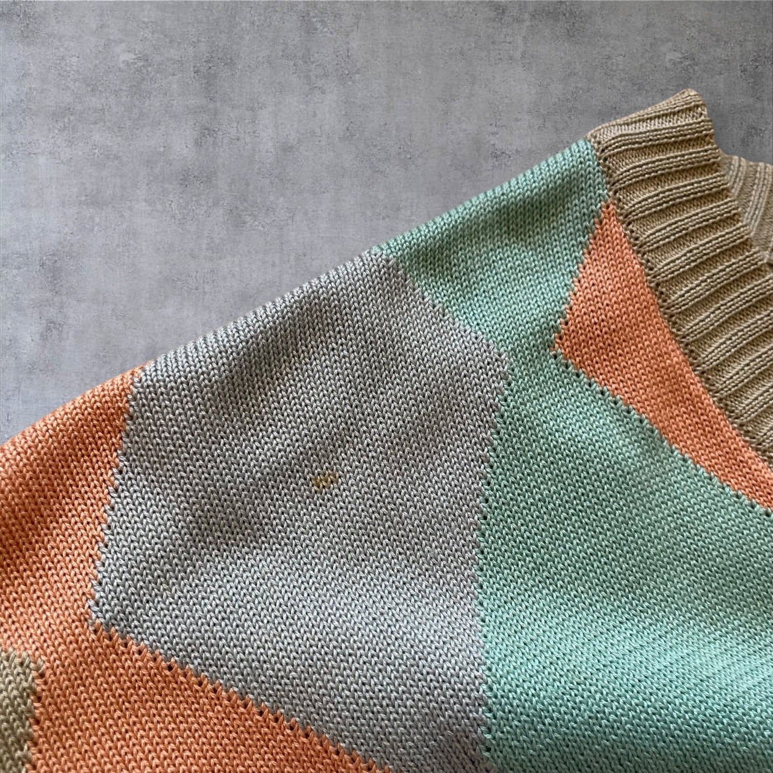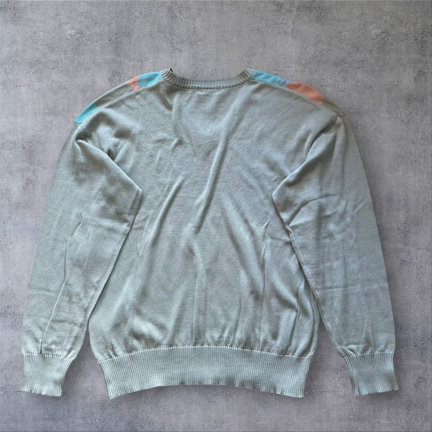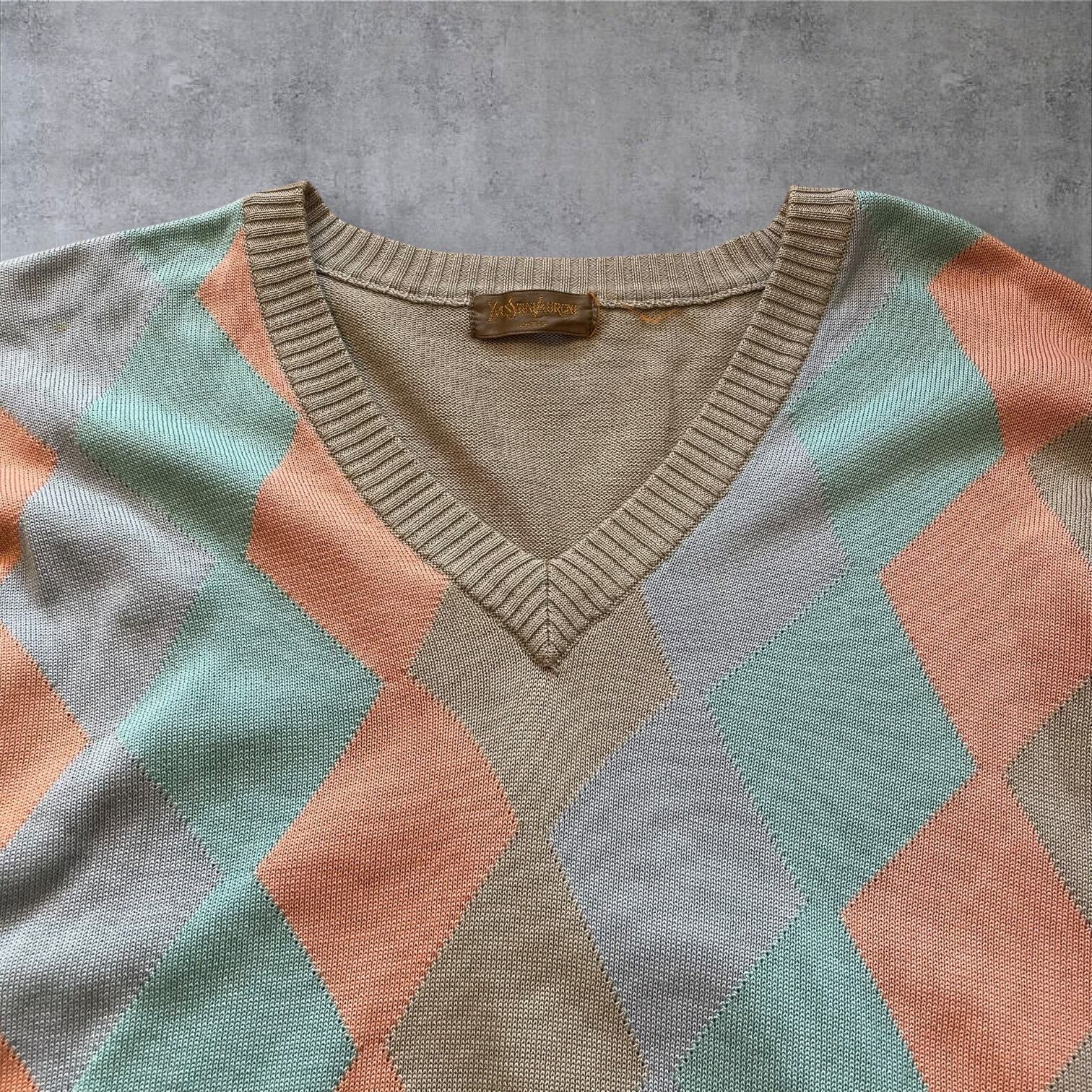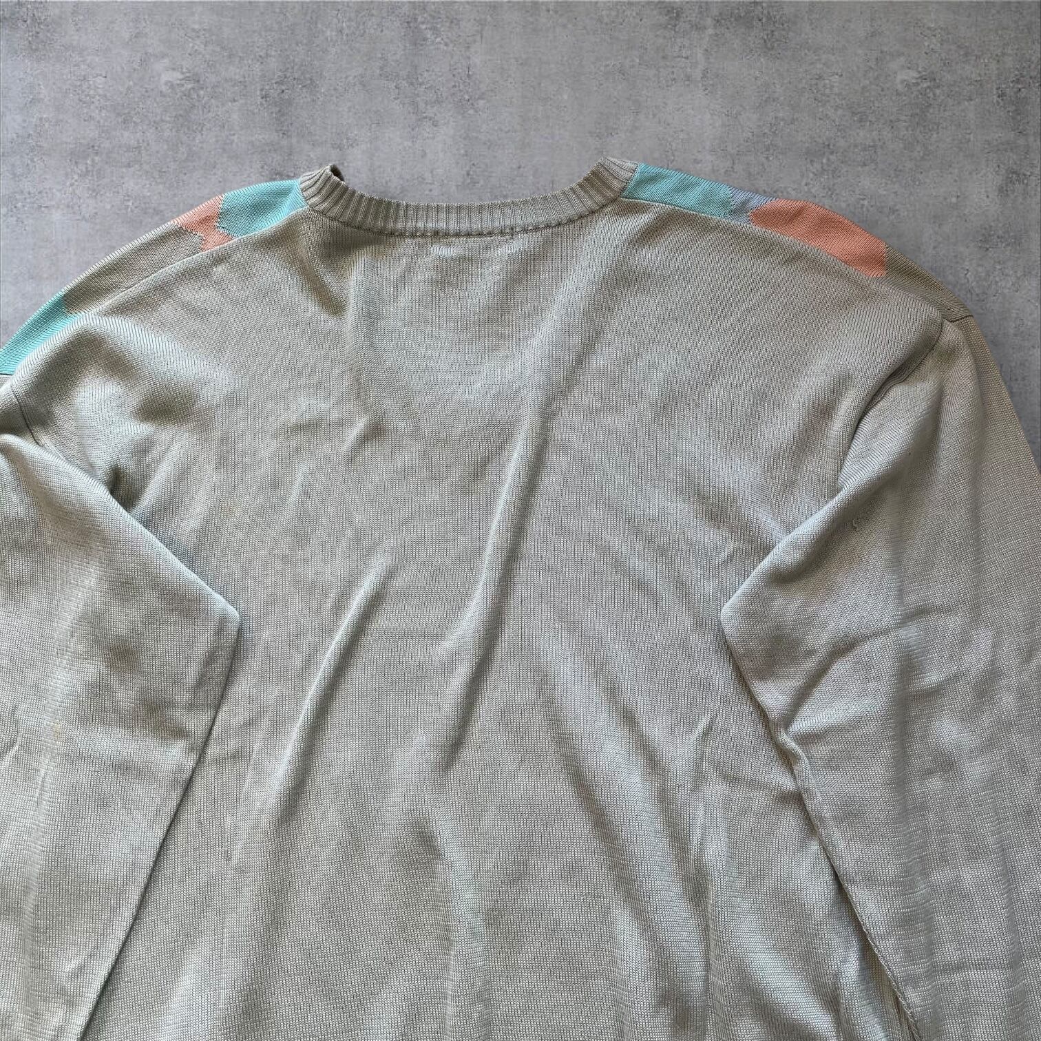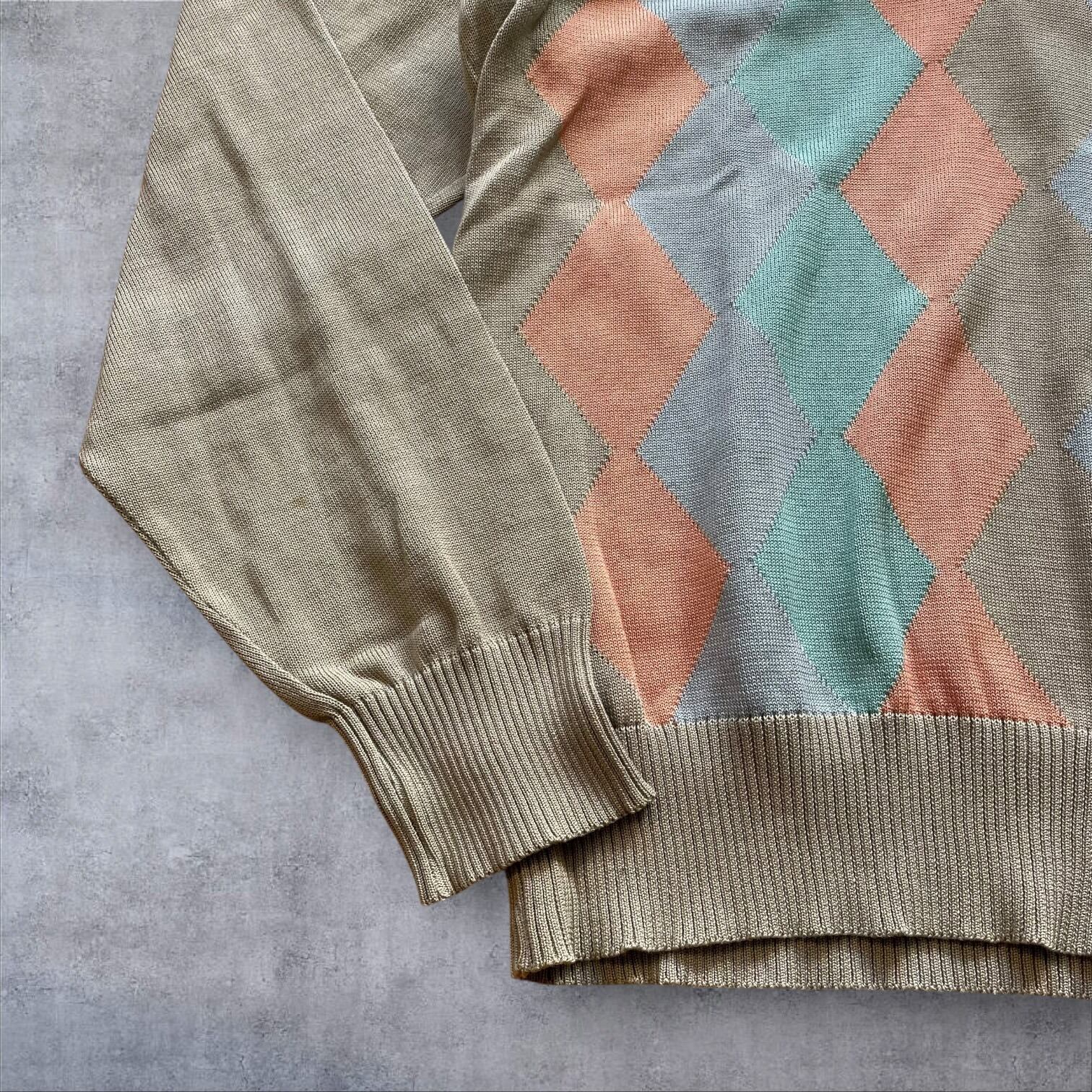 絶妙なくすみカラーとアーガイル風の総柄が目を引くレトロニット。