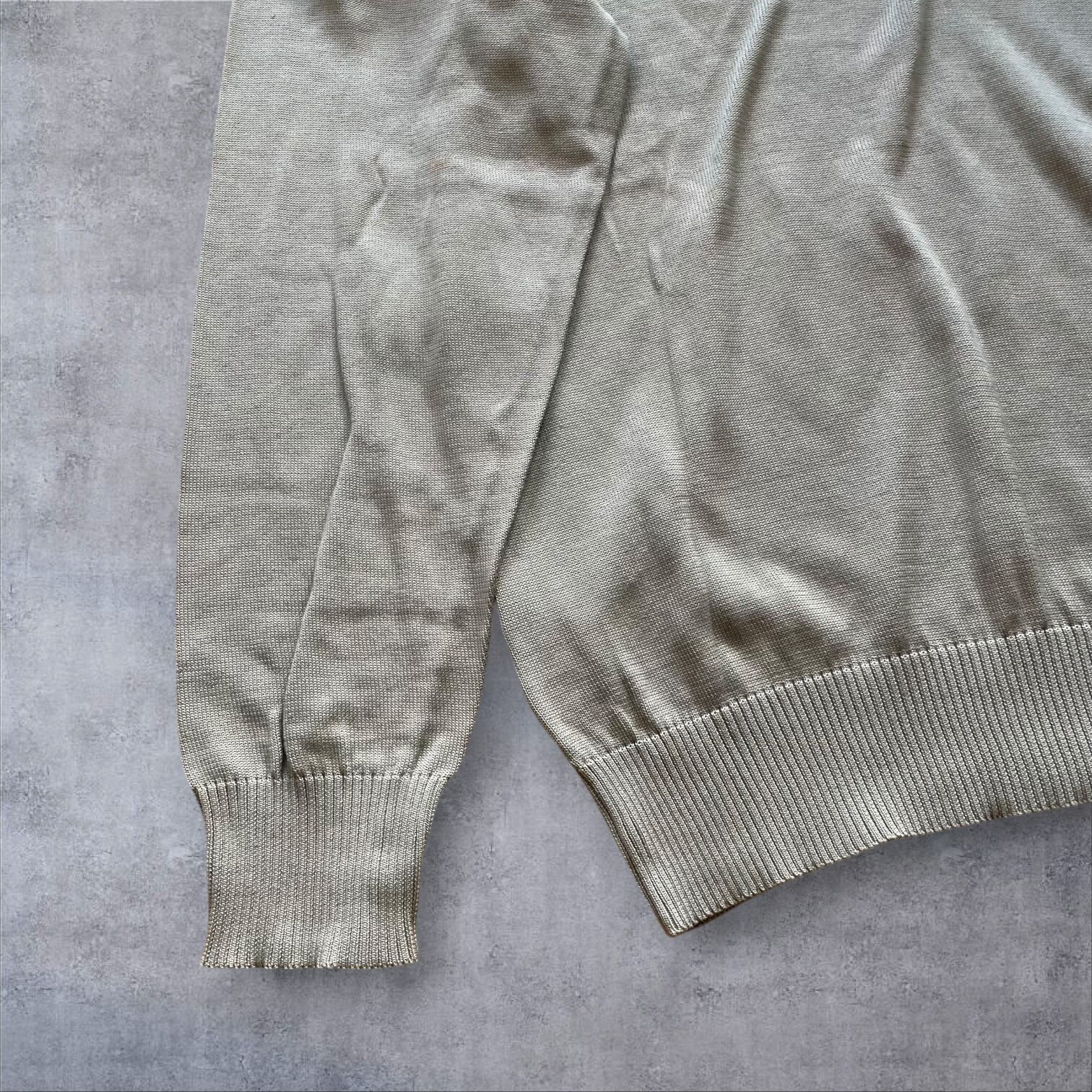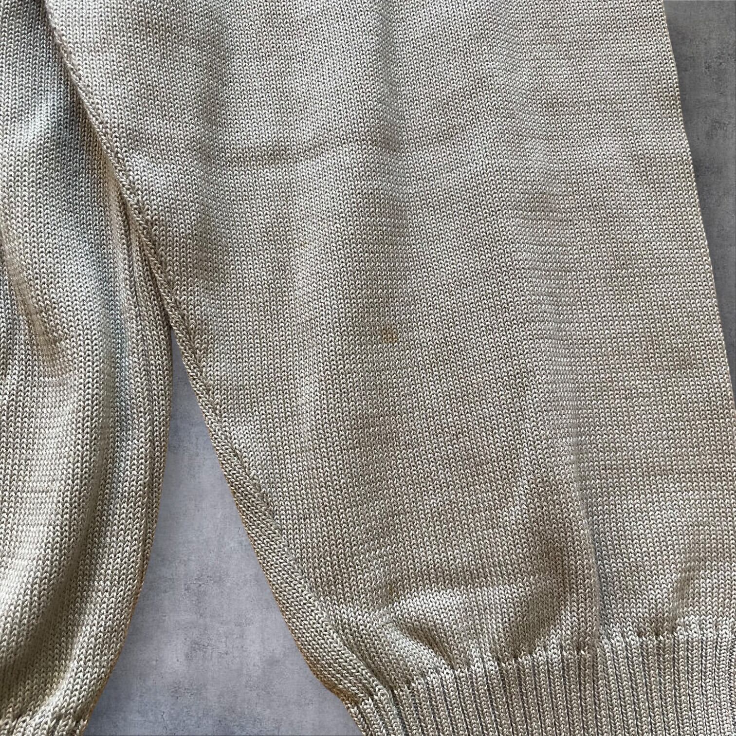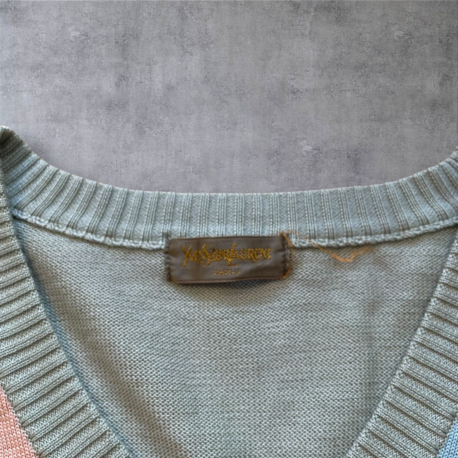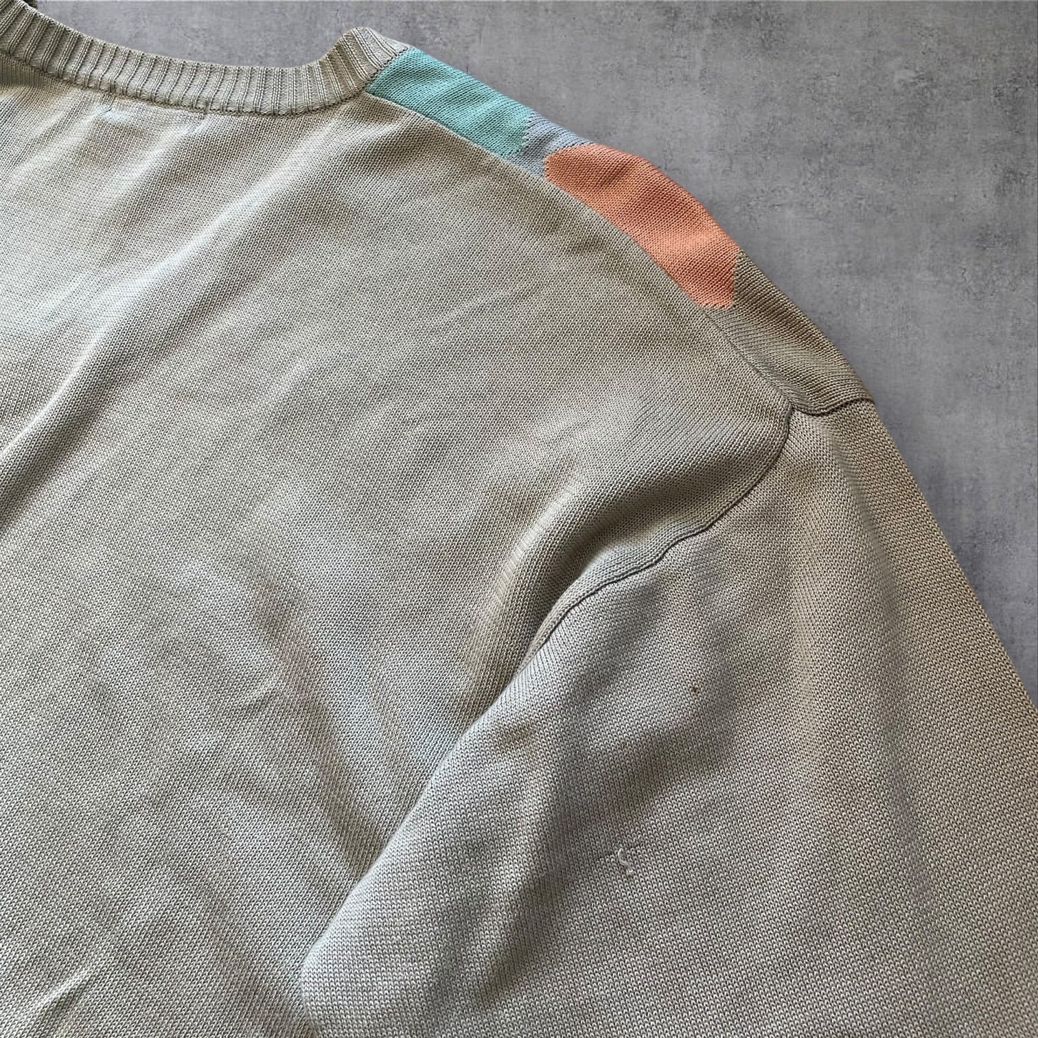 絶妙なくすみカラーとアーガイル風の総柄が目を引くレトロニット。