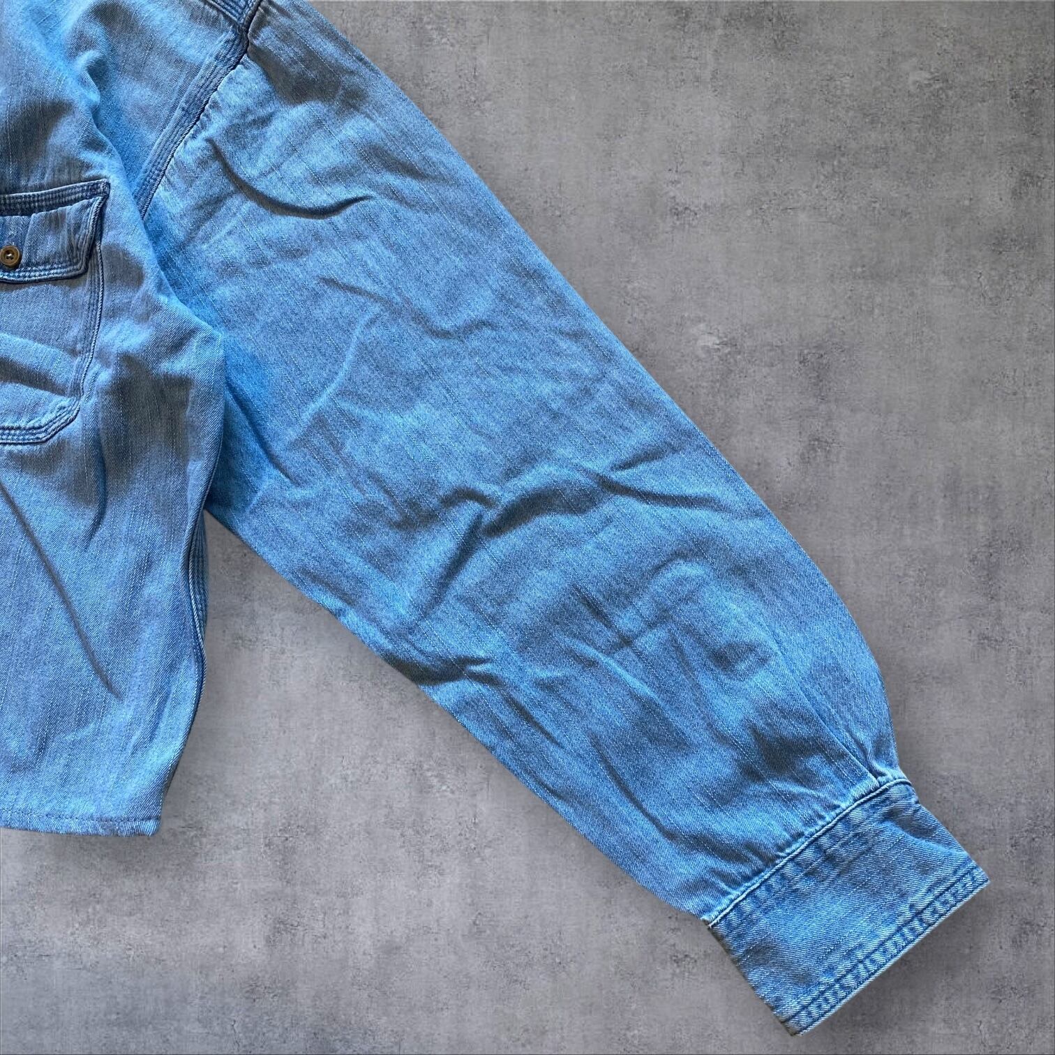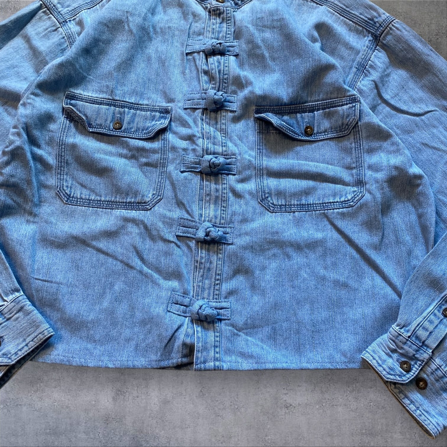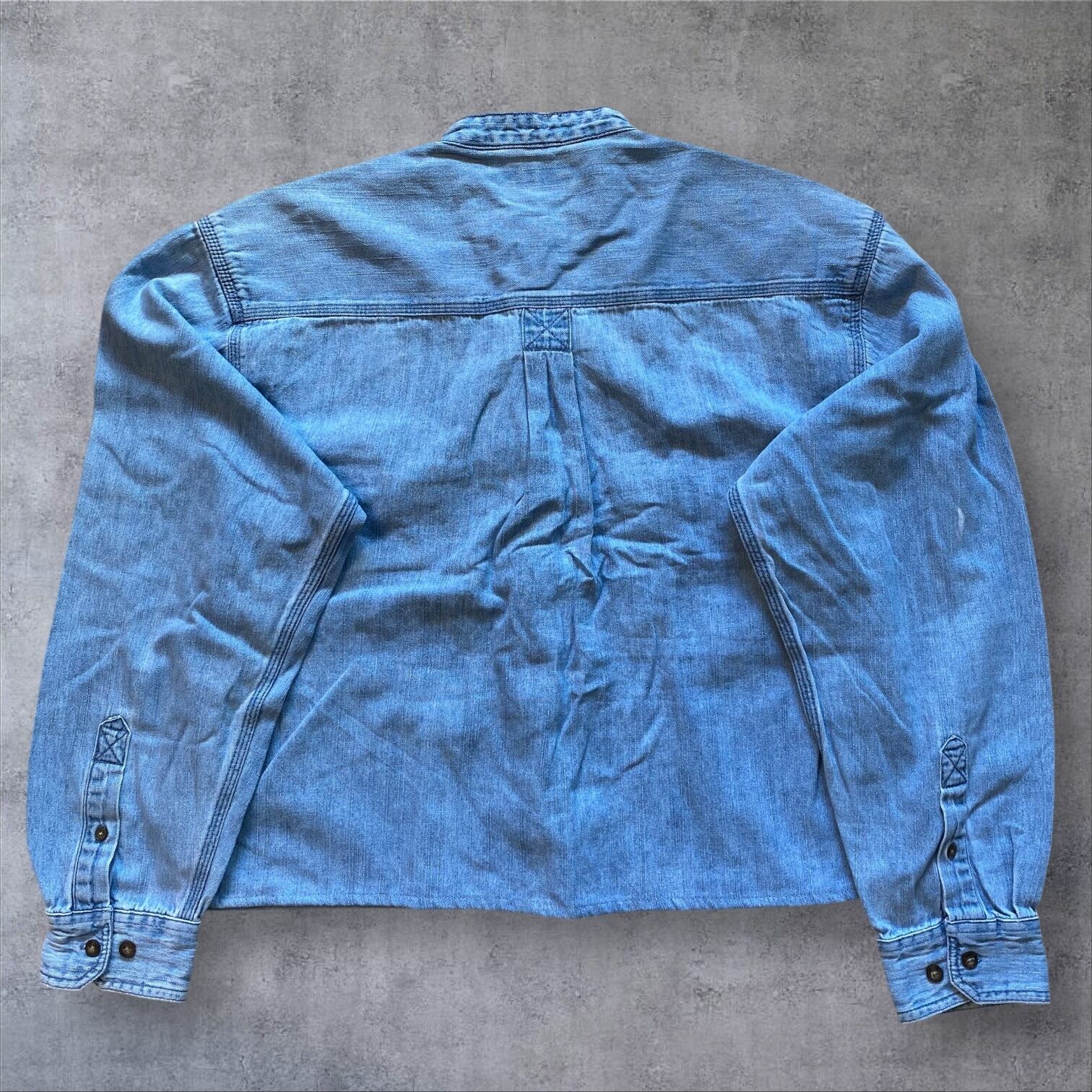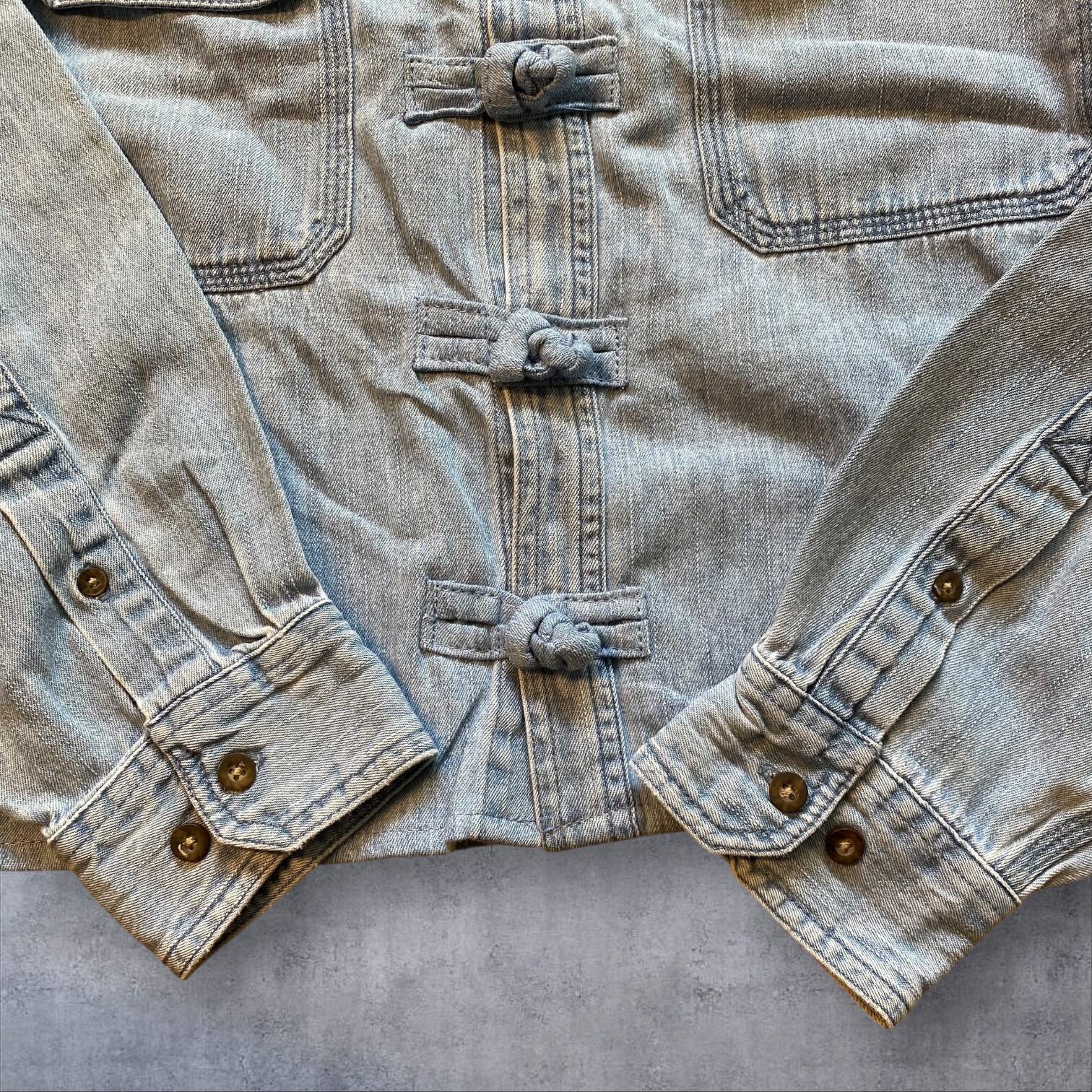 デニム素材を使用した珍しいチャイナシャツは、春先まで長く着用できるアイテムです。