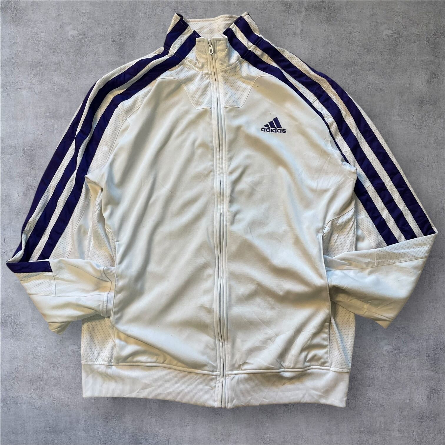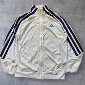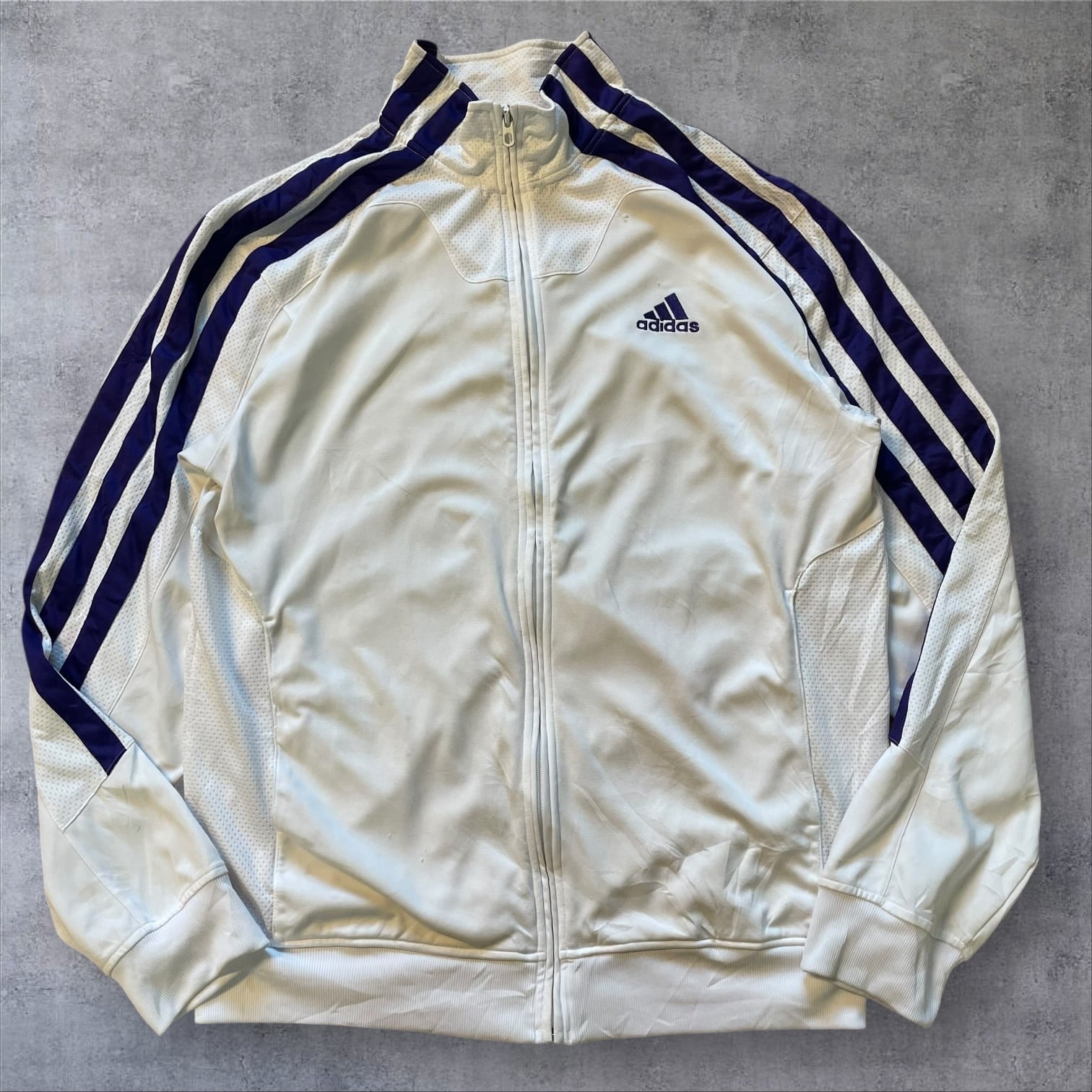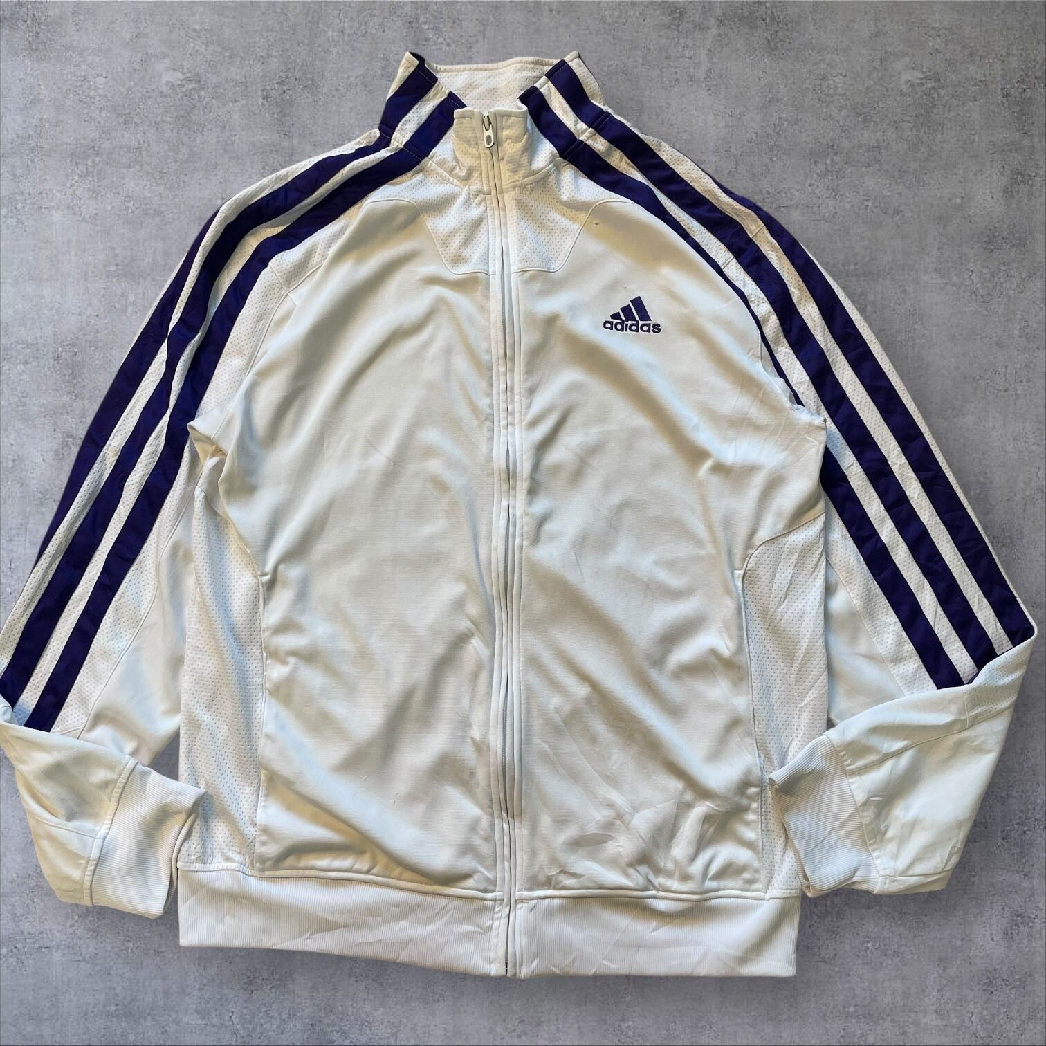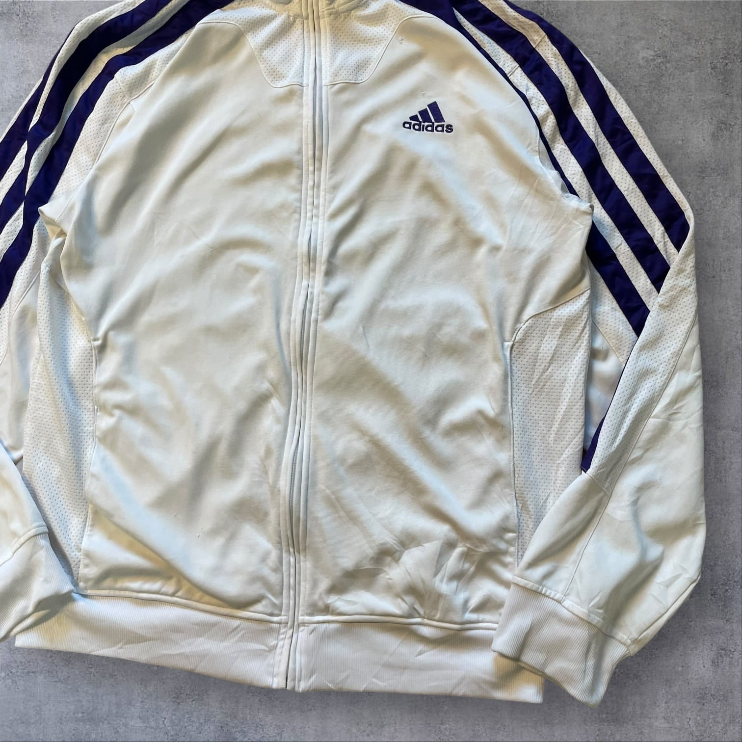 ホワイトボディにパープルのスリーストライプが映える一着です。