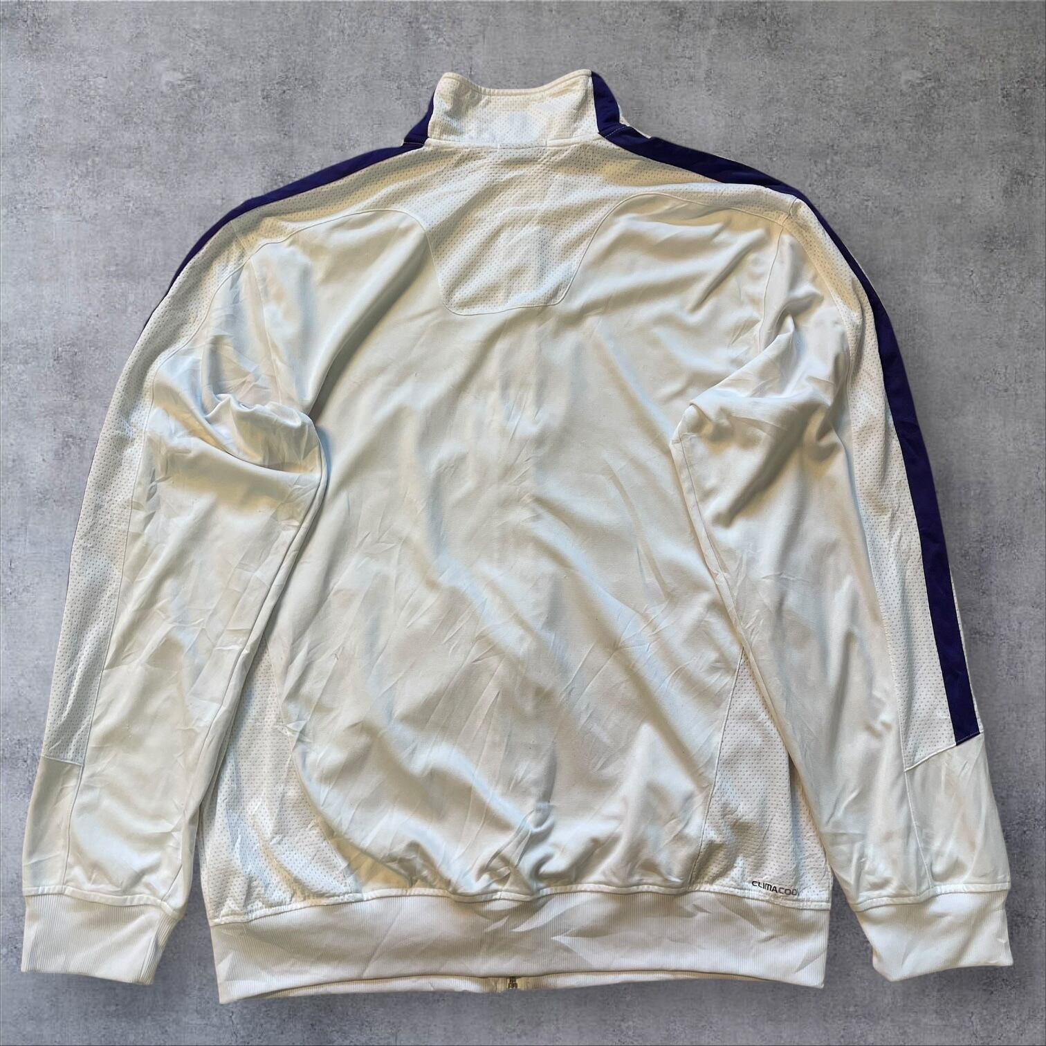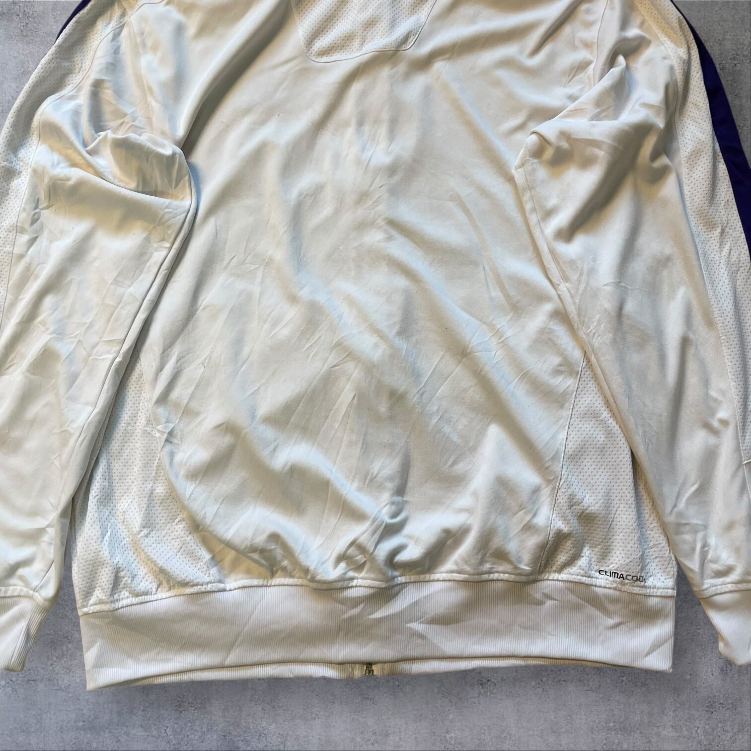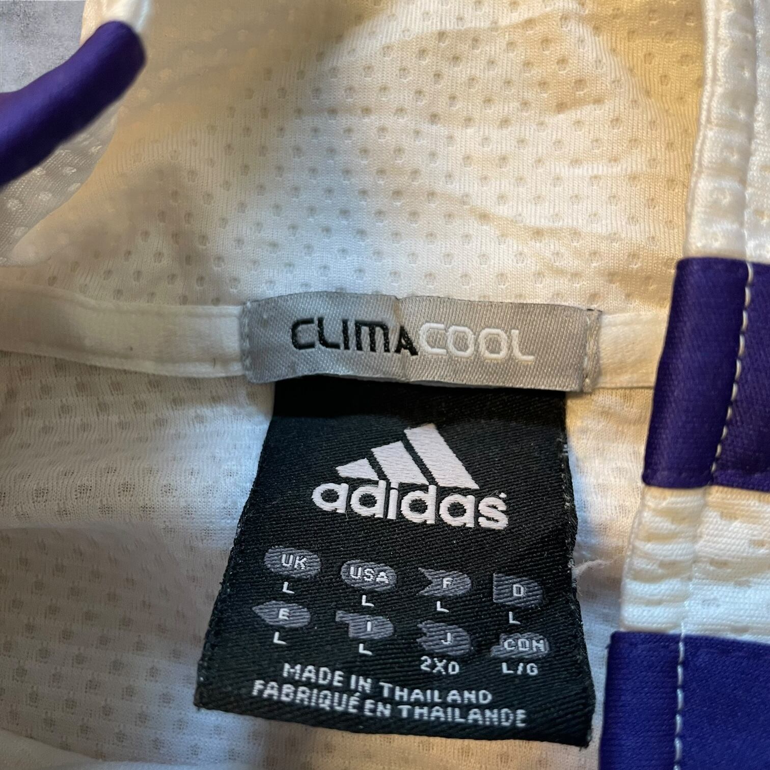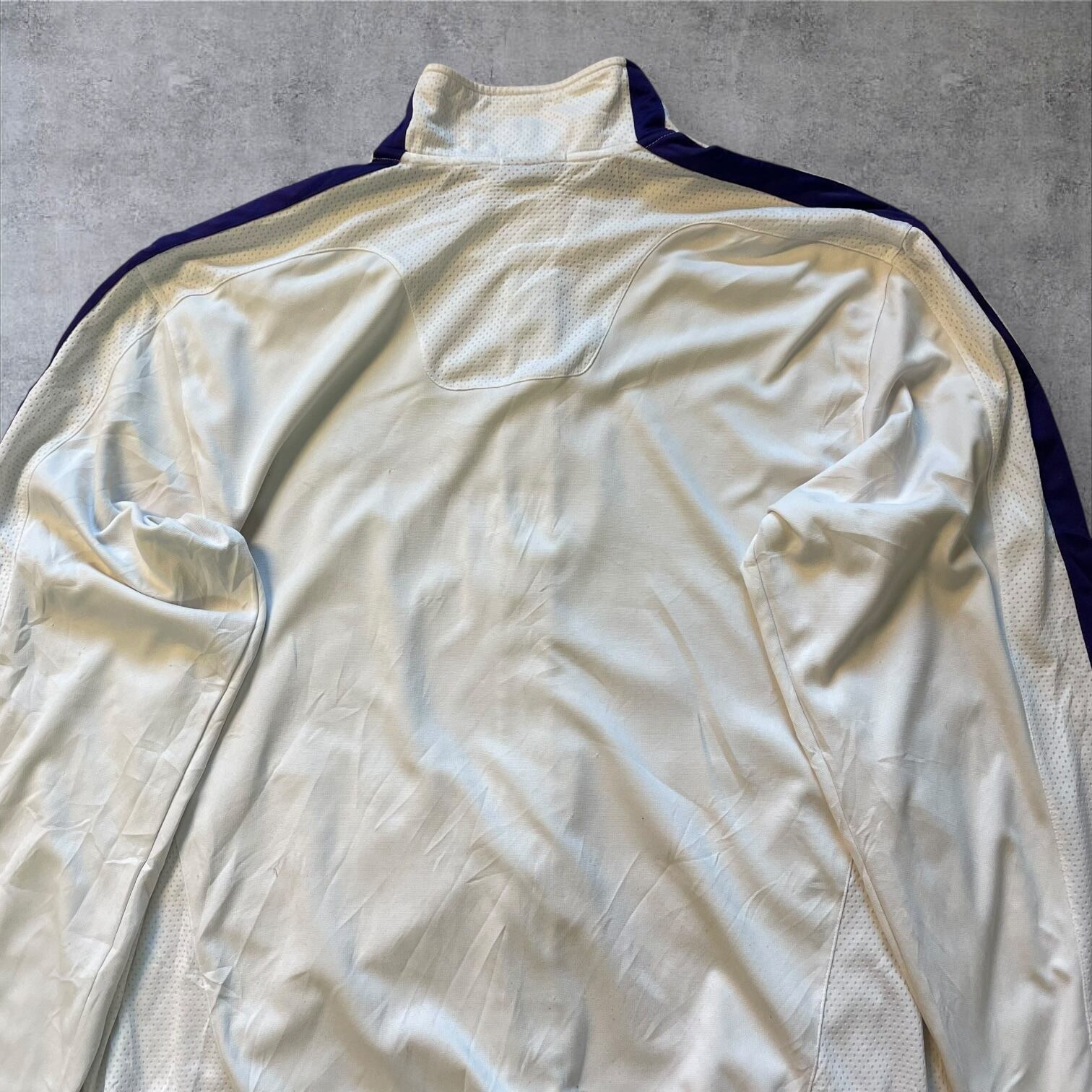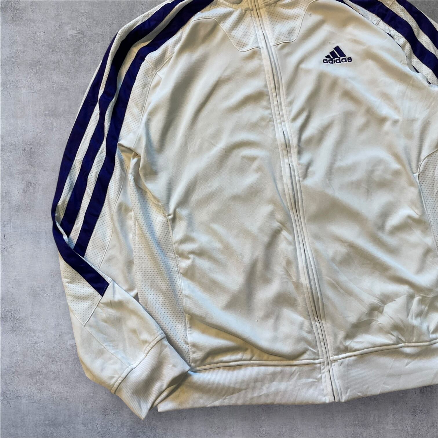 ホワイトボディにパープルのスリーストライプが映える一着です。