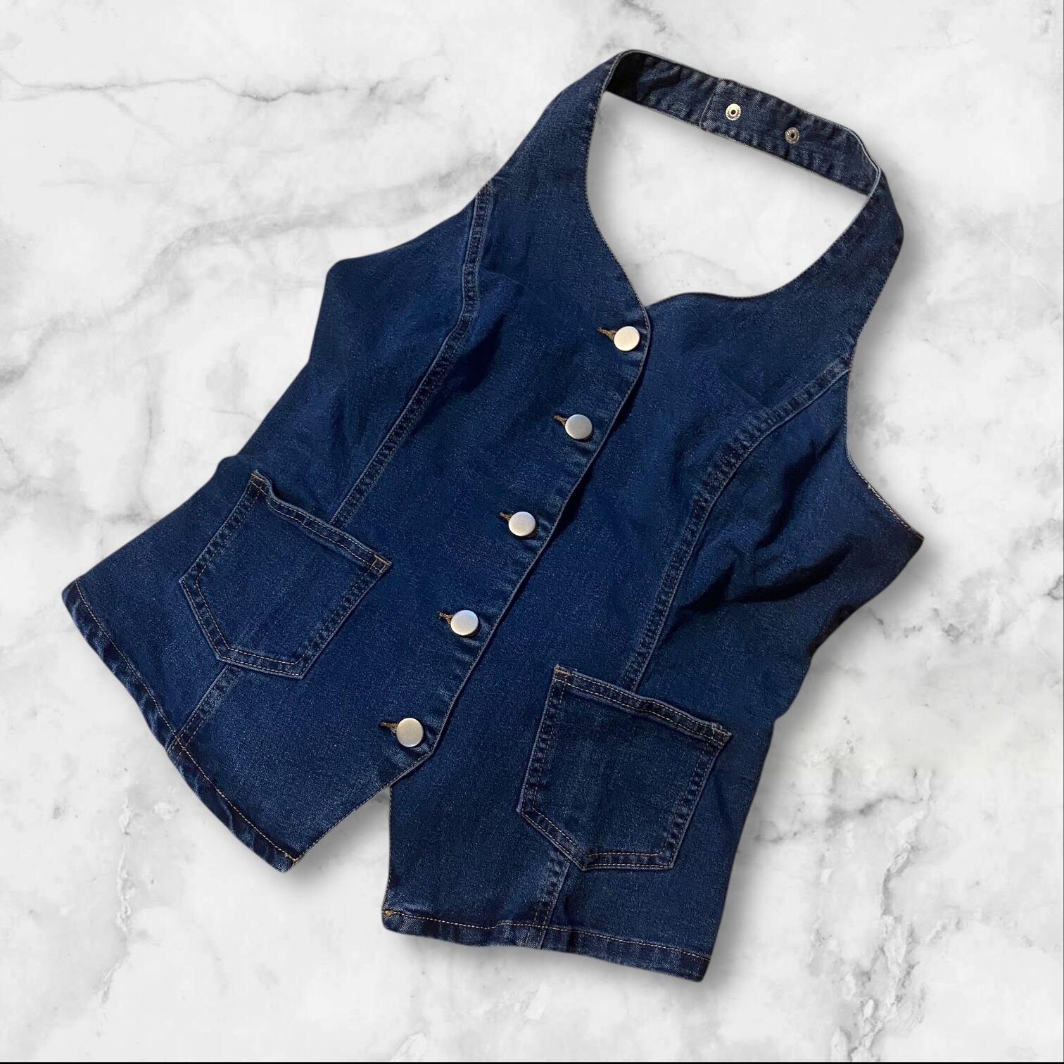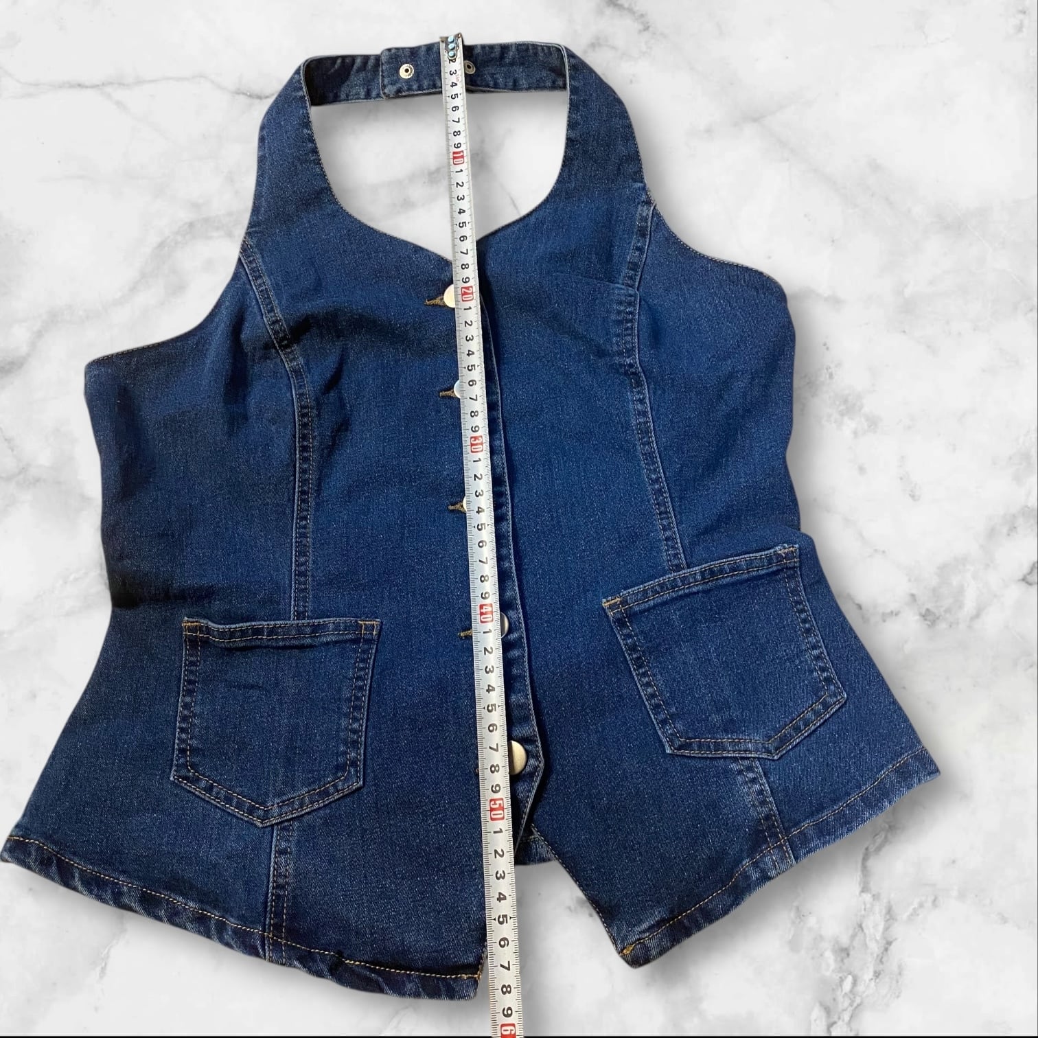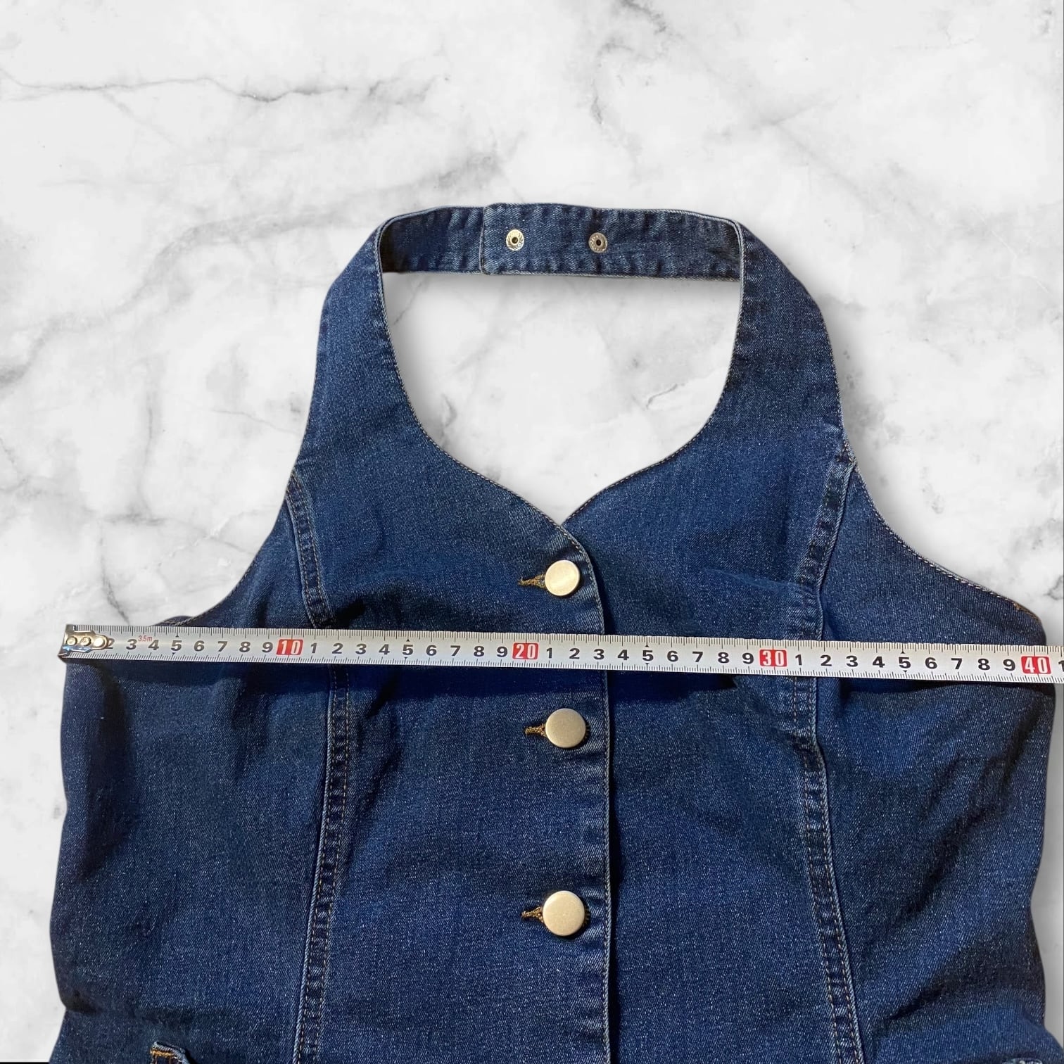レースとデニムの異素材ミックスが目を惹く、ホルターネック風デザインのベストです。