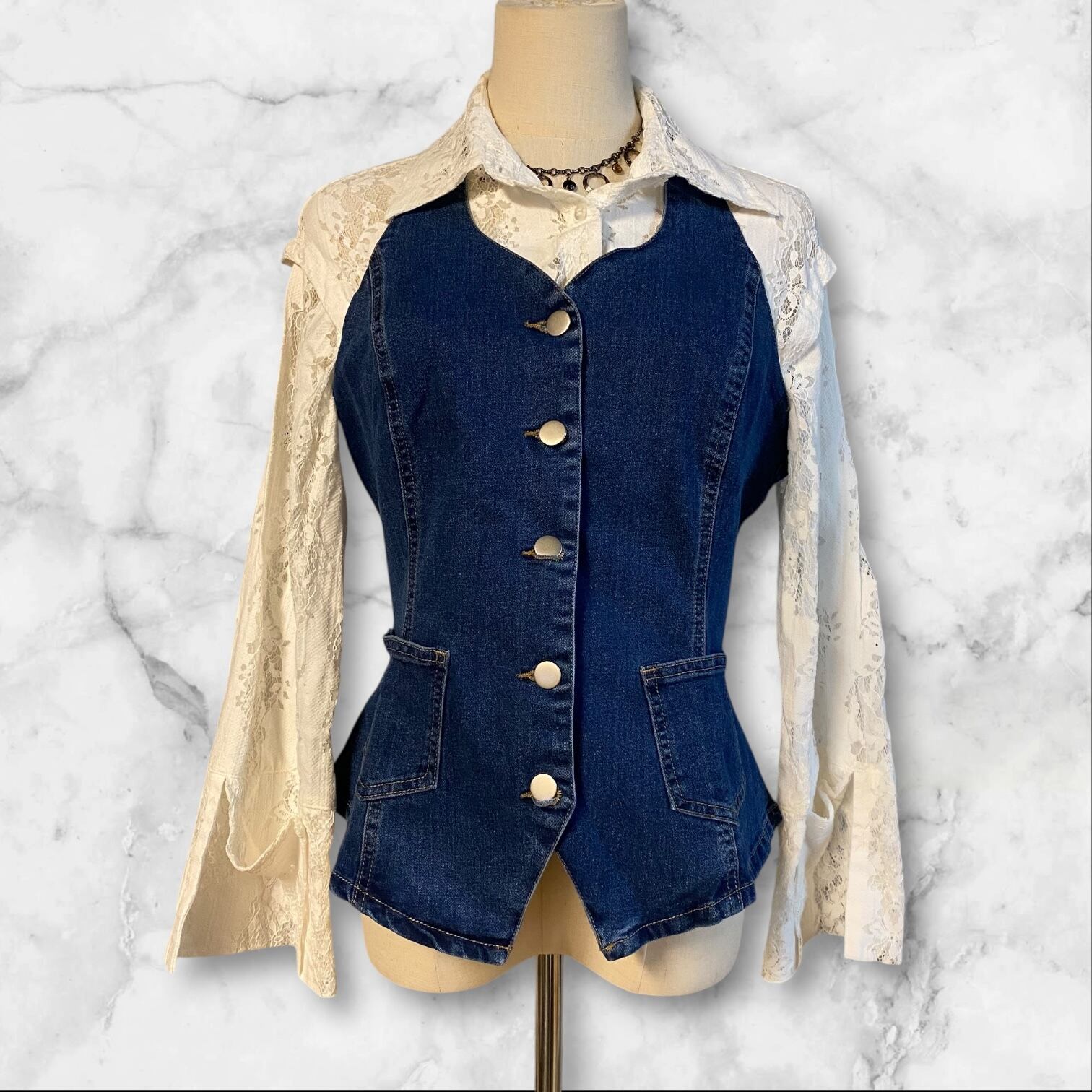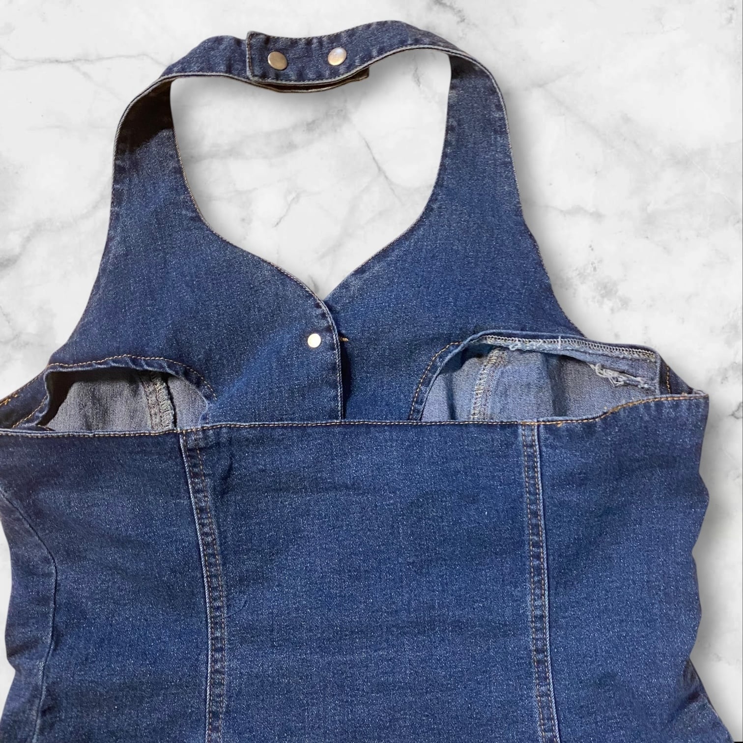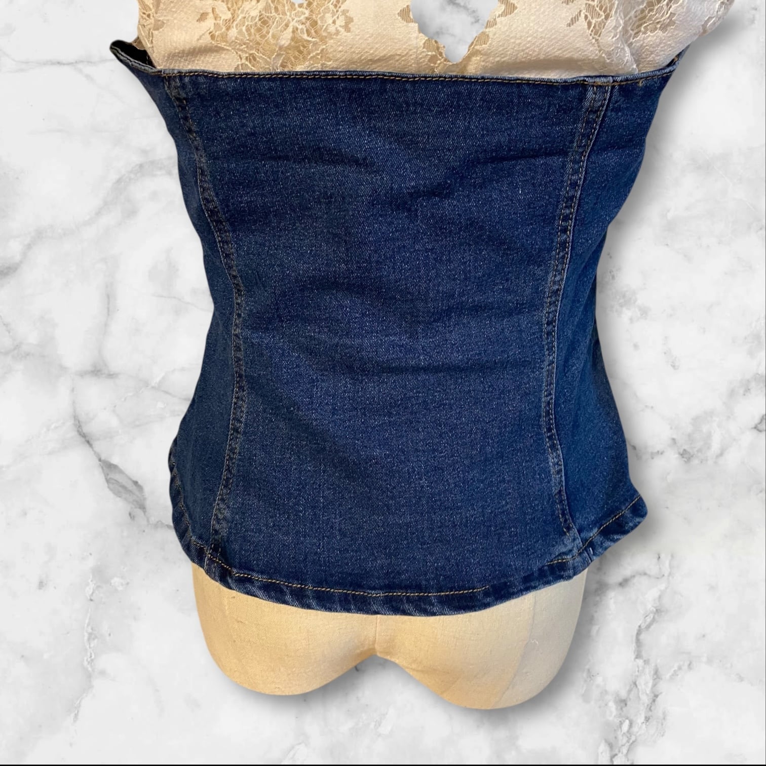 レースとデニムの異素材ミックスが目を惹く、ホルターネック風デザインのベストです。