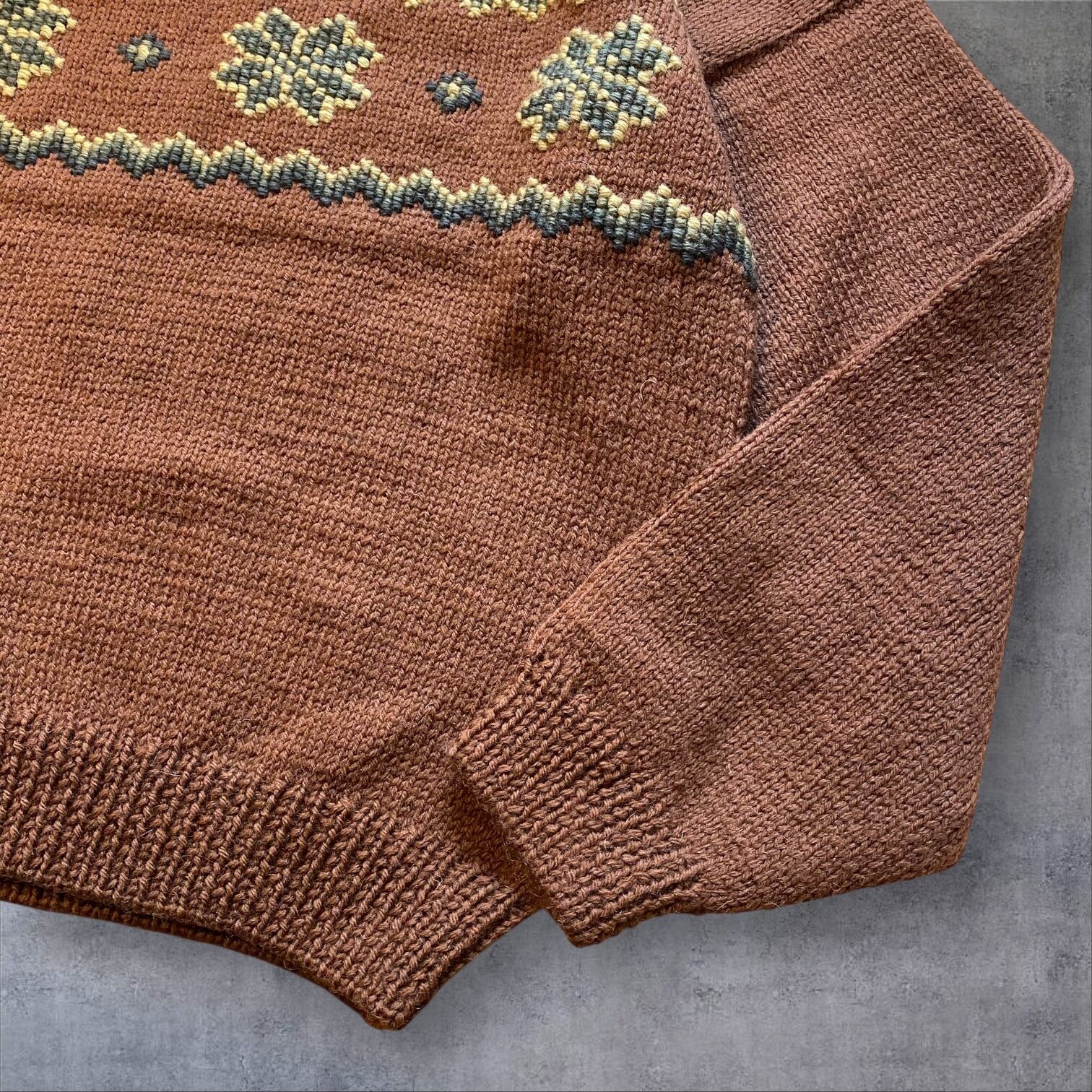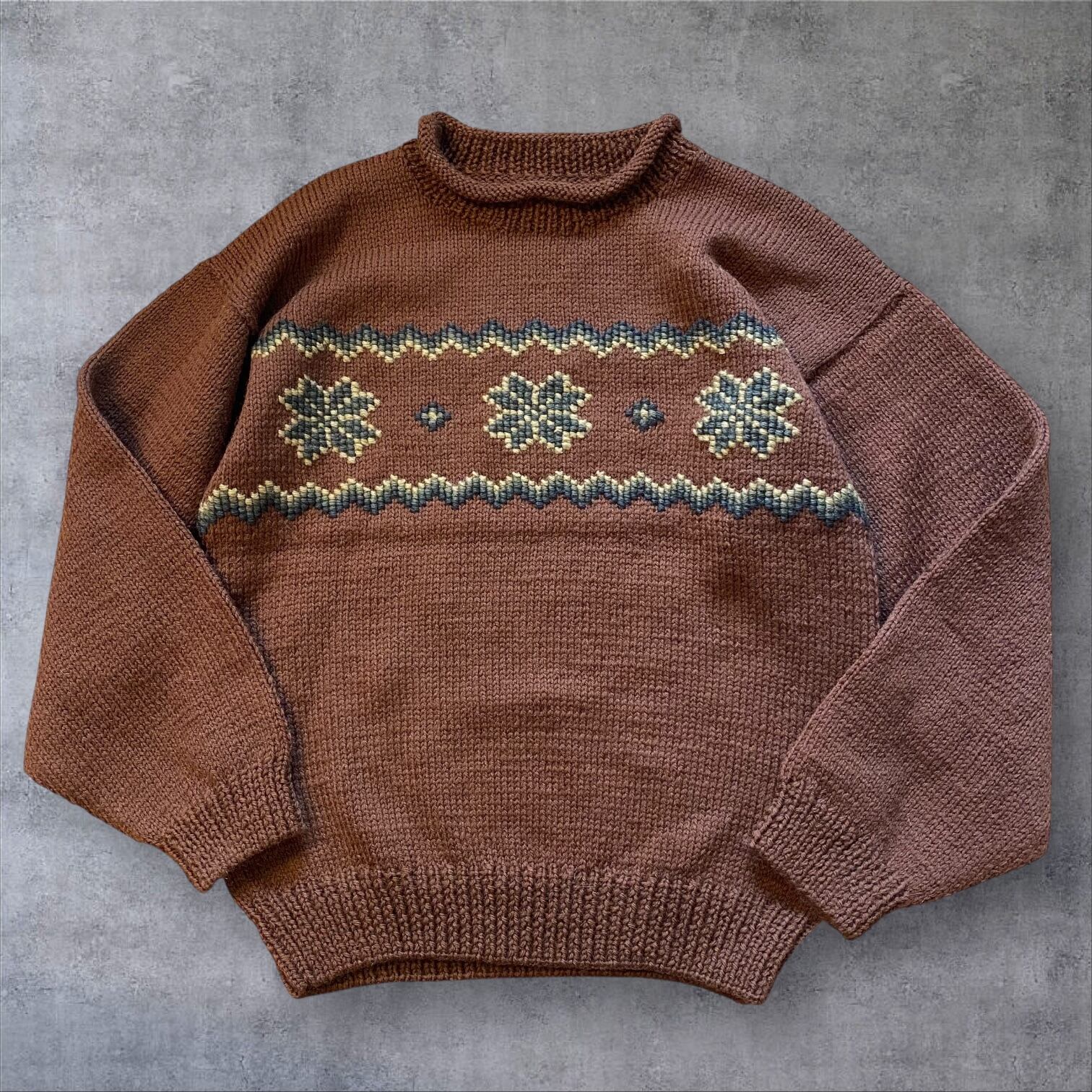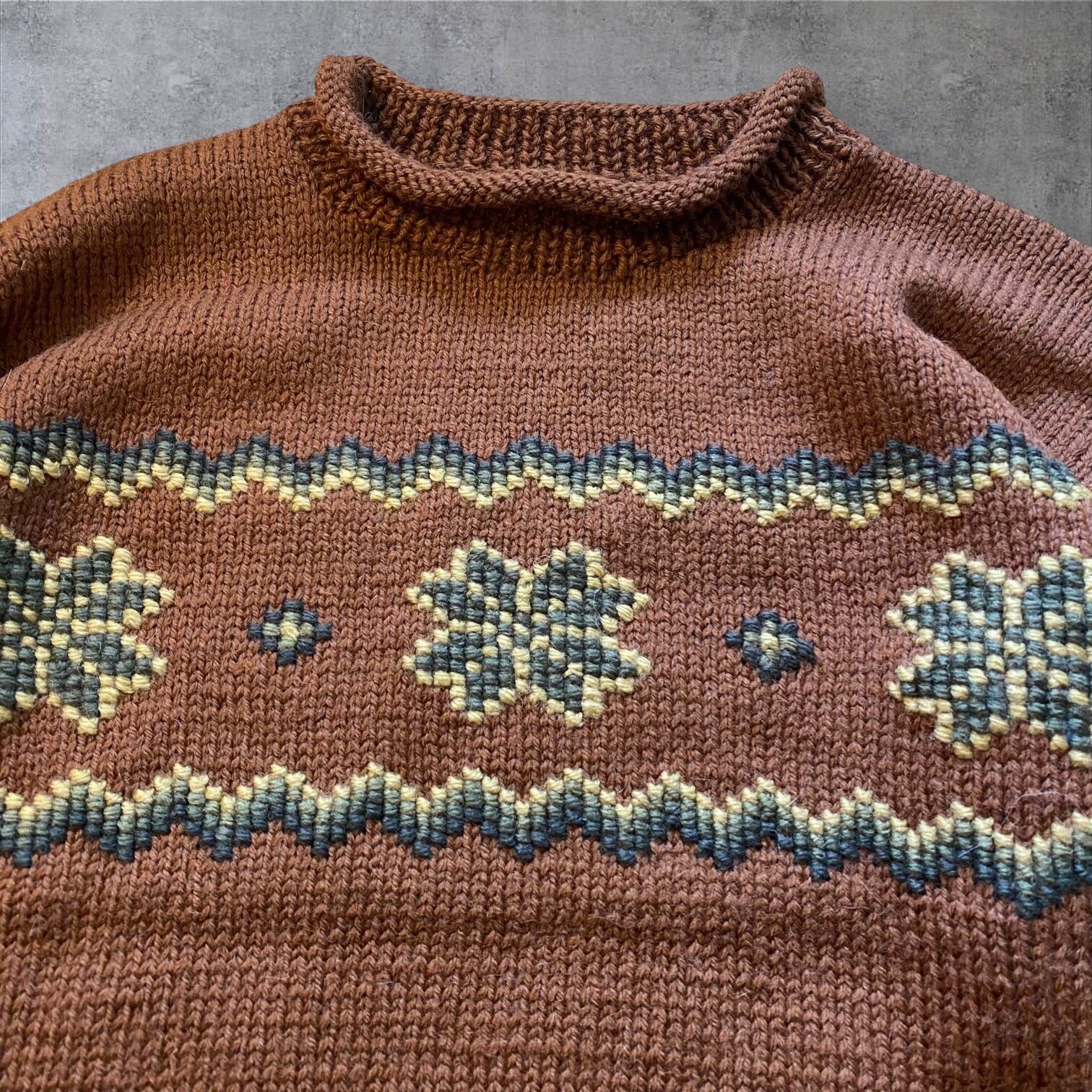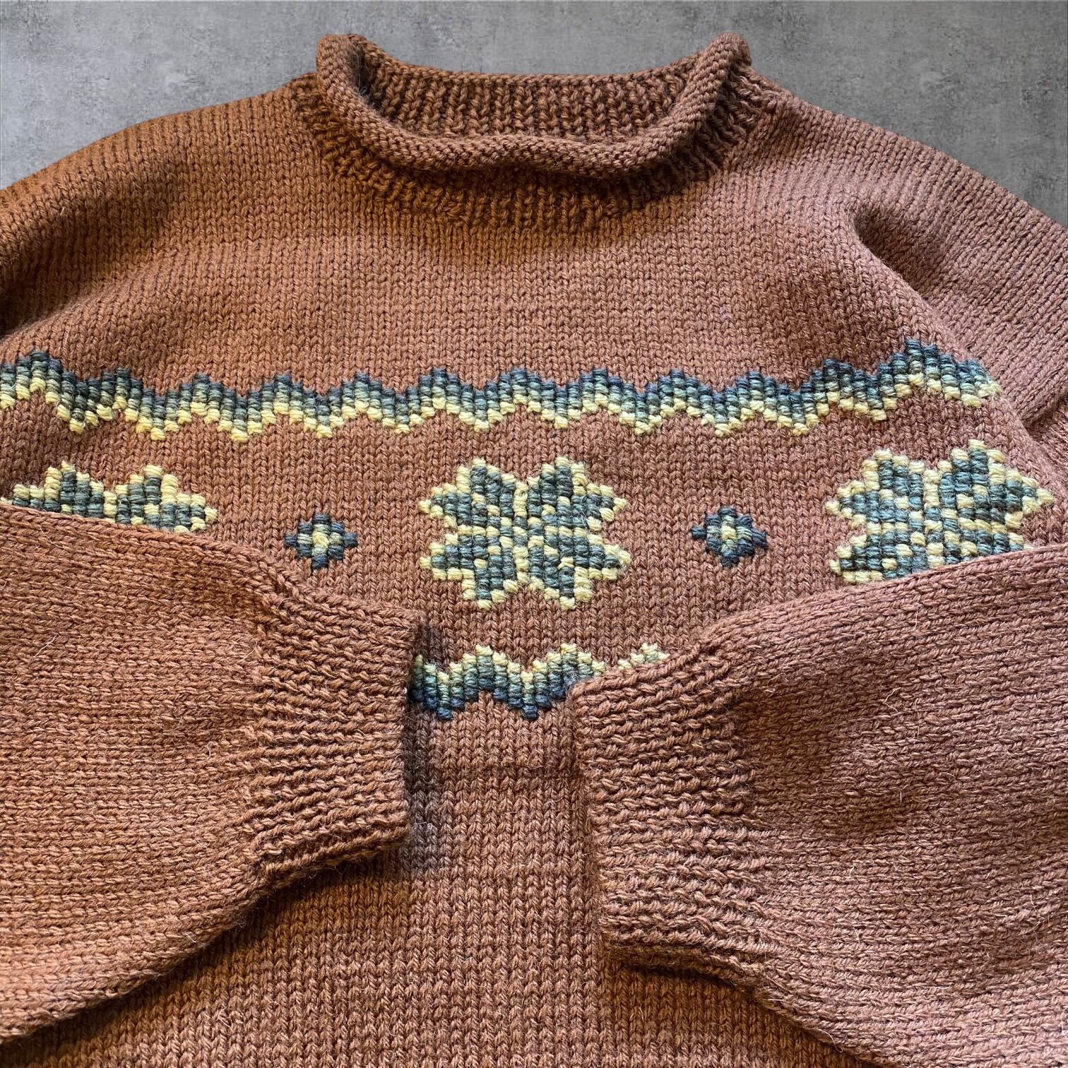温かみのあるブラウンベースに、幾何学的な柄が映えるウールニットです。