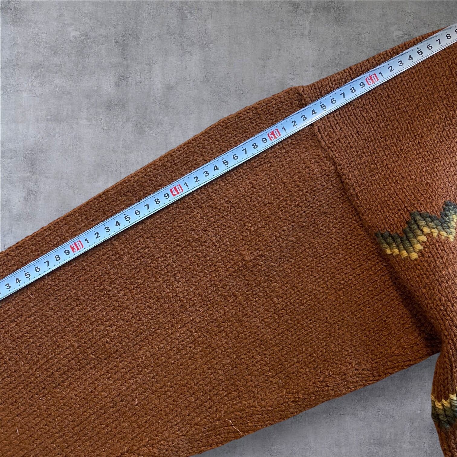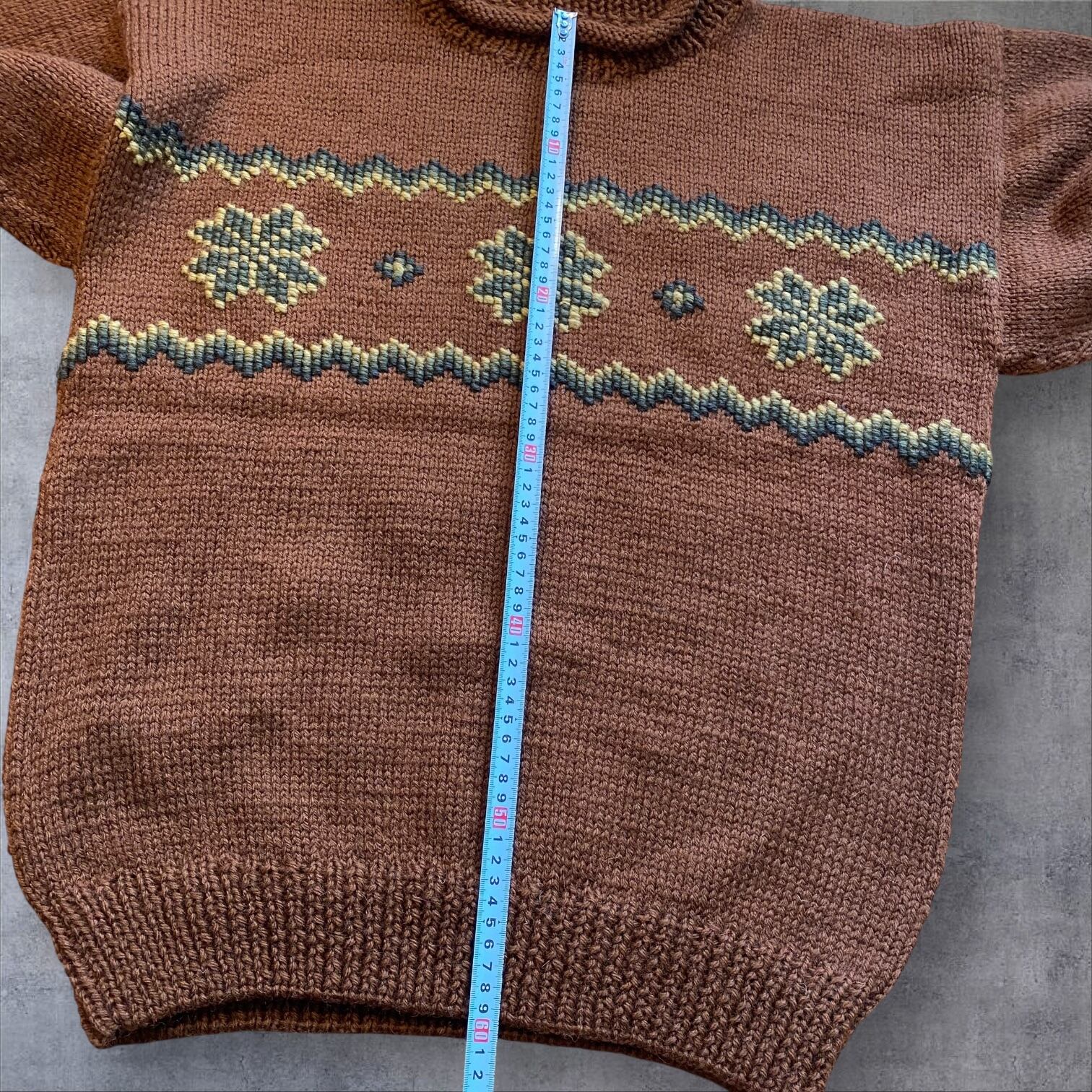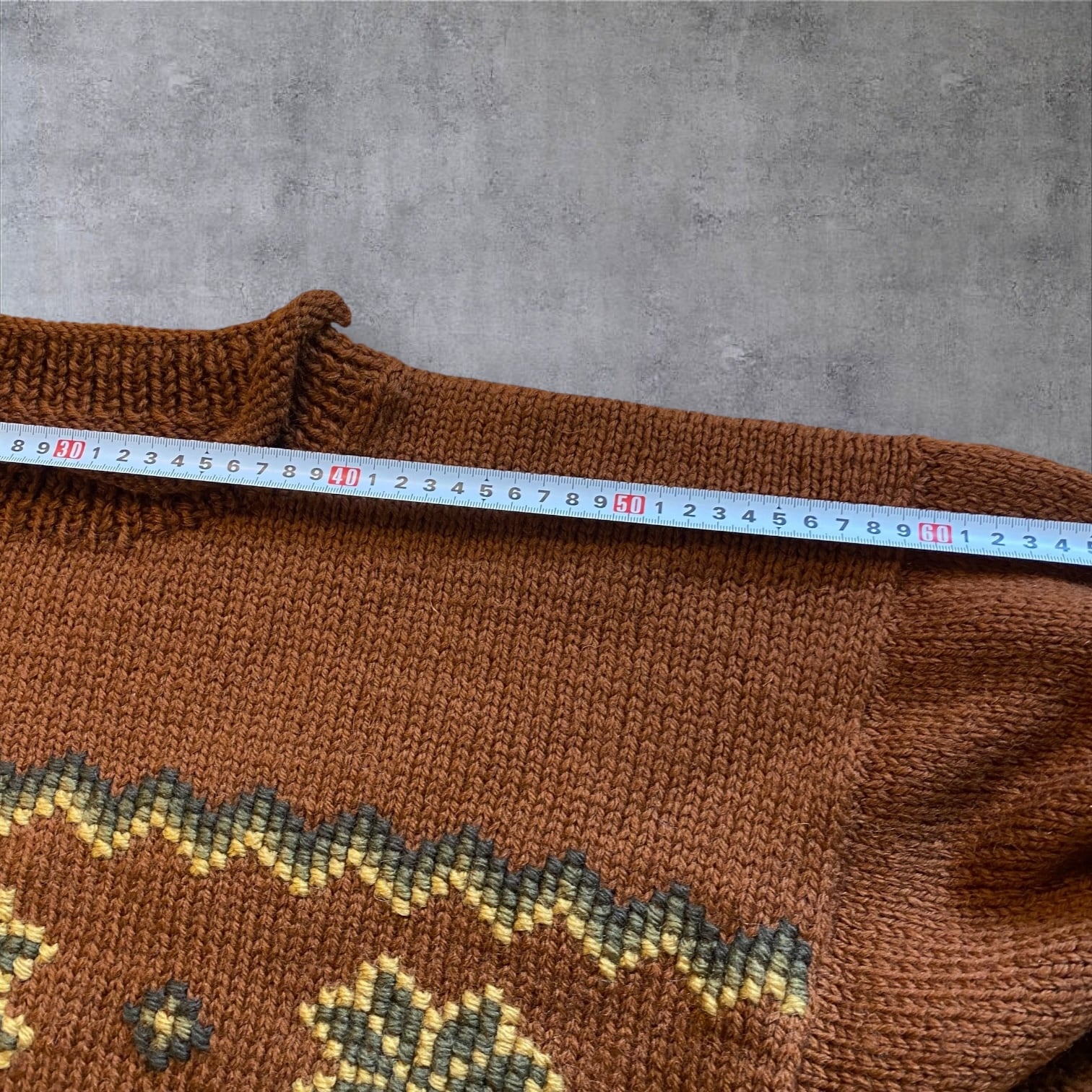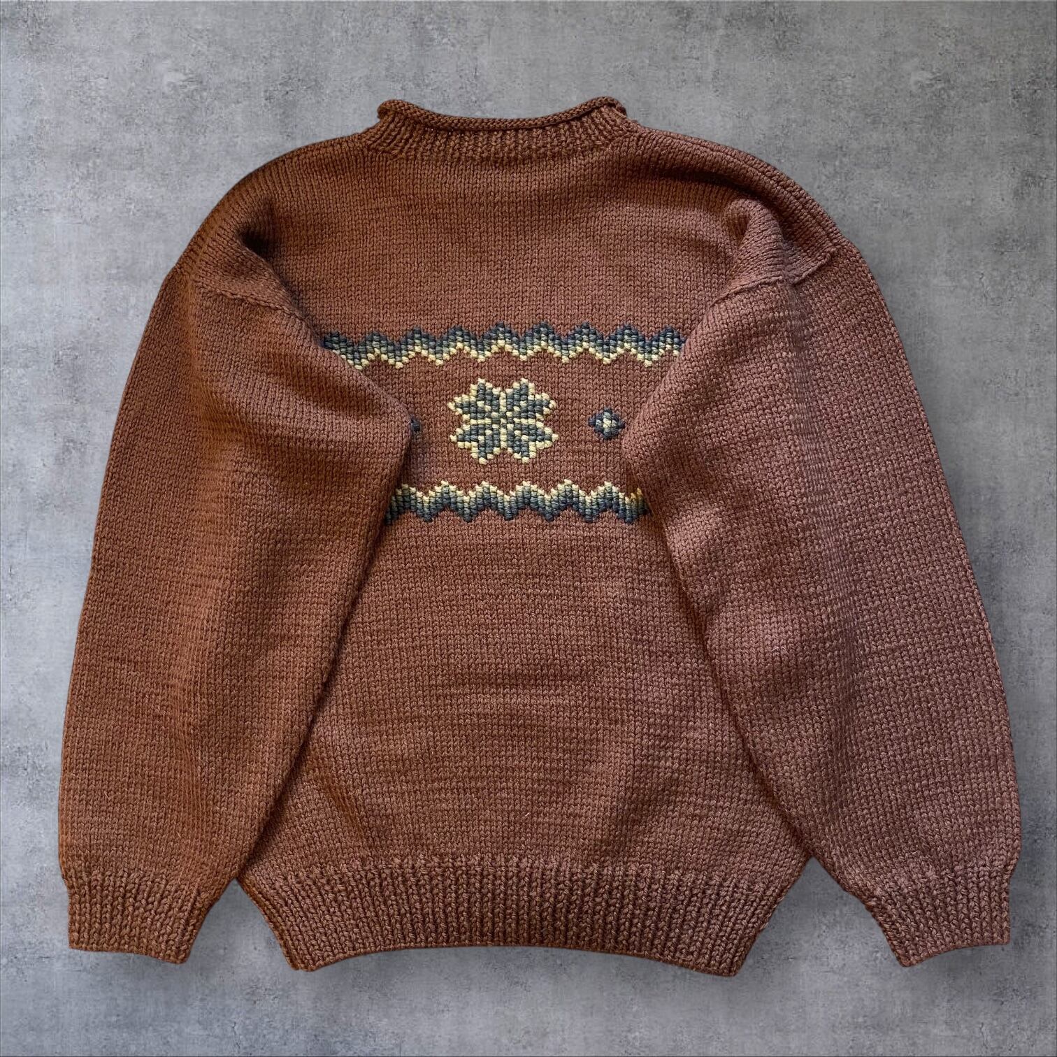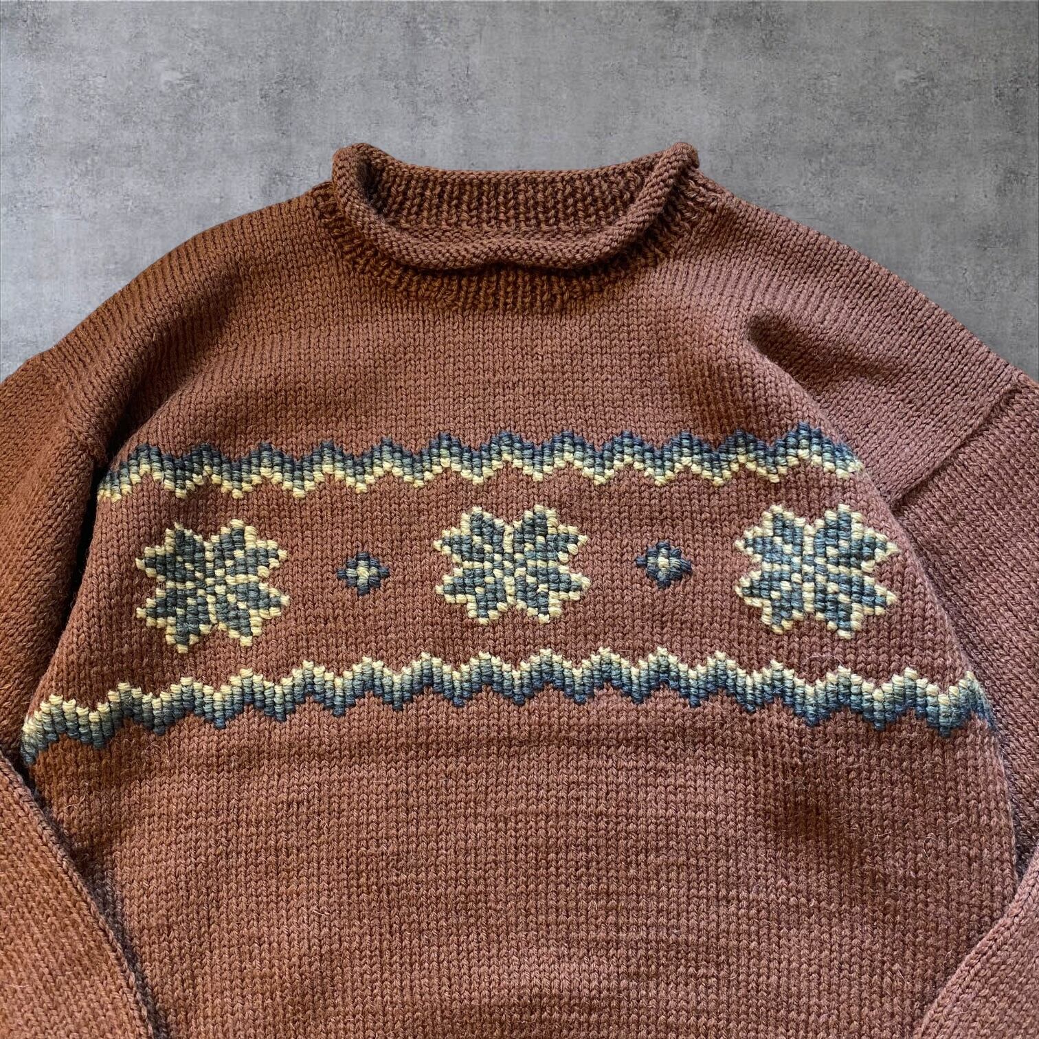 温かみのあるブラウンベースに、幾何学的な柄が映えるウールニットです。